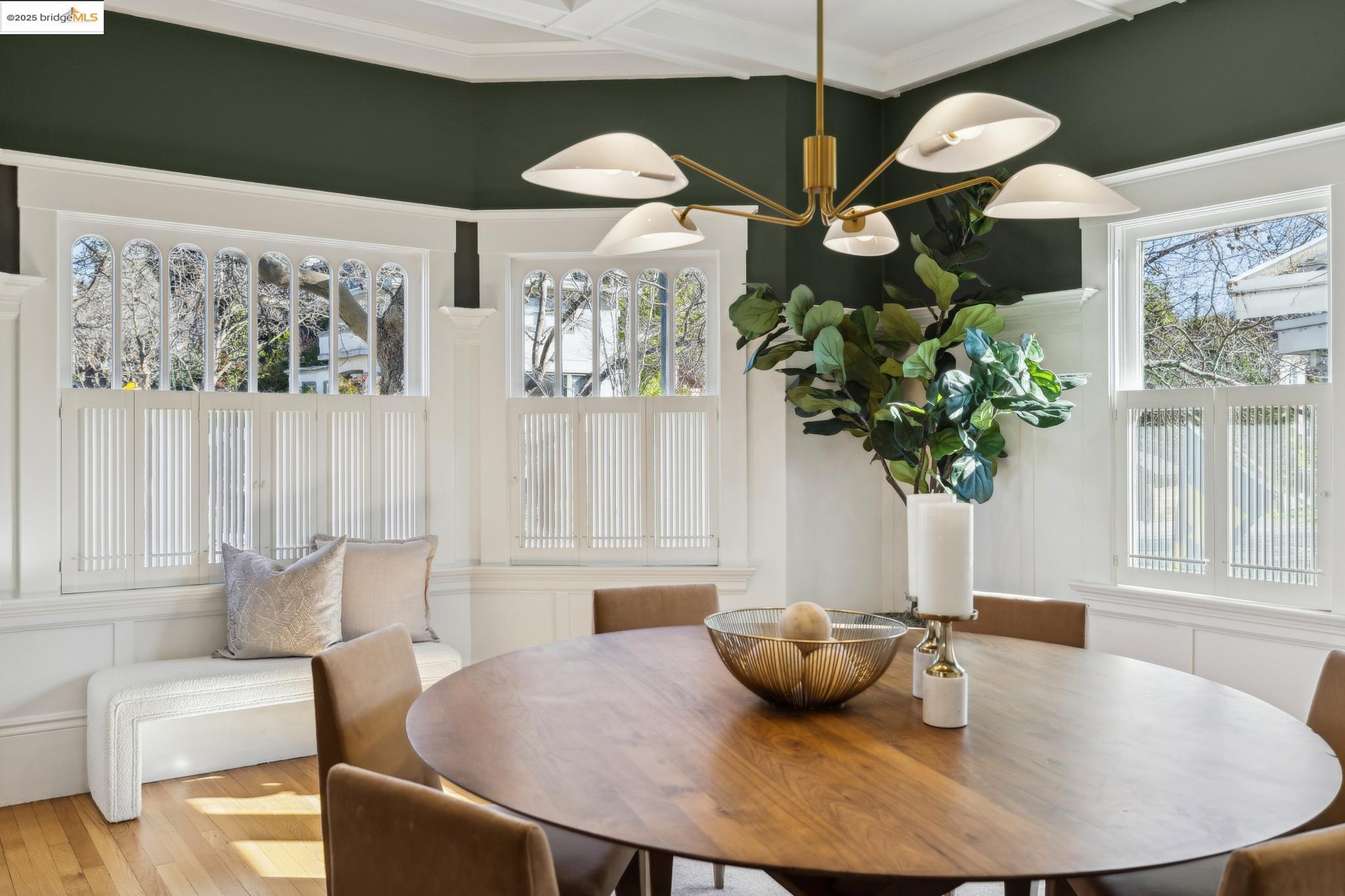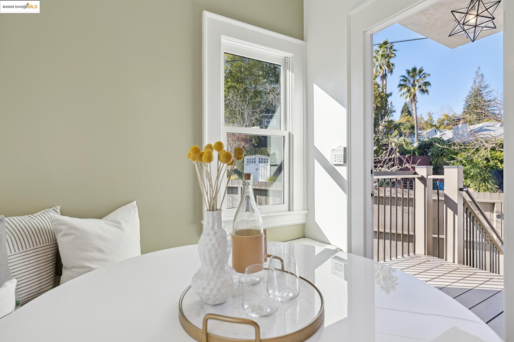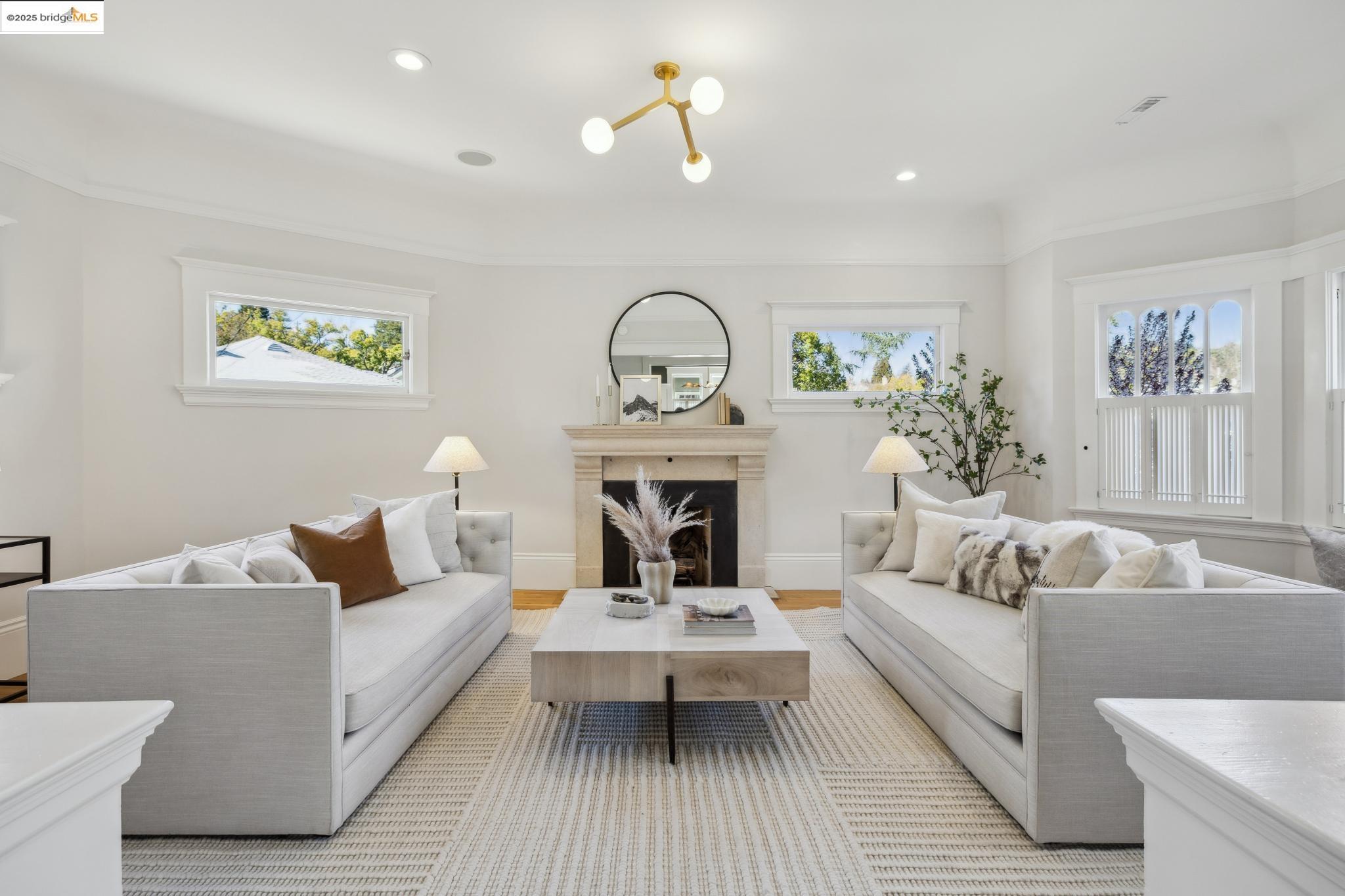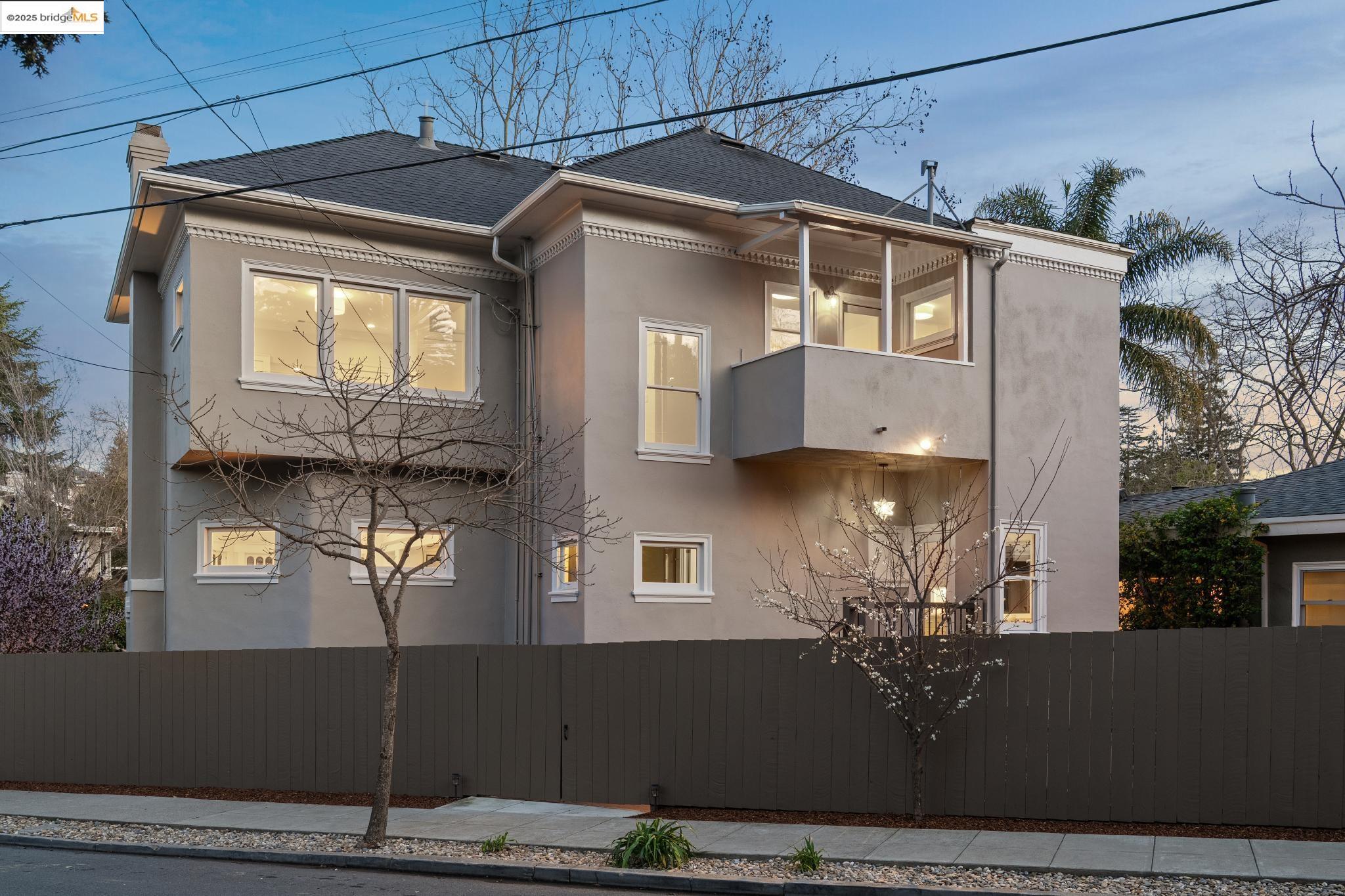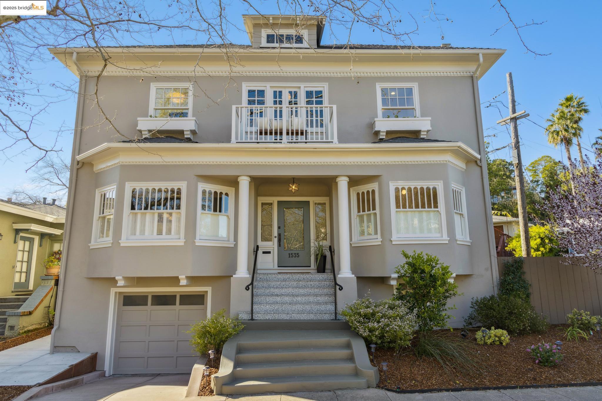 A true urban oasis, this gracious traditional has stately street presence and is sited on an open, light-filled corner lot close to schools, shops and restaurants. Warm and inviting, the foyer opens to a living room with high ceilings, arched windows and a distinguished fireplace. Windows on three sides ensure abundant natural light. The dining room is truly special, boasting the same charming arched windows, box-beam ceiling and beautiful period moldings. A large kitchen with stone countertops, a spacious island, and cabinet faced appliances is sleek and functional with ample storage and a sunny breakfast room with access to the backyard. A convenient powder room completes this floor. Four bedrooms upstairs include a large primary with ample closets and built-in seating, a sunny front room with French doors to a Juliet balcony, a spacious third bedroom and a tween sized sleeping room with access to a balcony overlooking the yard. An updated bathroom with double vanity completes this floor. The back and side yard are fully fenced for privacy with room to play and entertain. The garage & air conditioning add convenience and comfort to this lovely offering. Welcome to Piedmont!