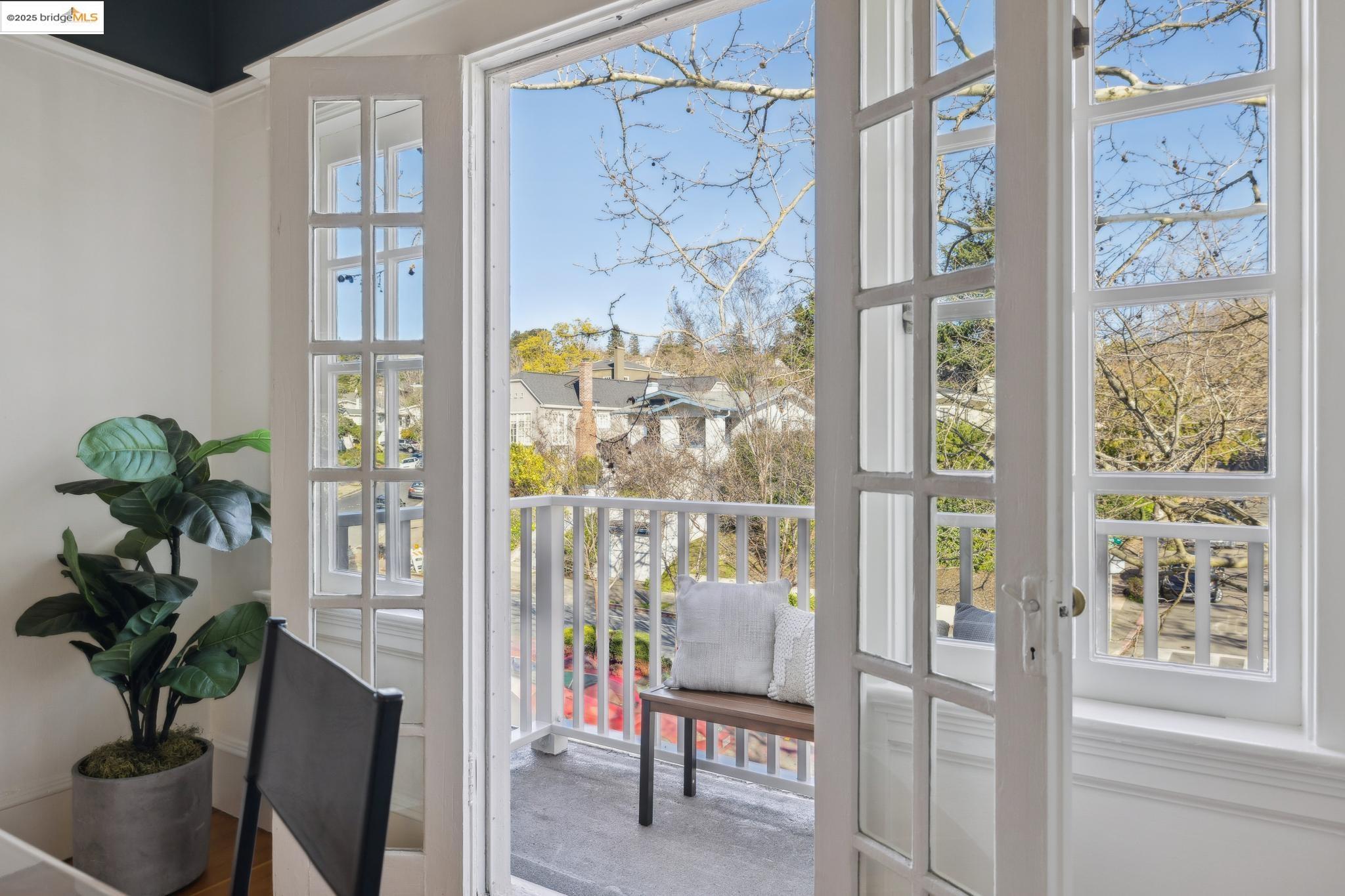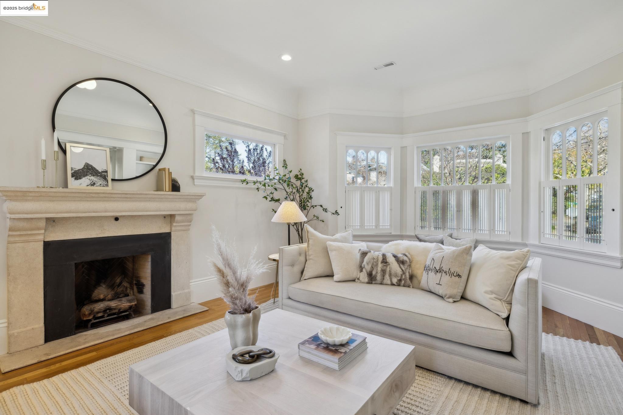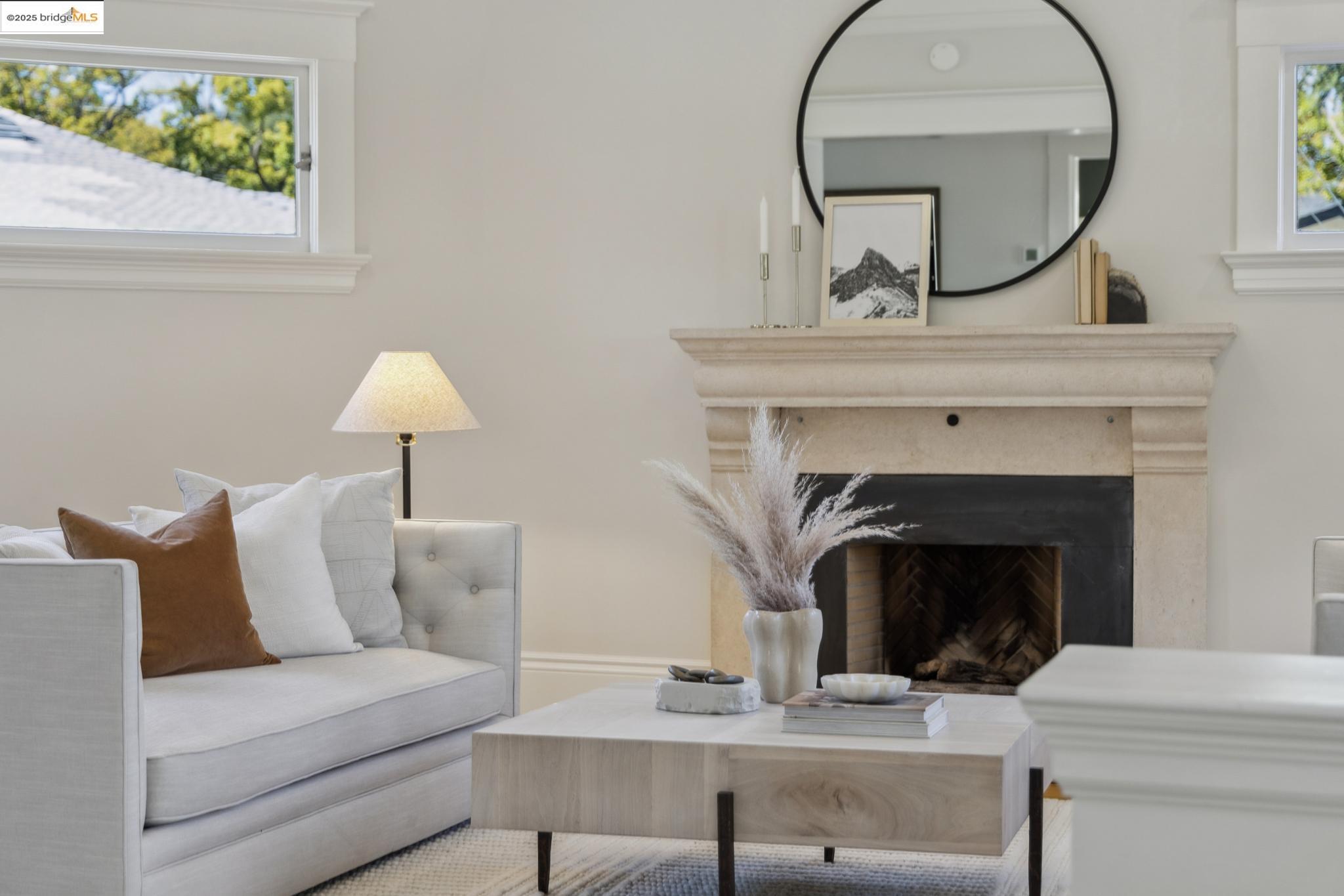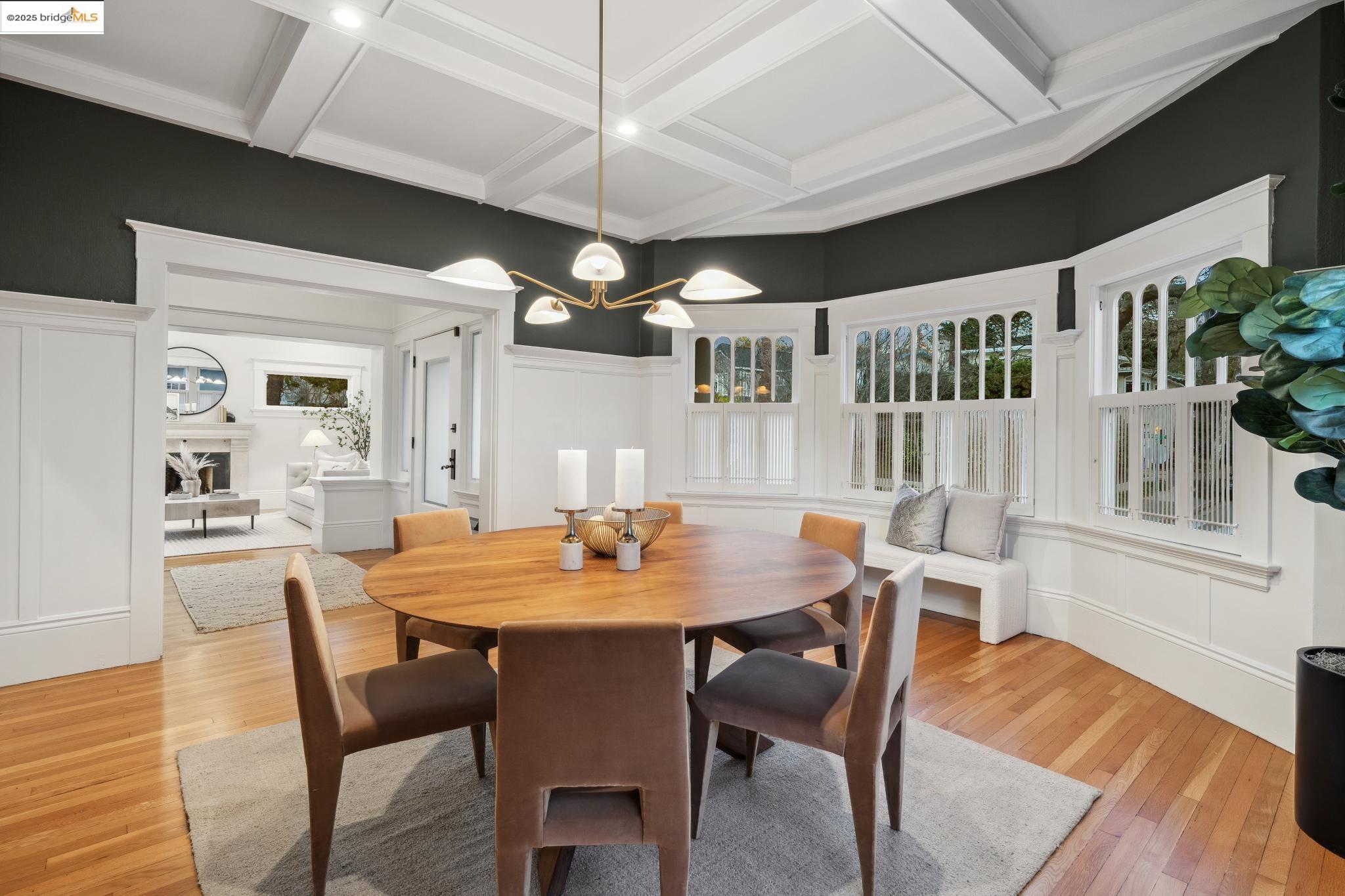 A true urban oasis, this gracious traditional has stately street presence and is sited on an open, light-filled corner lot close to schools, shops and restaurants. Warm and inviting, the foyer opens to a living room with high ceilings, arched windows and a distinguished fireplace. Windows on three sides ensure abundant natural light. The dining room is truly special, boasting the same charming arched windows, box-beam ceiling and beautiful period moldings. A large kitchen with stone countertops, a spacious island, and cabinet faced appliances is sleek and functional with ample storage and a sunny breakfast room with access to the backyard. A convenient powder room completes this floor. Four bedrooms upstairs include a large primary with ample closets and built-in seating, a sunny front room with French doors to a Juliet balcony, a spacious third bedroom and a tween sized sleeping room with access to a balcony overlooking the yard. An updated bathroom with double vanity completes this floor. The back and side yard are fully fenced for privacy with room to play and entertain. The garage & air conditioning add convenience and comfort to this lovely offering. Welcome to Piedmont!