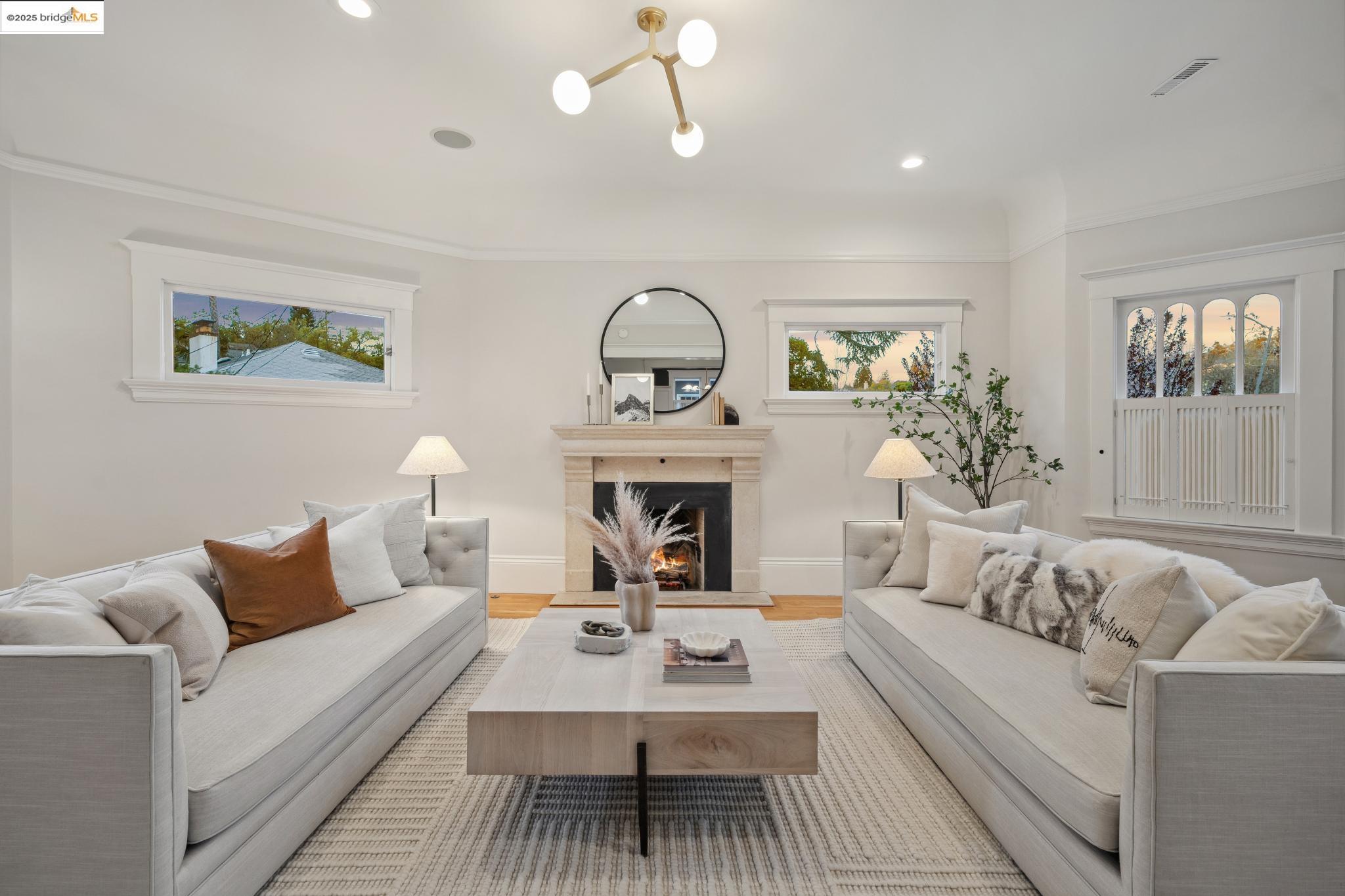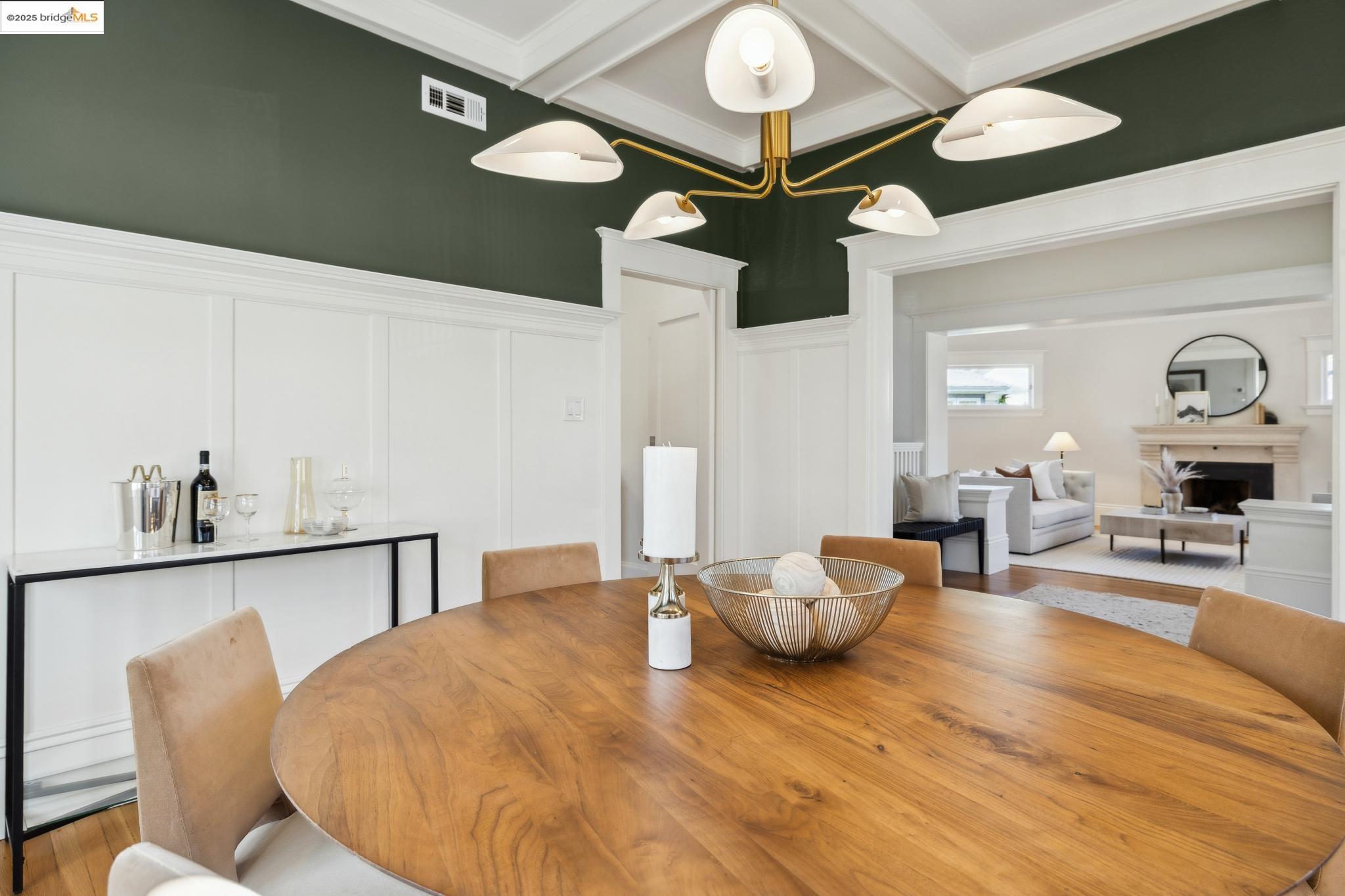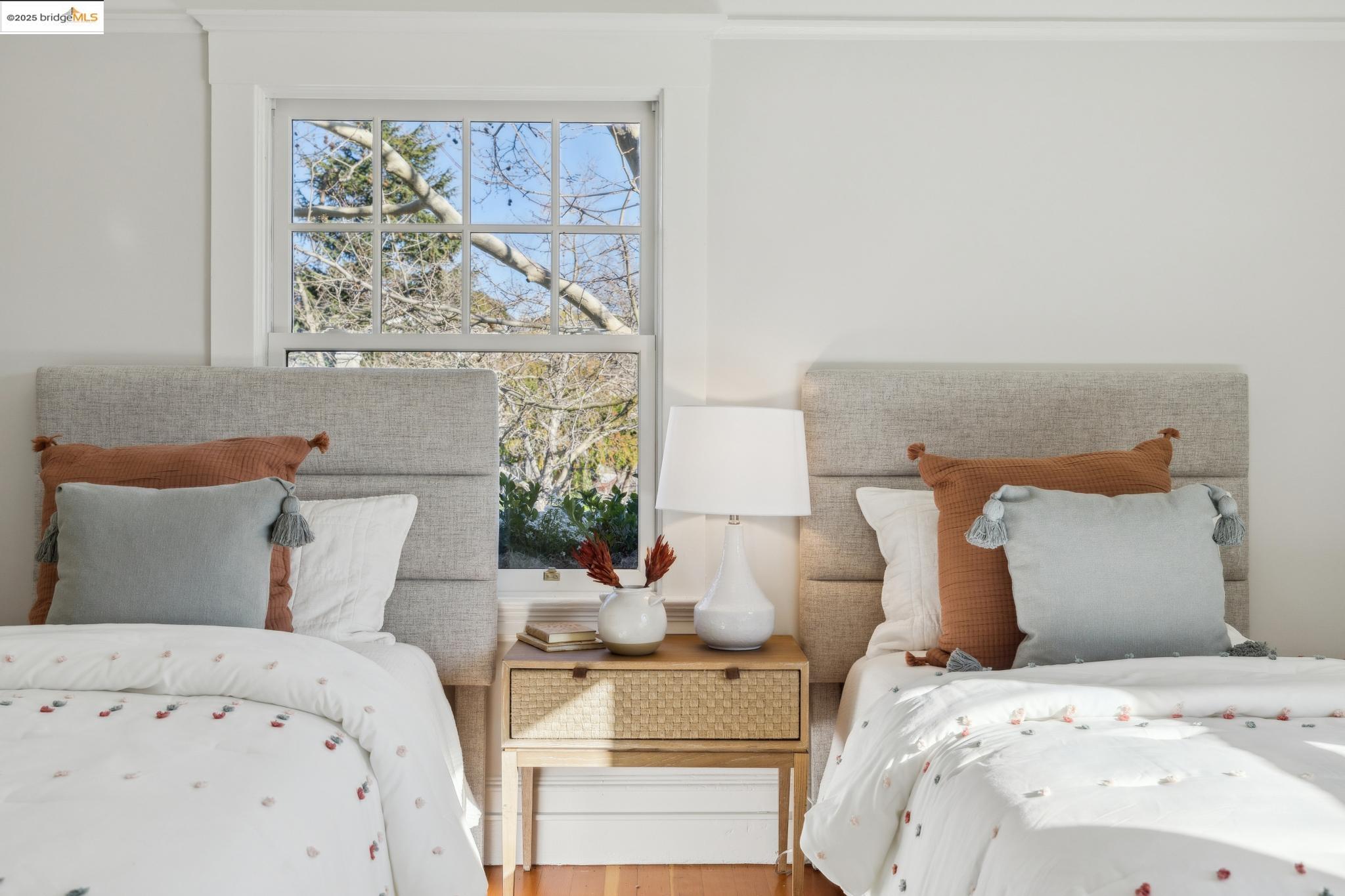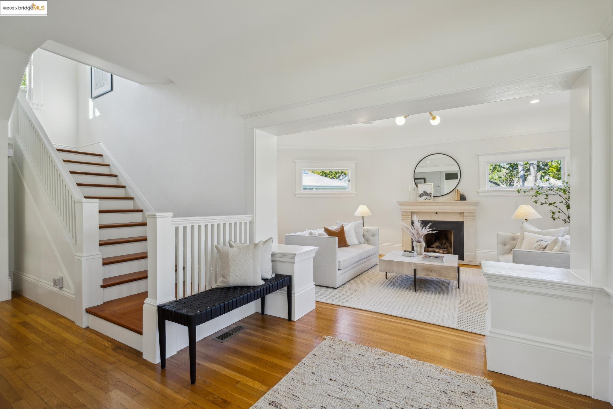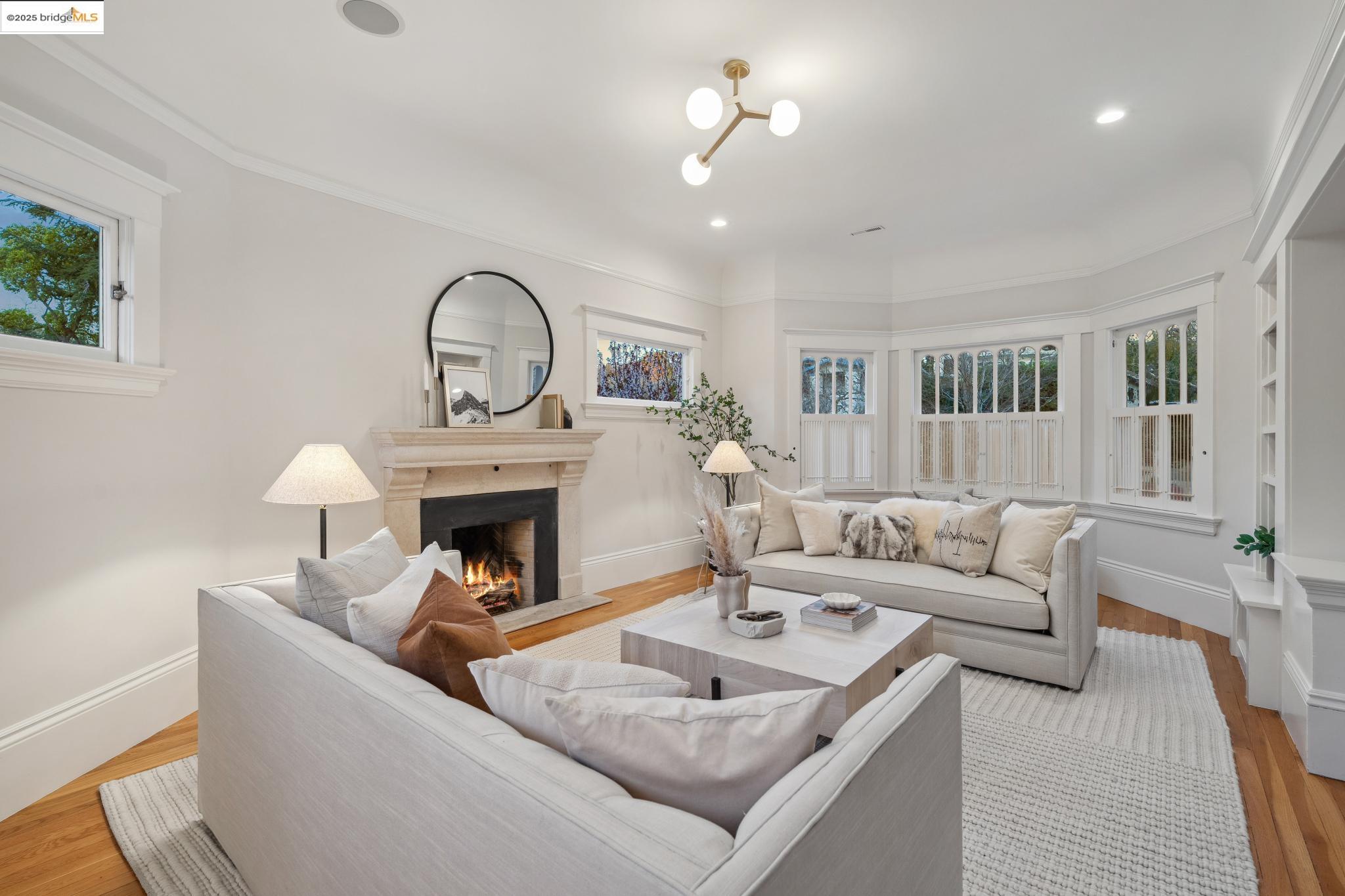 A true urban oasis, this gracious traditional has stately street presence and is sited on an open, light-filled corner lot close to schools, shops and restaurants. Warm and inviting, the foyer opens to a living room with high ceilings, arched windows and a distinguished fireplace. Windows on three sides ensure abundant natural light. The dining room is truly special, boasting the same charming arched windows, box-beam ceiling and beautiful period moldings. A large kitchen with stone countertops, a spacious island, and cabinet faced appliances is sleek and functional with ample storage and a sunny breakfast room with access to the backyard. A convenient powder room completes this floor. Four bedrooms upstairs include a large primary with ample closets and built-in seating, a sunny front room with French doors to a Juliet balcony, a spacious third bedroom and a tween sized sleeping room with access to a balcony overlooking the yard. An updated bathroom with double vanity completes this floor. The back and side yard are fully fenced for privacy with room to play and entertain. The garage & air conditioning add convenience and comfort to this lovely offering. Welcome to Piedmont!