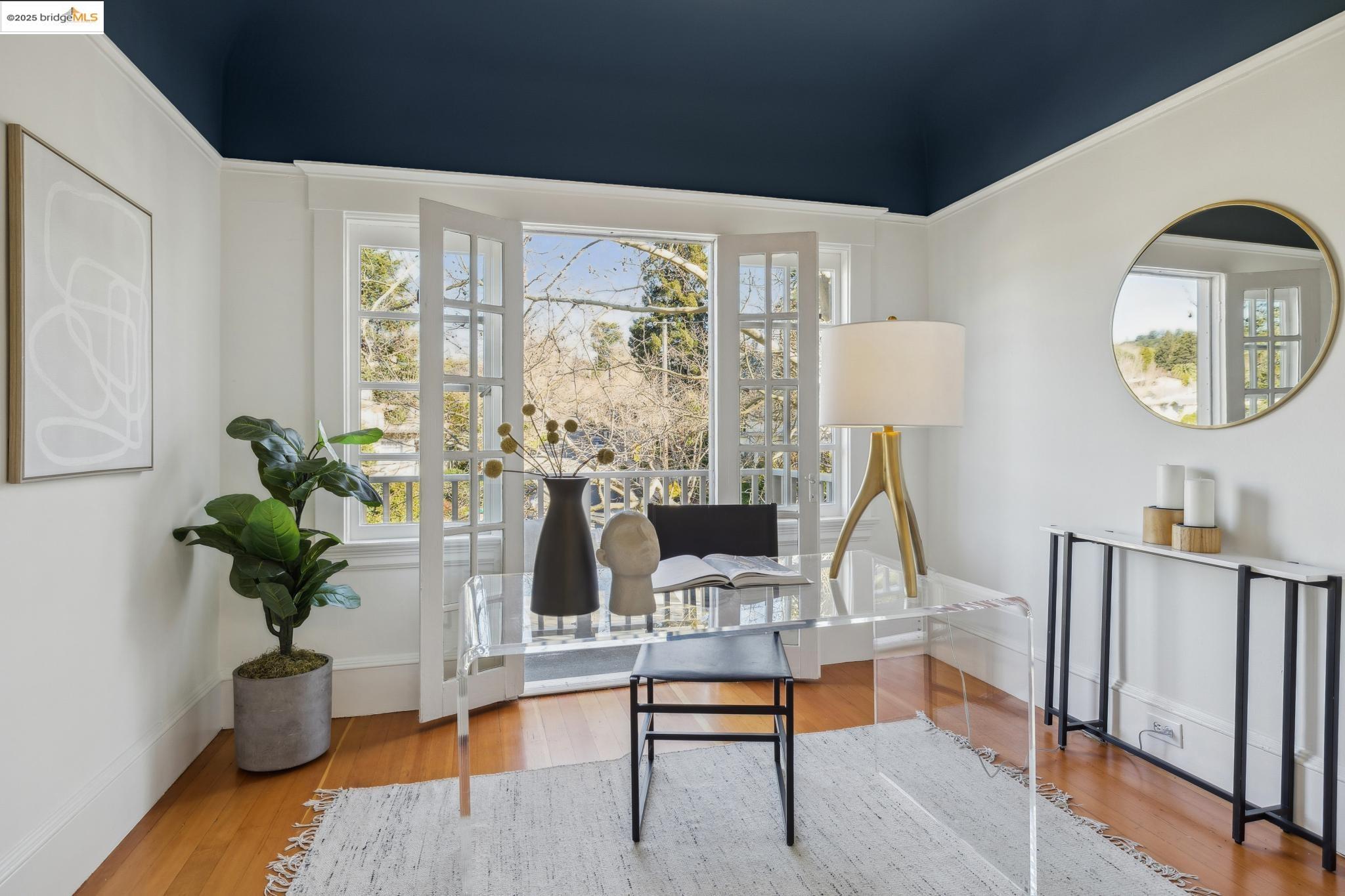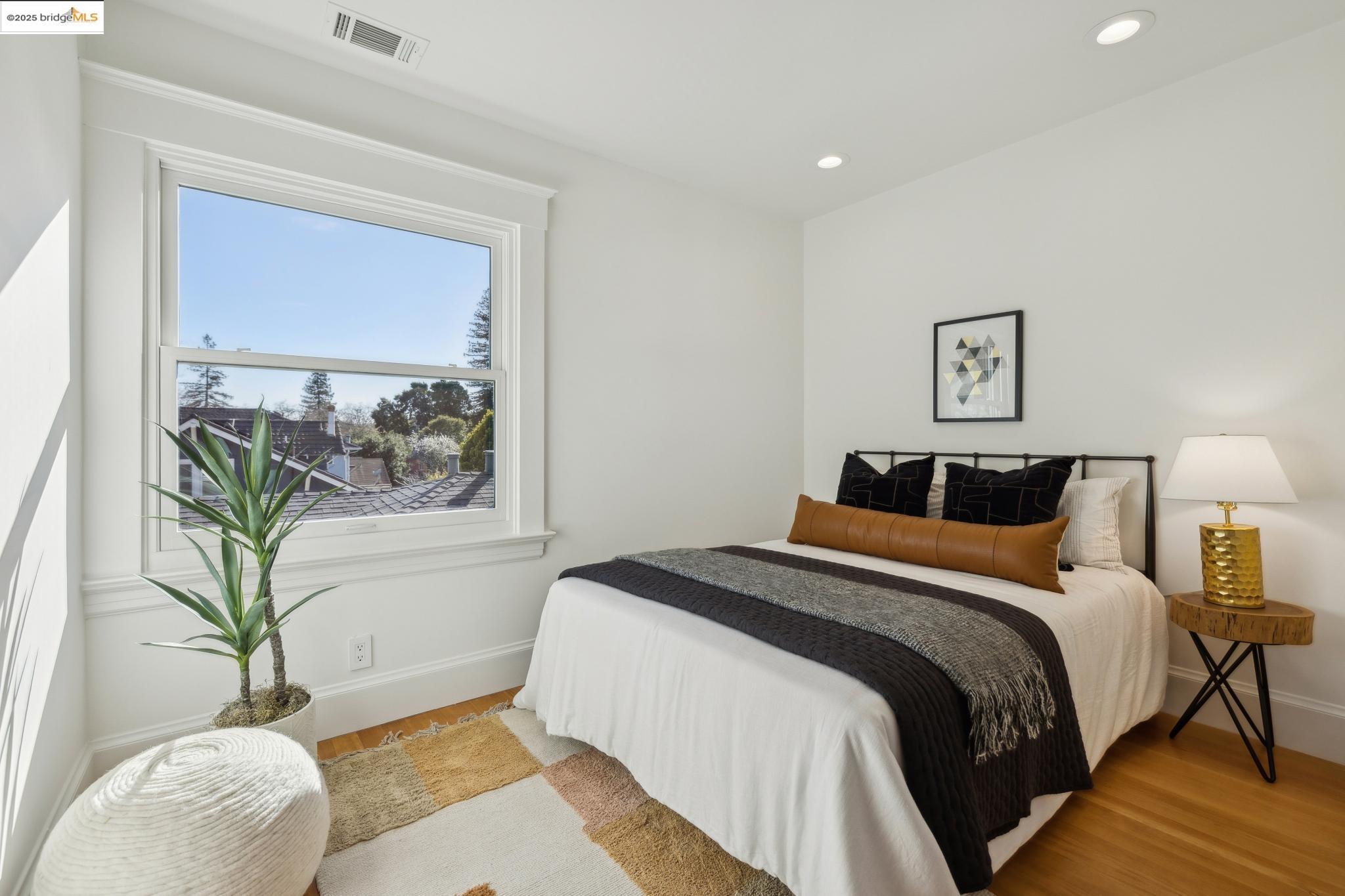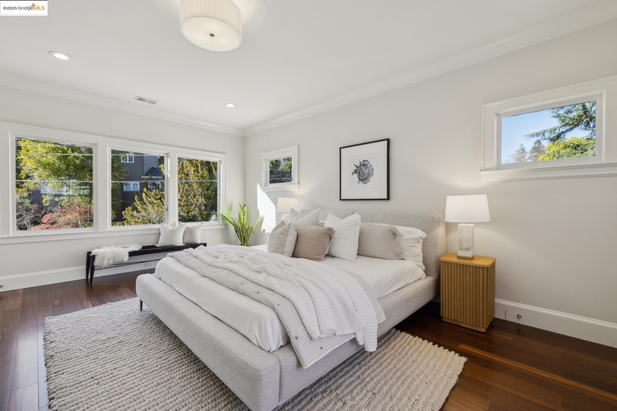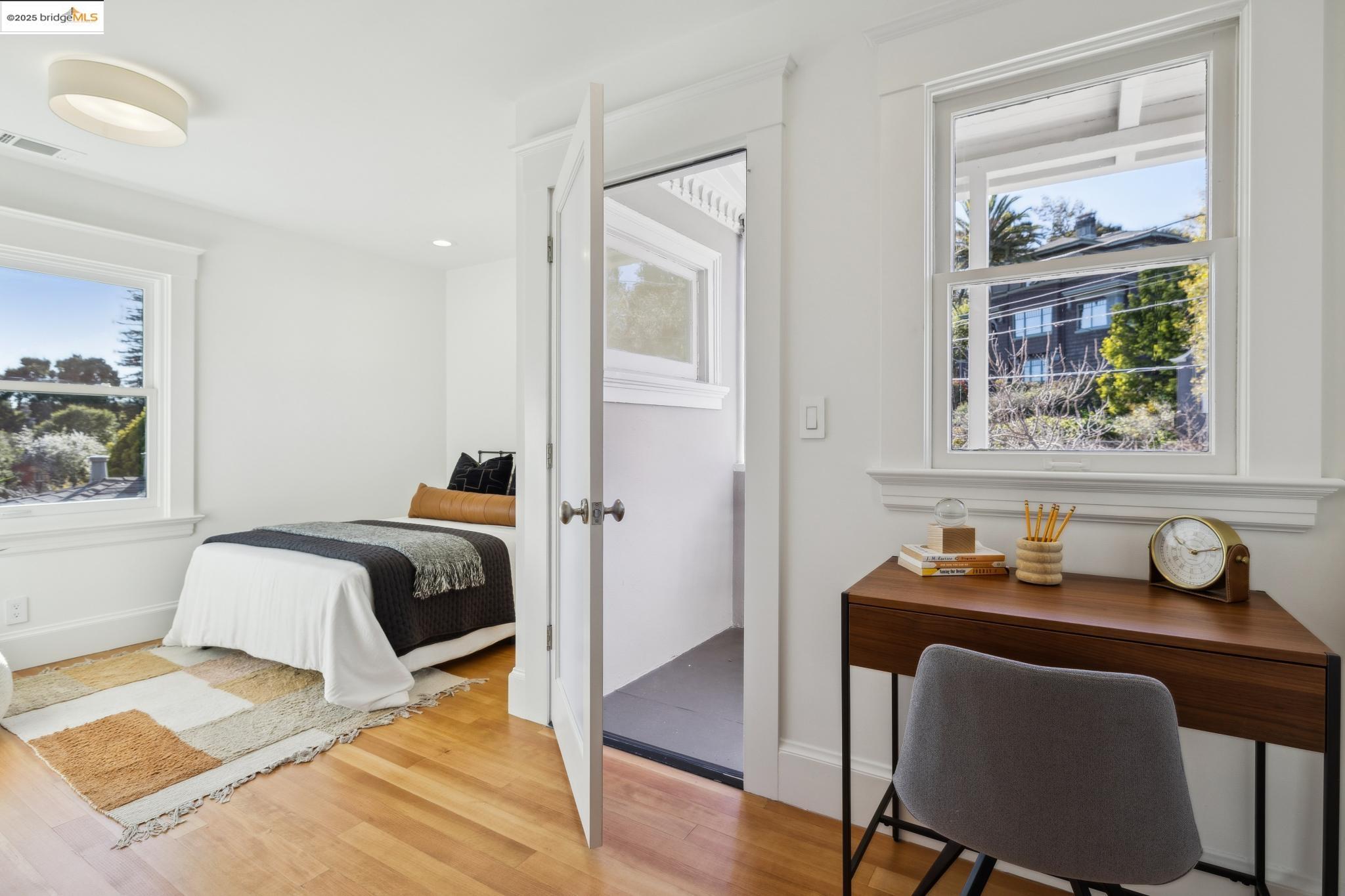 A true urban oasis, this gracious traditional has stately street presence and is sited on an open, light-filled corner lot close to schools, shops and restaurants. Warm and inviting, the foyer opens to a living room with high ceilings, arched windows and a distinguished fireplace. Windows on three sides ensure abundant natural light. The dining room is truly special, boasting the same charming arched windows, box-beam ceiling and beautiful period moldings. A large kitchen with stone countertops, a spacious island, and cabinet faced appliances is sleek and functional with ample storage and a sunny breakfast room with access to the backyard. A convenient powder room completes this floor. Four bedrooms upstairs include a large primary with ample closets and built-in seating, a sunny front room with French doors to a Juliet balcony, a spacious third bedroom and a tween sized sleeping room with access to a balcony overlooking the yard. An updated bathroom with double vanity completes this floor. The back and side yard are fully fenced for privacy with room to play and entertain. The garage & air conditioning add convenience and comfort to this lovely offering. Welcome to Piedmont!
