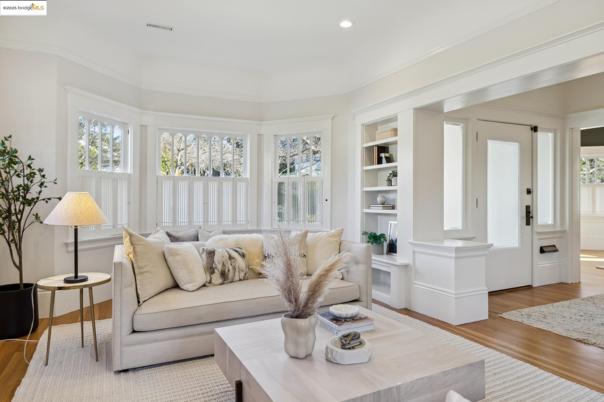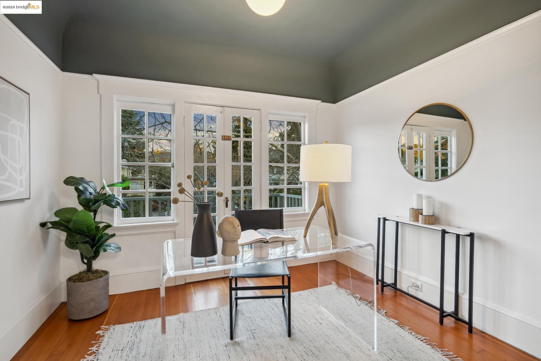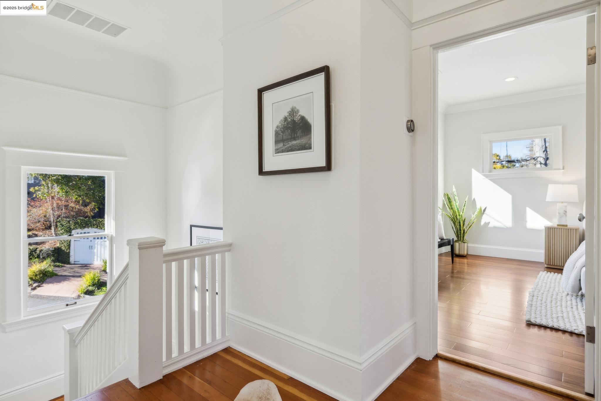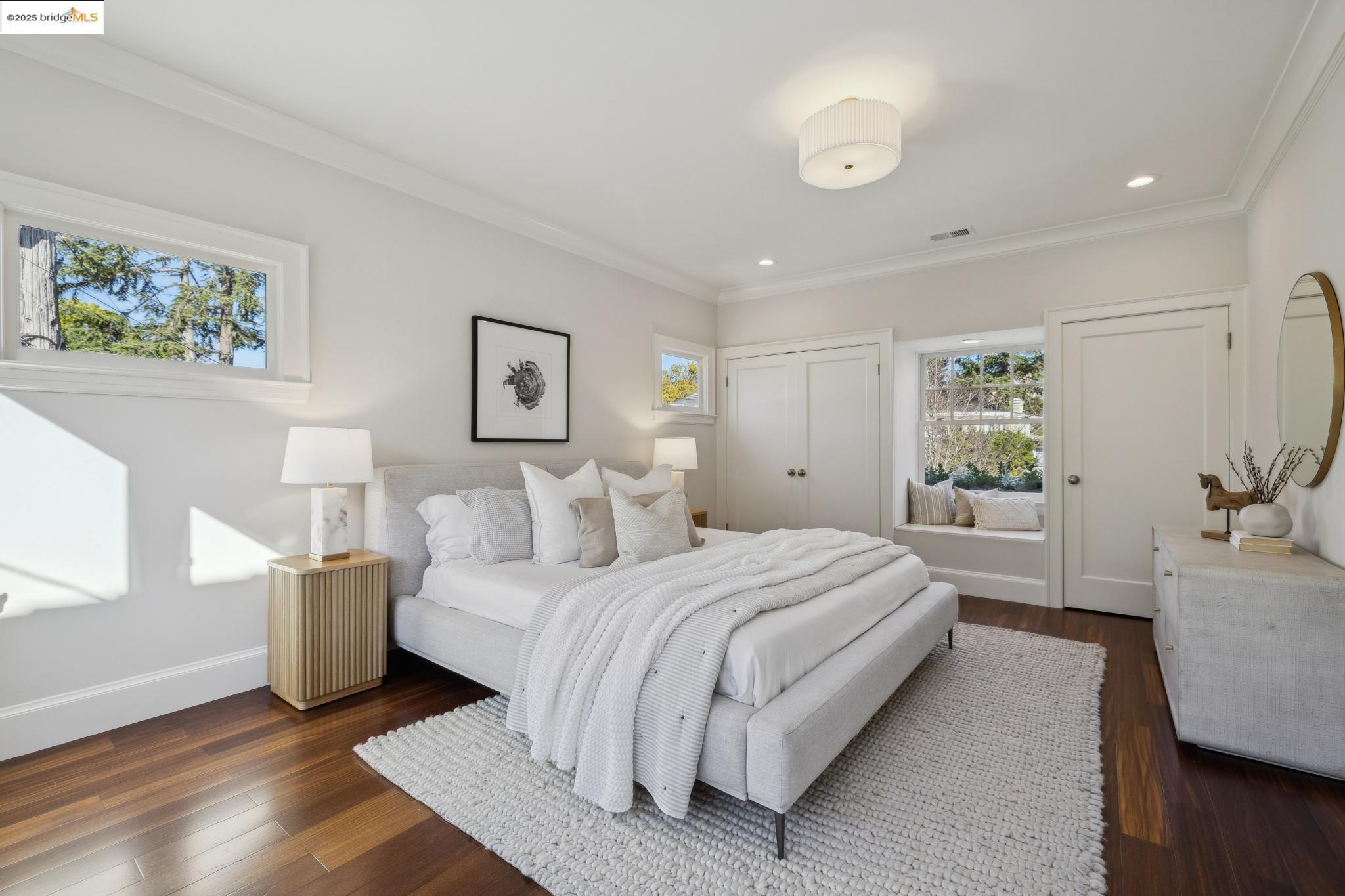 A true urban oasis, this gracious traditional has stately street presence and is sited on an open, light-filled corner lot close to schools, shops and restaurants. Warm and inviting, the foyer opens to a living room with high ceilings, arched windows and a distinguished fireplace. Windows on three sides ensure abundant natural light. The dining room is truly special, boasting the same charming arched windows, box-beam ceiling and beautiful period moldings. A large kitchen with stone countertops, a spacious island, and cabinet faced appliances is sleek and functional with ample storage and a sunny breakfast room with access to the backyard. A convenient powder room completes this floor. Four bedrooms upstairs include a large primary with ample closets and built-in seating, a sunny front room with French doors to a Juliet balcony, a spacious third bedroom and a tween sized sleeping room with access to a balcony overlooking the yard. An updated bathroom with double vanity completes this floor. The back and side yard are fully fenced for privacy with room to play and entertain. The garage & air conditioning add convenience and comfort to this lovely offering. Welcome to Piedmont!