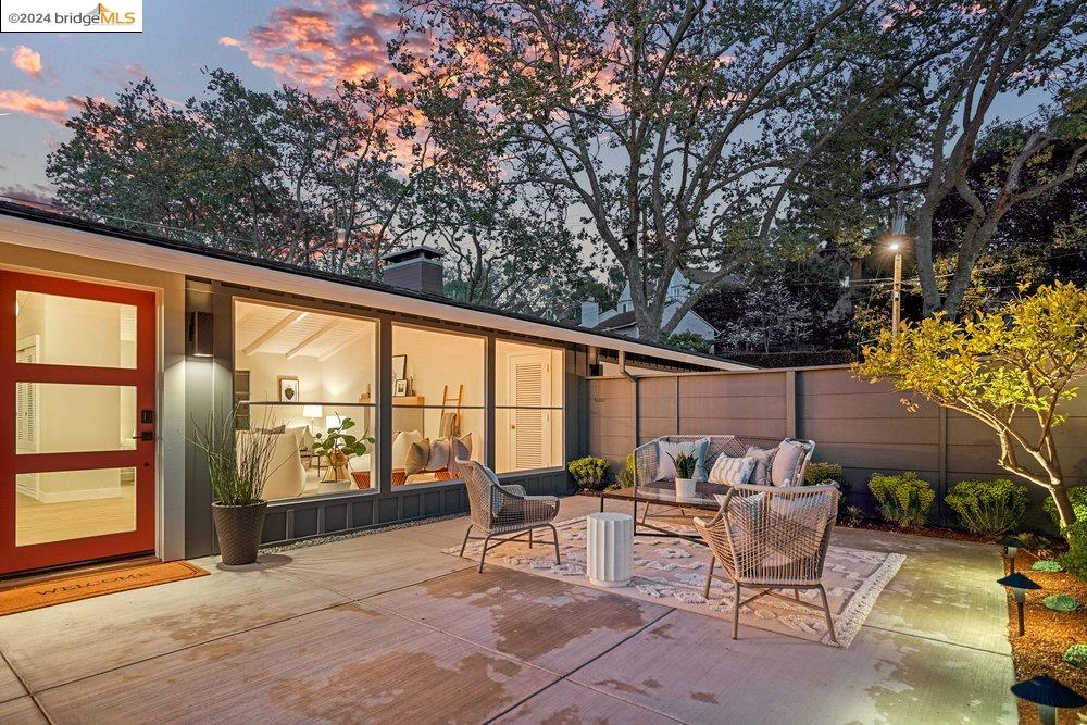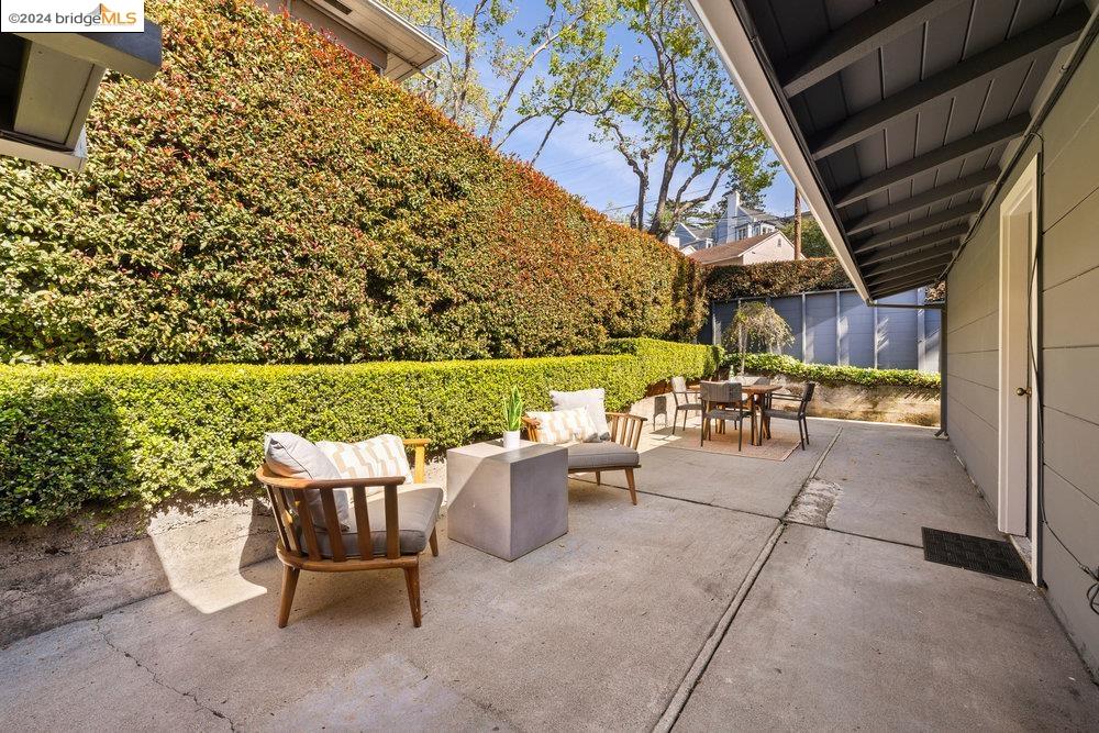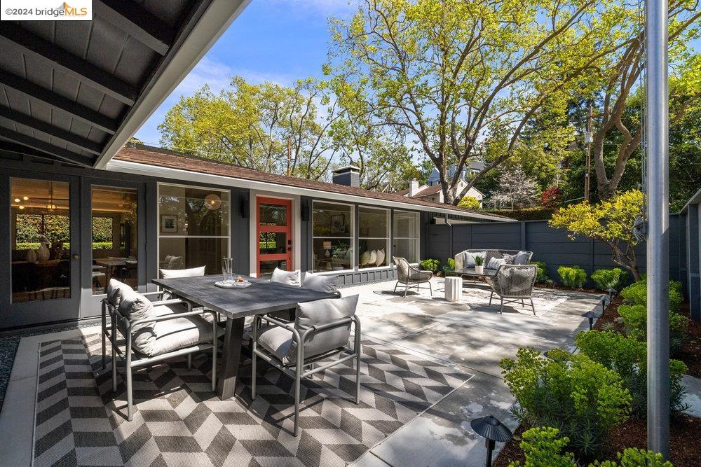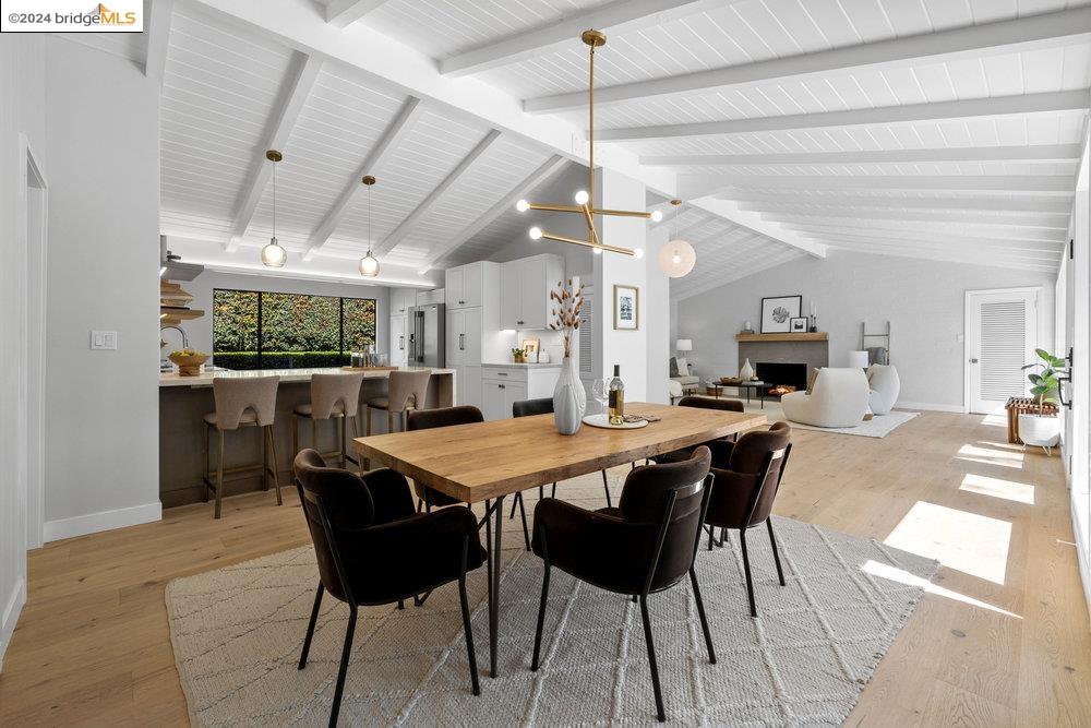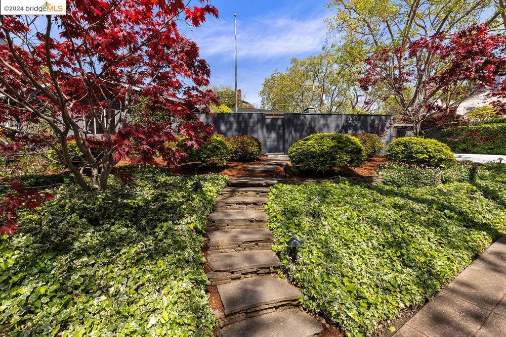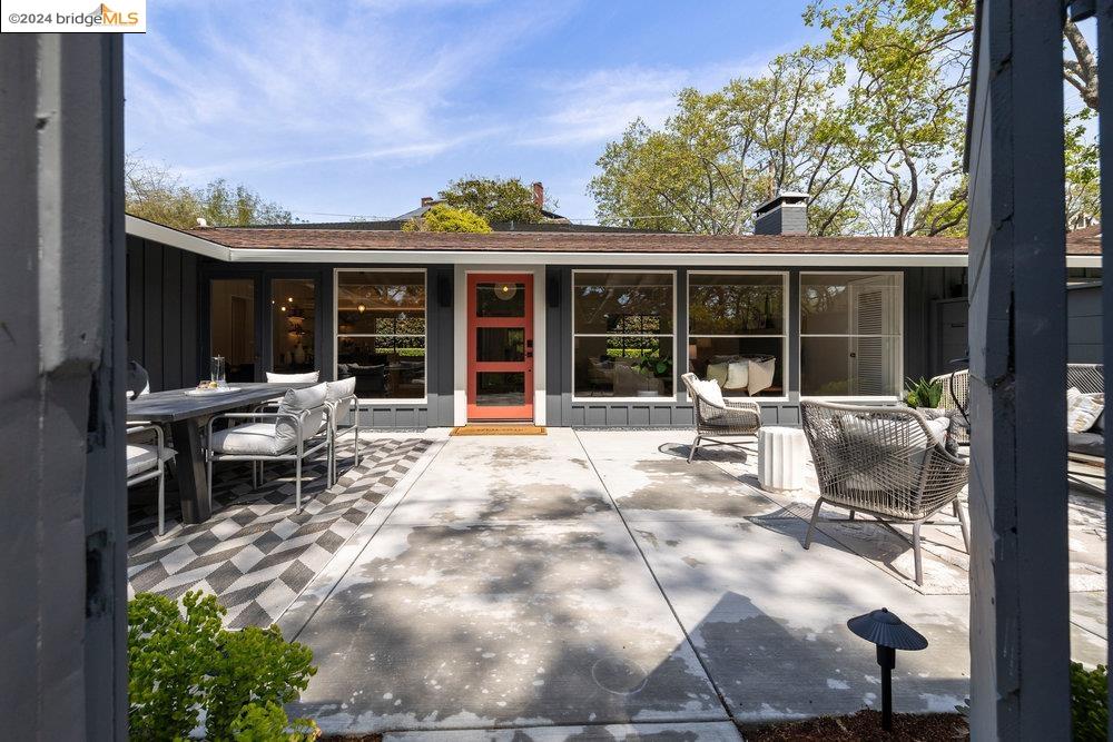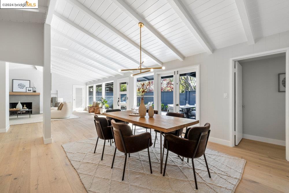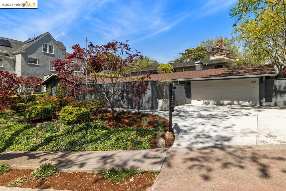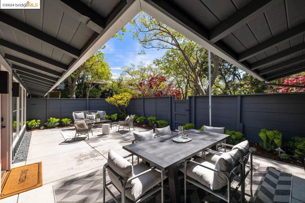 Stylish and unassuming, 160 Dracena Avenue offers all-level living on a beautiful tree-lined street near the center of Piedmont. The enclosed front courtyard and wall of windows blur the line between indoors and out. Vaulted wood ceilings create visual interest and a sense of expansiveness in the home. New wide-plank white oak floors run throughout the living spaces for a breezy, modern look. The open kitchen features new cabinetry, honed quartzite countertops, an induction range, floating shelves, and a double pantry. The dining area opens directly to the front patio, making it a wonderful place to entertain. A cozy fireplace with new tile surround and mantle anchors the open living room. Two bedrooms share a newly renovated bathroom just off the main living space. The primary suite provides a peaceful getaway with a newly renovated bathroom and views of the front garden. The attached two-car garage seals the deal for easy living in this exceptional mid-century home. Once you leave the front door, you will find yourself directly across from serene Dracena Park and a short stroll to top-rated schools, Mulberry's Market, the Piedmont Center for the Arts, sport courts, and more - welcome home!