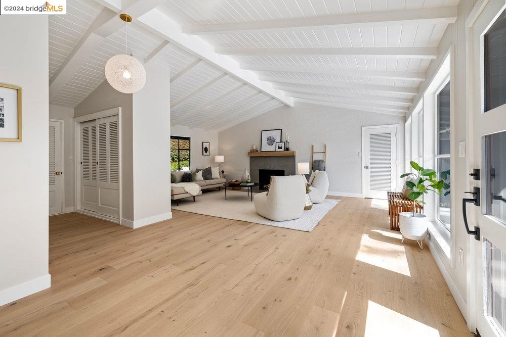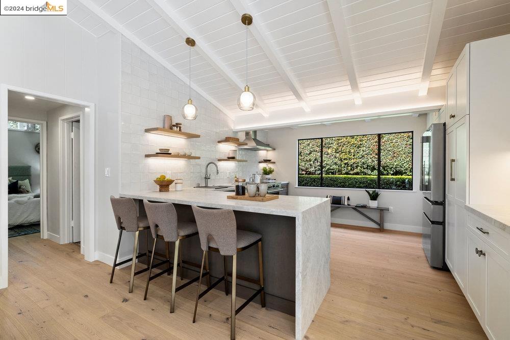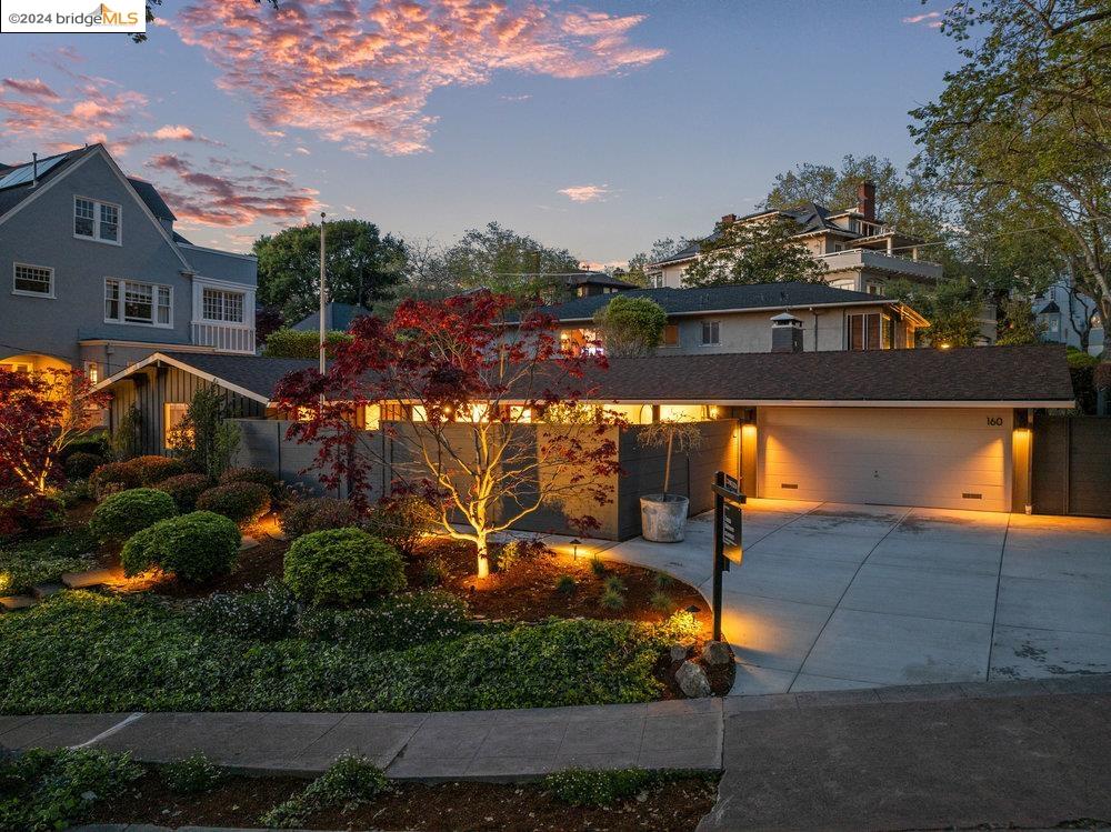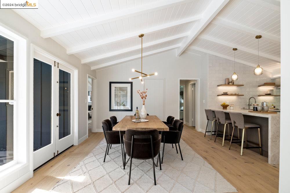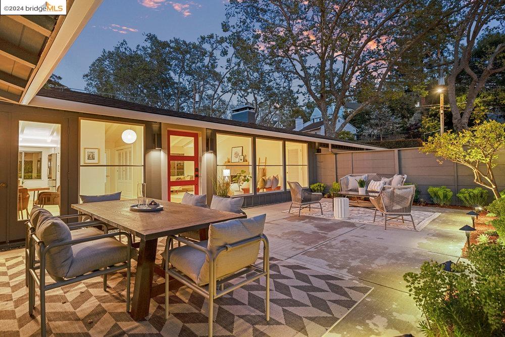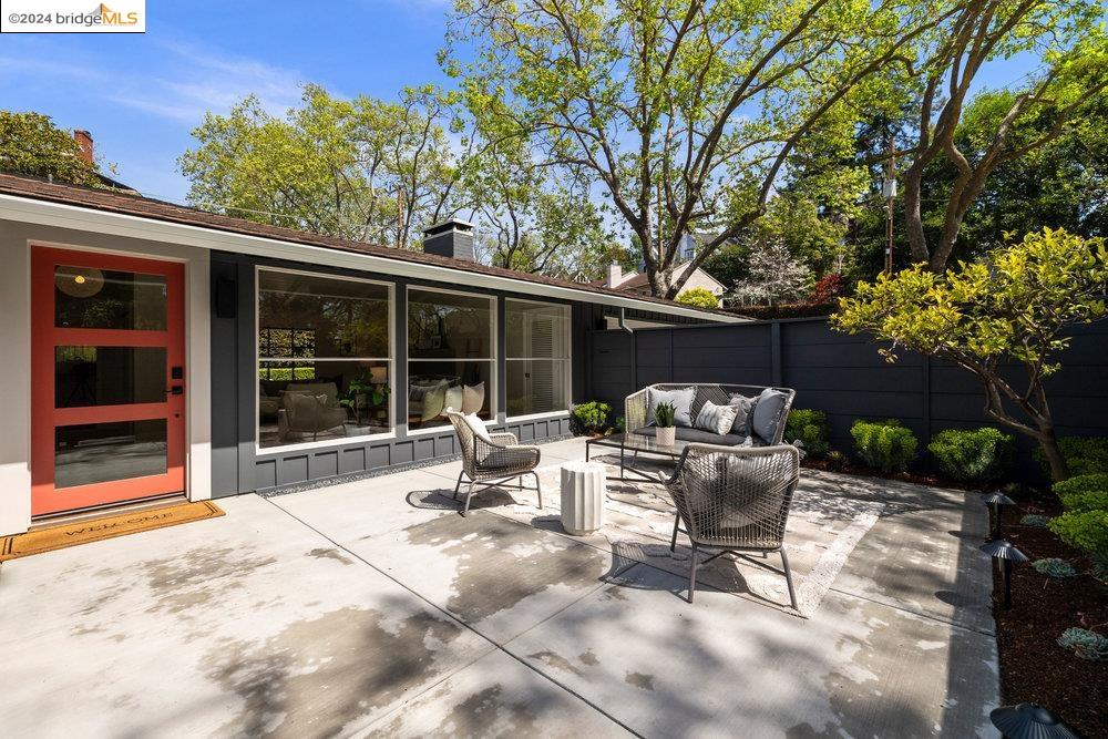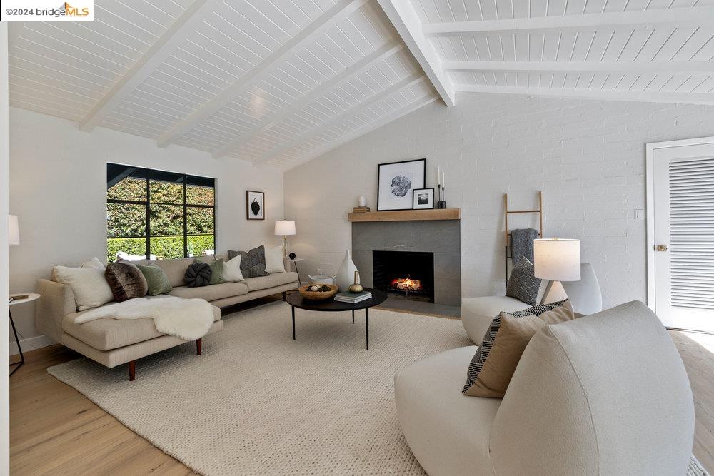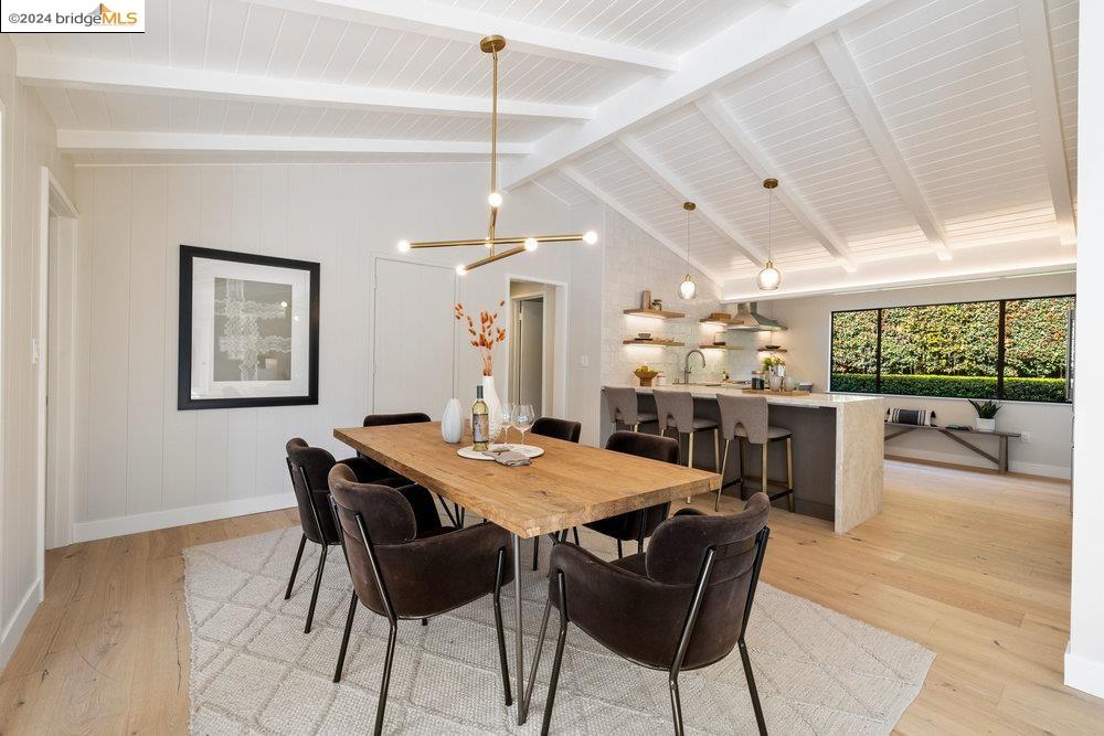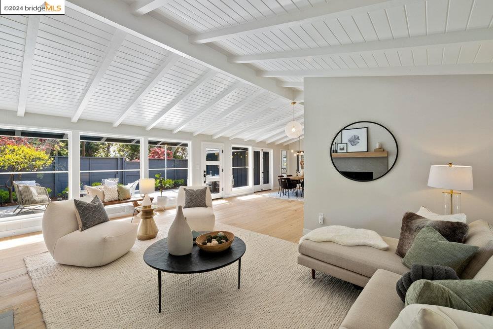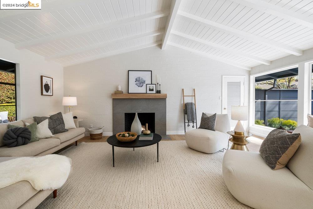Stylish and unassuming, 160 Dracena Avenue offers all-level living on a beautiful tree-lined street near the center of Piedmont. The enclosed front courtyard and wall of windows blur the line between indoors and out. Vaulted wood ceilings create visual interest and a sense of expansiveness in the home. New wide-plank white oak floors run throughout the living spaces for a breezy, modern look. The open kitchen features new cabinetry, honed quartzite countertops, an induction range, floating shelves, and a double pantry. The dining area opens directly to the front patio, making it a wonderful place to entertain. A cozy fireplace with new tile surround and mantle anchors the open living room. Two bedrooms share a newly renovated bathroom just off the main living space. The primary suite provides a peaceful getaway with a newly renovated bathroom and views of the front garden. The attached two-car garage seals the deal for easy living in this exceptional mid-century home. Once you leave the front door, you will find yourself directly across from serene Dracena Park and a short stroll to top-rated schools, Mulberry's Market, the Piedmont Center for the Arts, sport courts, and more - welcome home!