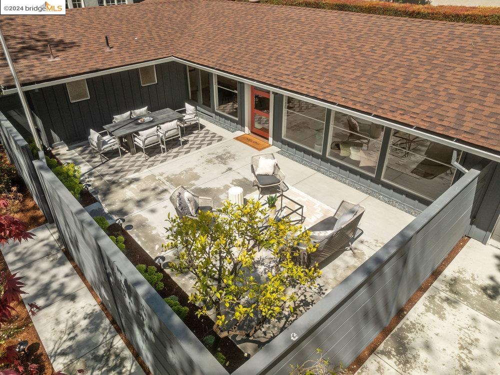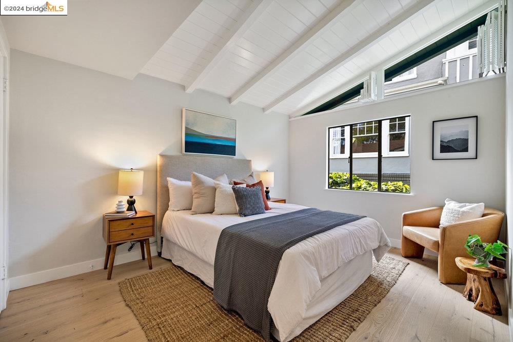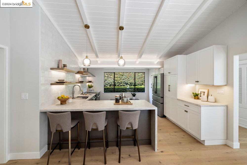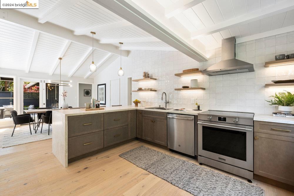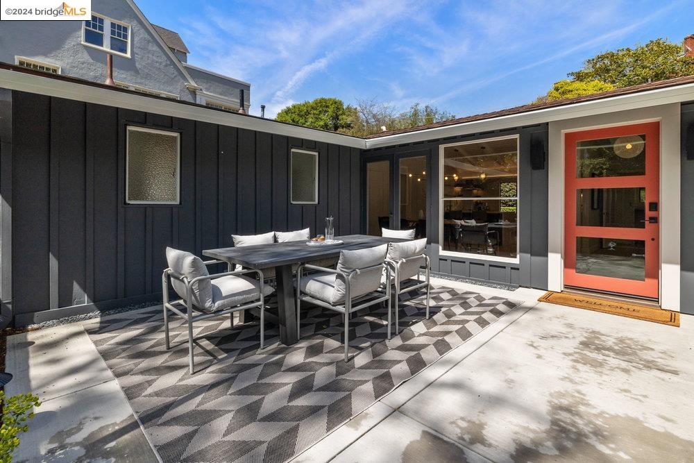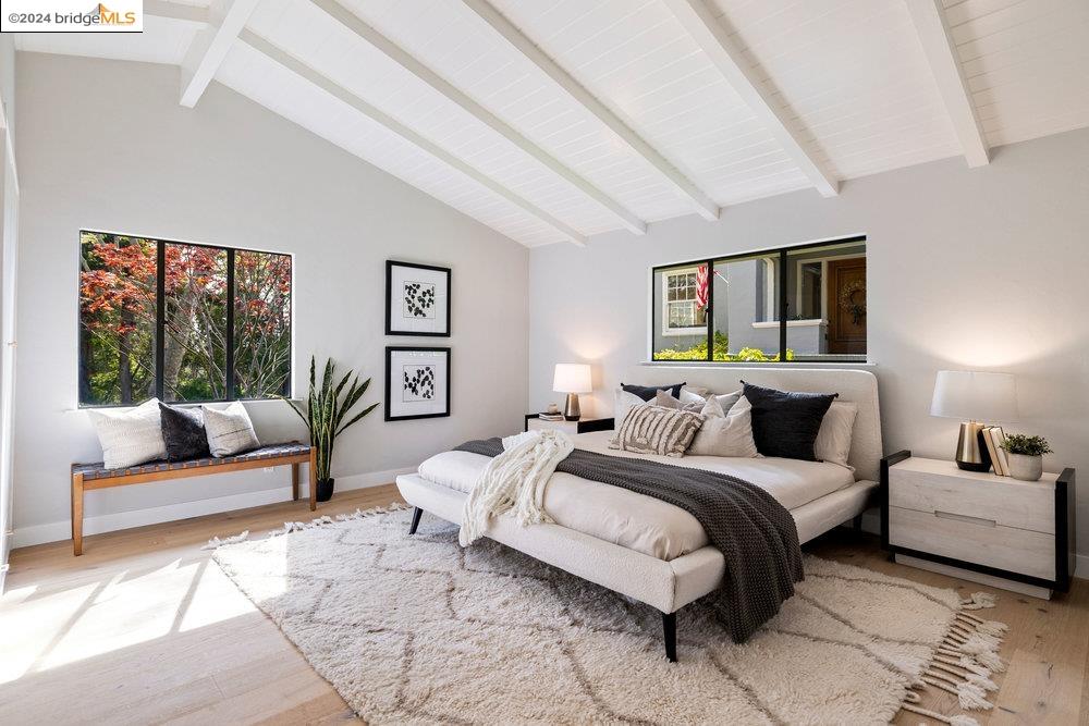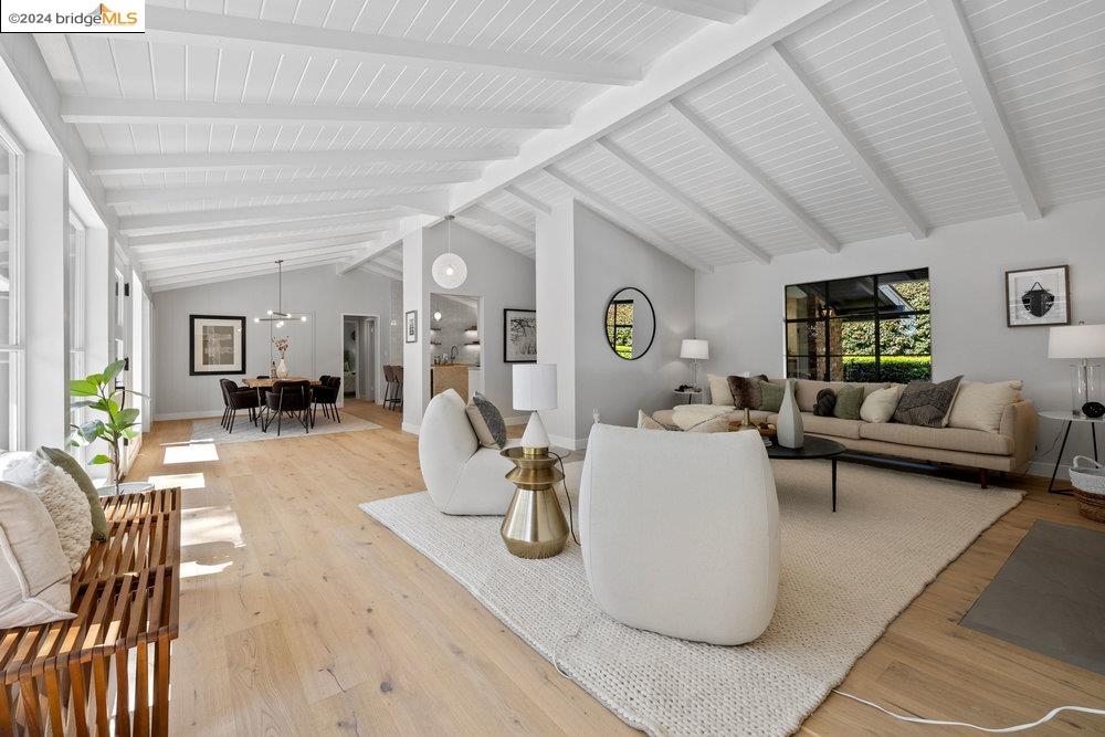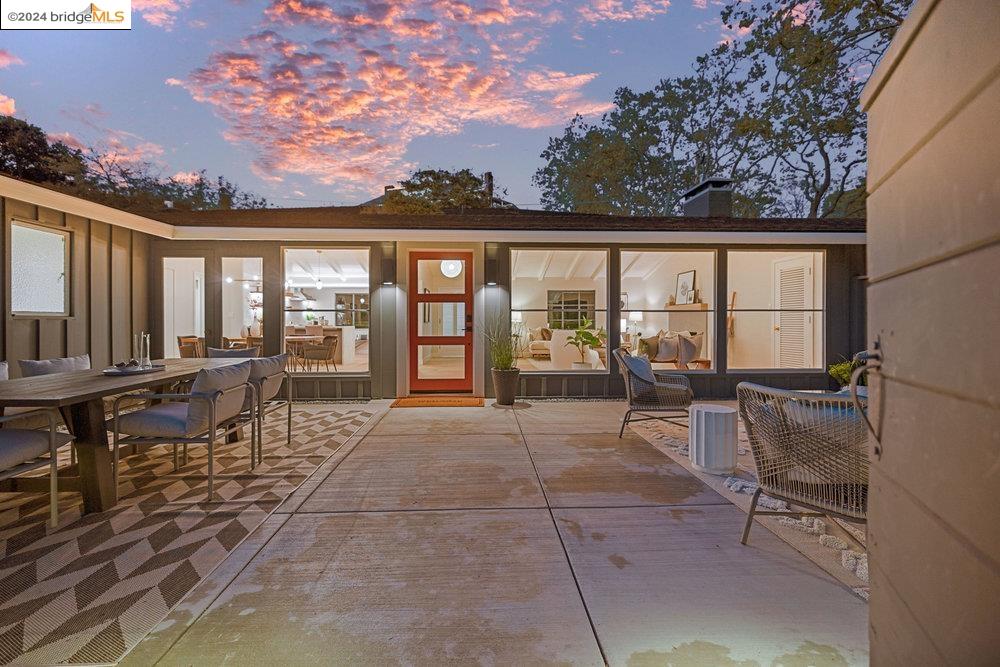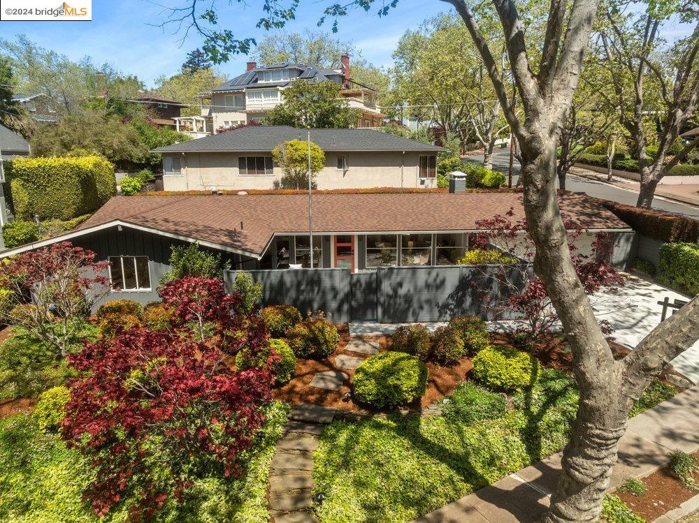 Stylish and unassuming, 160 Dracena Avenue offers all-level living on a beautiful tree-lined street near the center of Piedmont. The enclosed front courtyard and wall of windows blur the line between indoors and out. Vaulted wood ceilings create visual interest and a sense of expansiveness in the home. New wide-plank white oak floors run throughout the living spaces for a breezy, modern look. The open kitchen features new cabinetry, honed quartzite countertops, an induction range, floating shelves, and a double pantry. The dining area opens directly to the front patio, making it a wonderful place to entertain. A cozy fireplace with new tile surround and mantle anchors the open living room. Two bedrooms share a newly renovated bathroom just off the main living space. The primary suite provides a peaceful getaway with a newly renovated bathroom and views of the front garden. The attached two-car garage seals the deal for easy living in this exceptional mid-century home. Once you leave the front door, you will find yourself directly across from serene Dracena Park and a short stroll to top-rated schools, Mulberry's Market, the Piedmont Center for the Arts, sport courts, and more - welcome home!