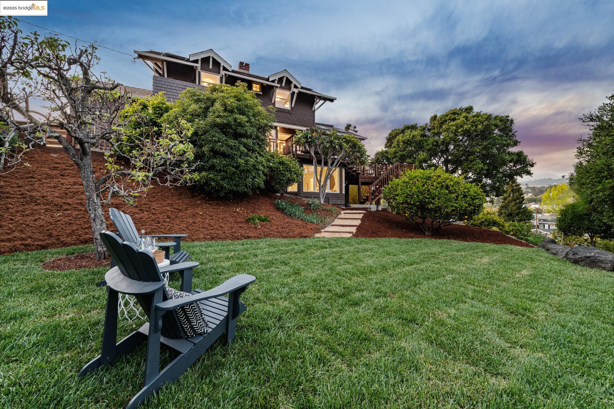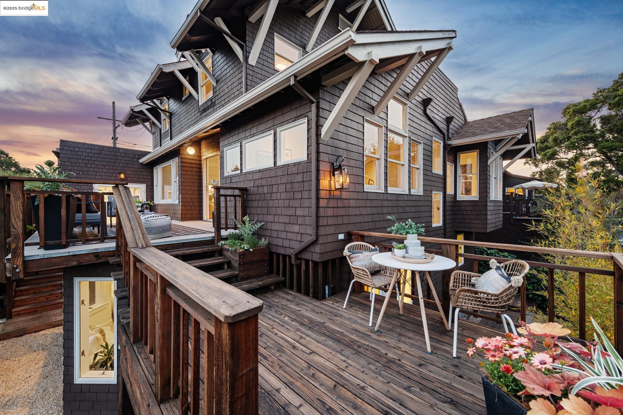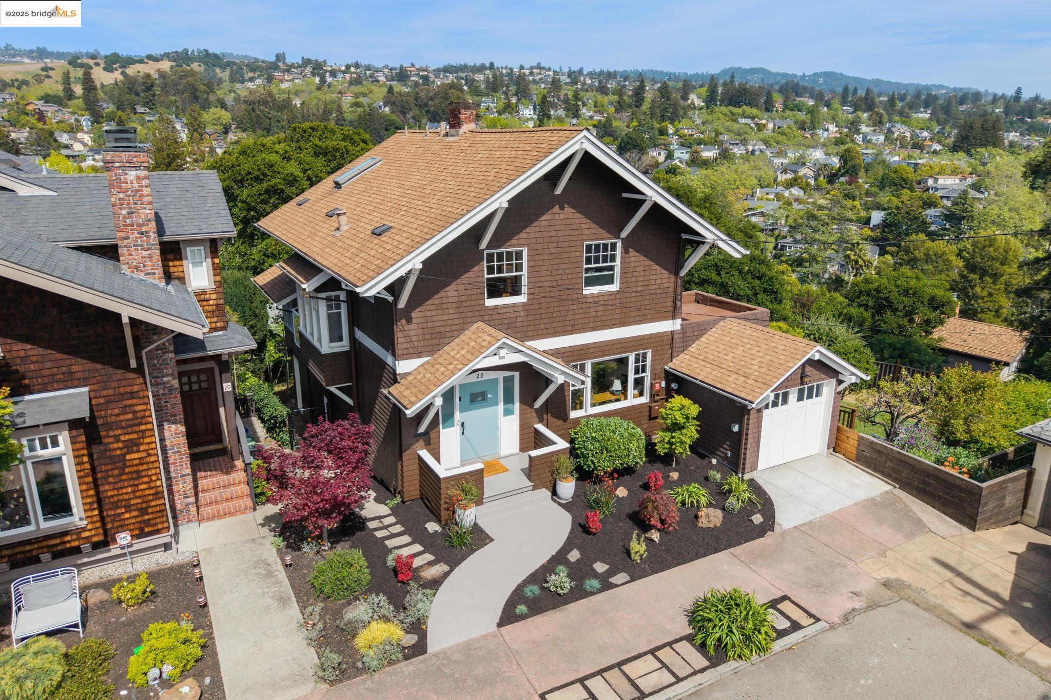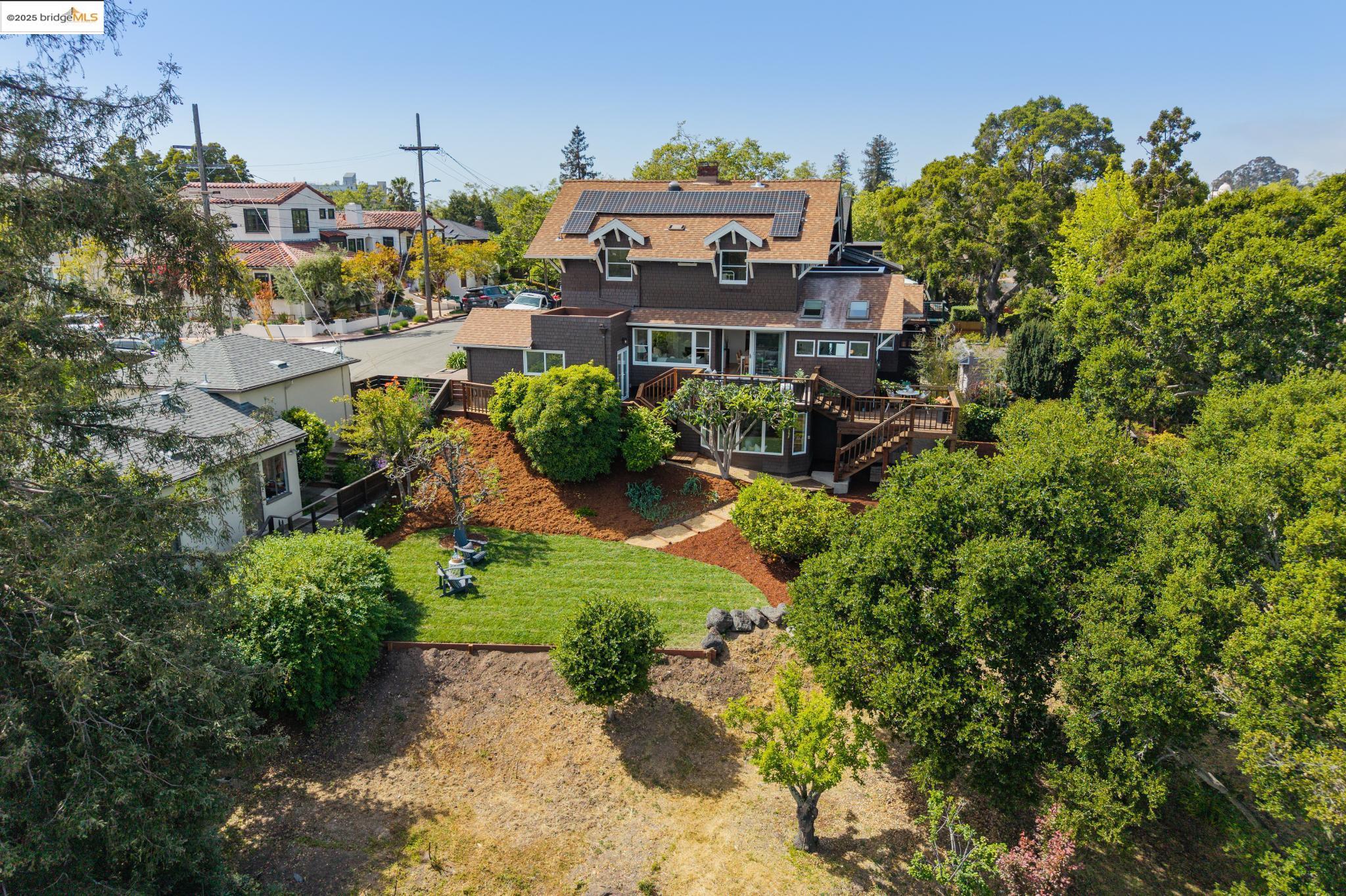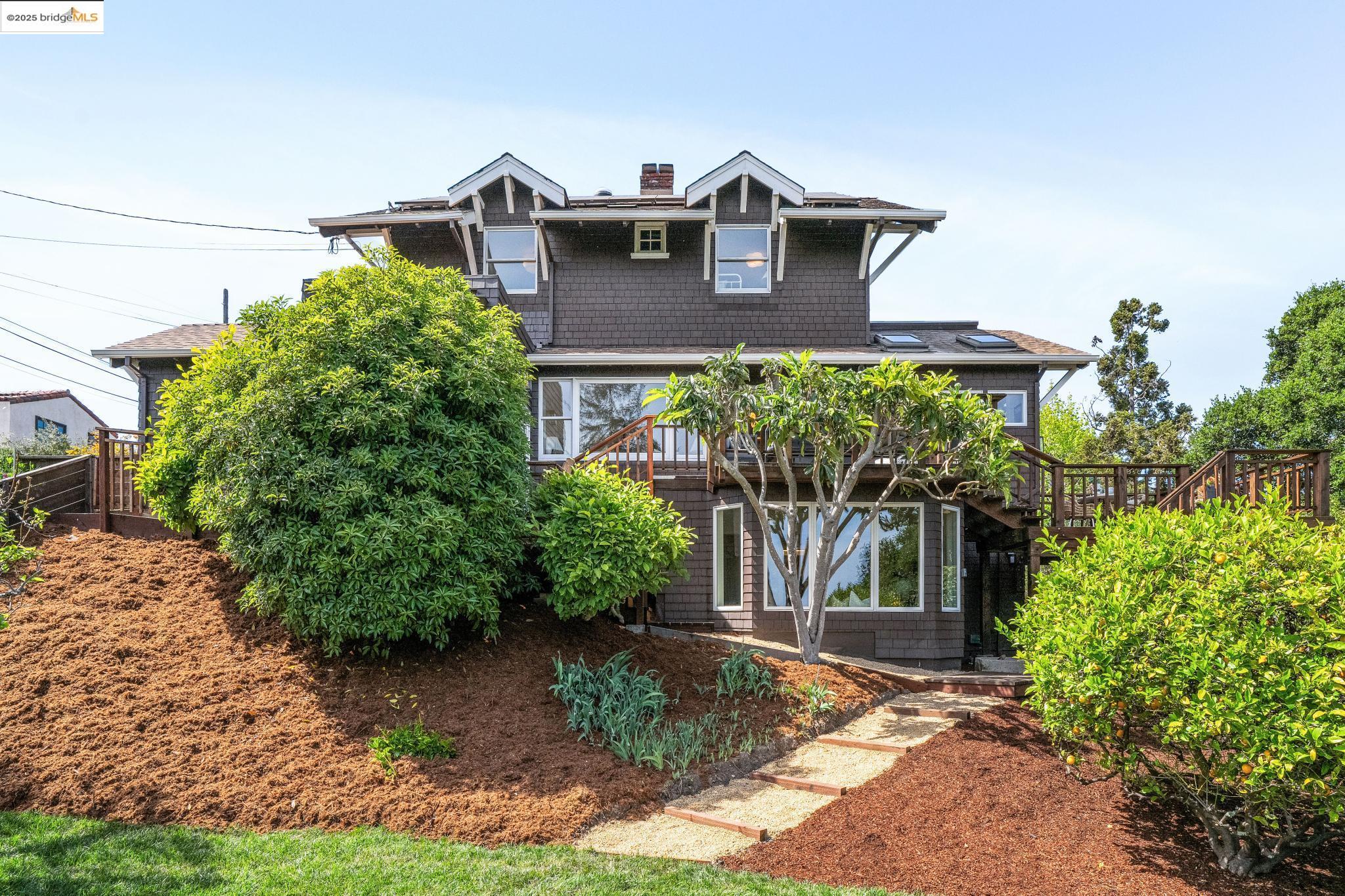 Classic brown shingled charmer packed with contemporary flair and upgrades galore! Sited on a rare and expansive double corner lot this special offering features 4 spacious bedrooms and 2.5 updated bathrooms. The main level is perfect for modern living and entertaining with a spacious great room, verdant views and french doors leading to the outside decks, level lawn and sweeping yard with fruit trees and unlimited potential. Located to stay connected to the action, the kitchen is fresh and bright with new countertops, stainless steel appliances and a sun-filled breakfast room. A comfy den and powder room complete this floor. Upstairs boasts three roomy bedrooms and a recently upgraded split bath. The lower level primary bedroom with ensuite bath has multiple windows framing the views and direct access to the outside. An adjacent laundry room connects to a storage space large enough to pack away anything & everything. Notable upgrades include seismic retrofitting, high-end windows, updated electrical, copper plumbing, owned solar, renovated kitchen, updated baths and a 'design award' winning garage built in 2023. Just around the corner from beloved Beach Elementary and close to Piedmont Ave shops & restaurants. Access to Piedmont's acclaimed schools & services!