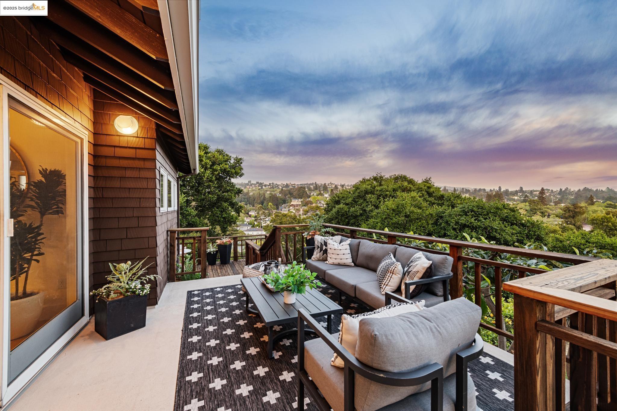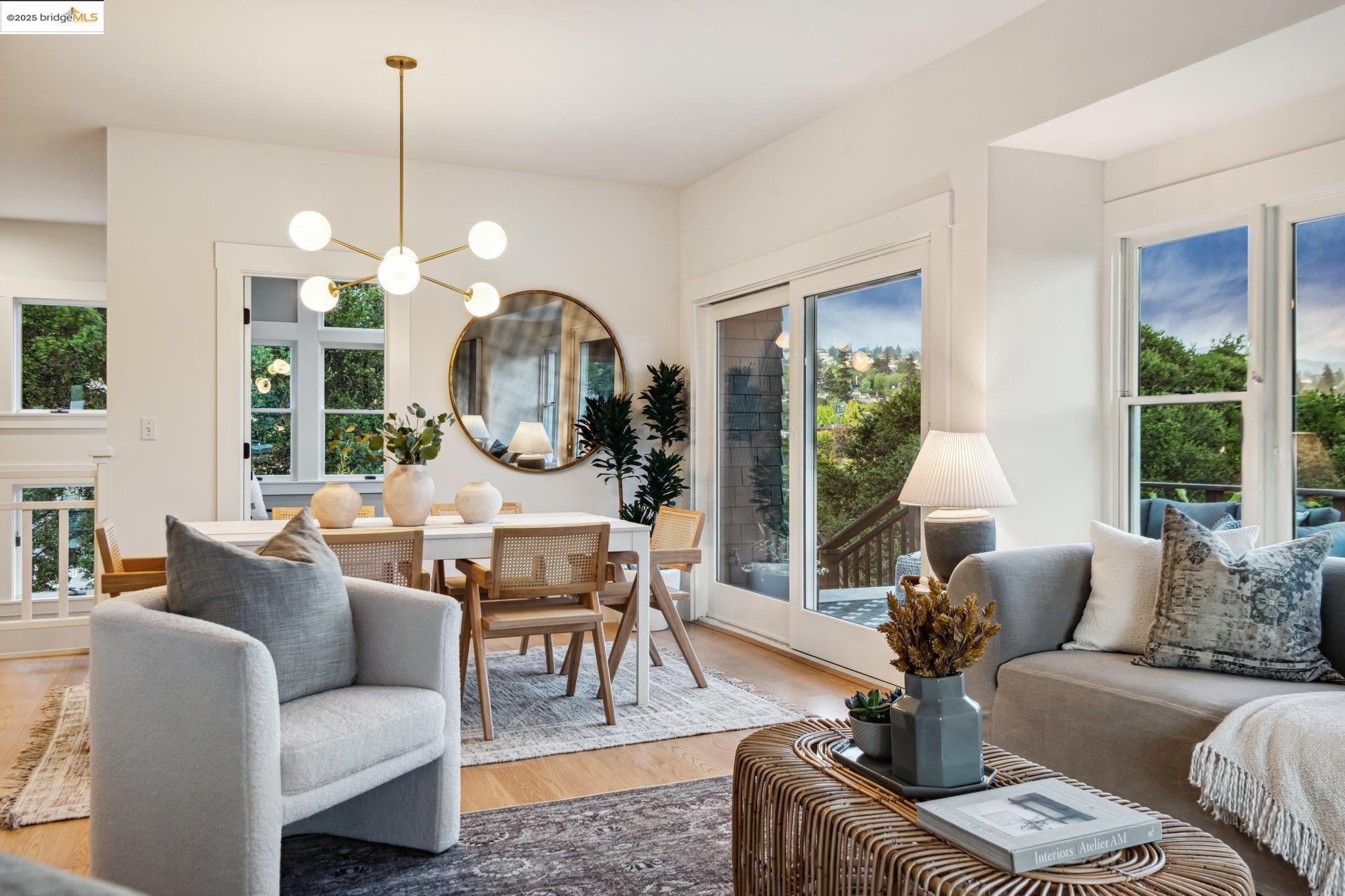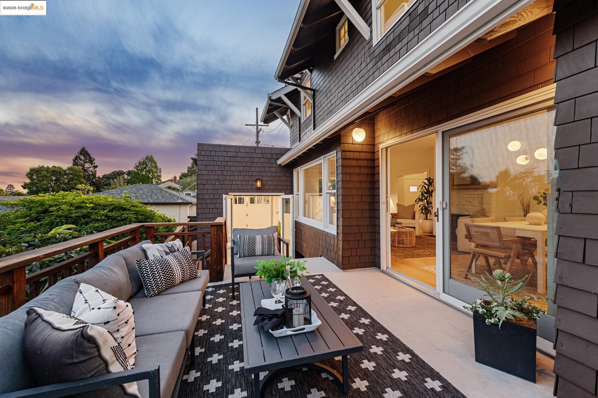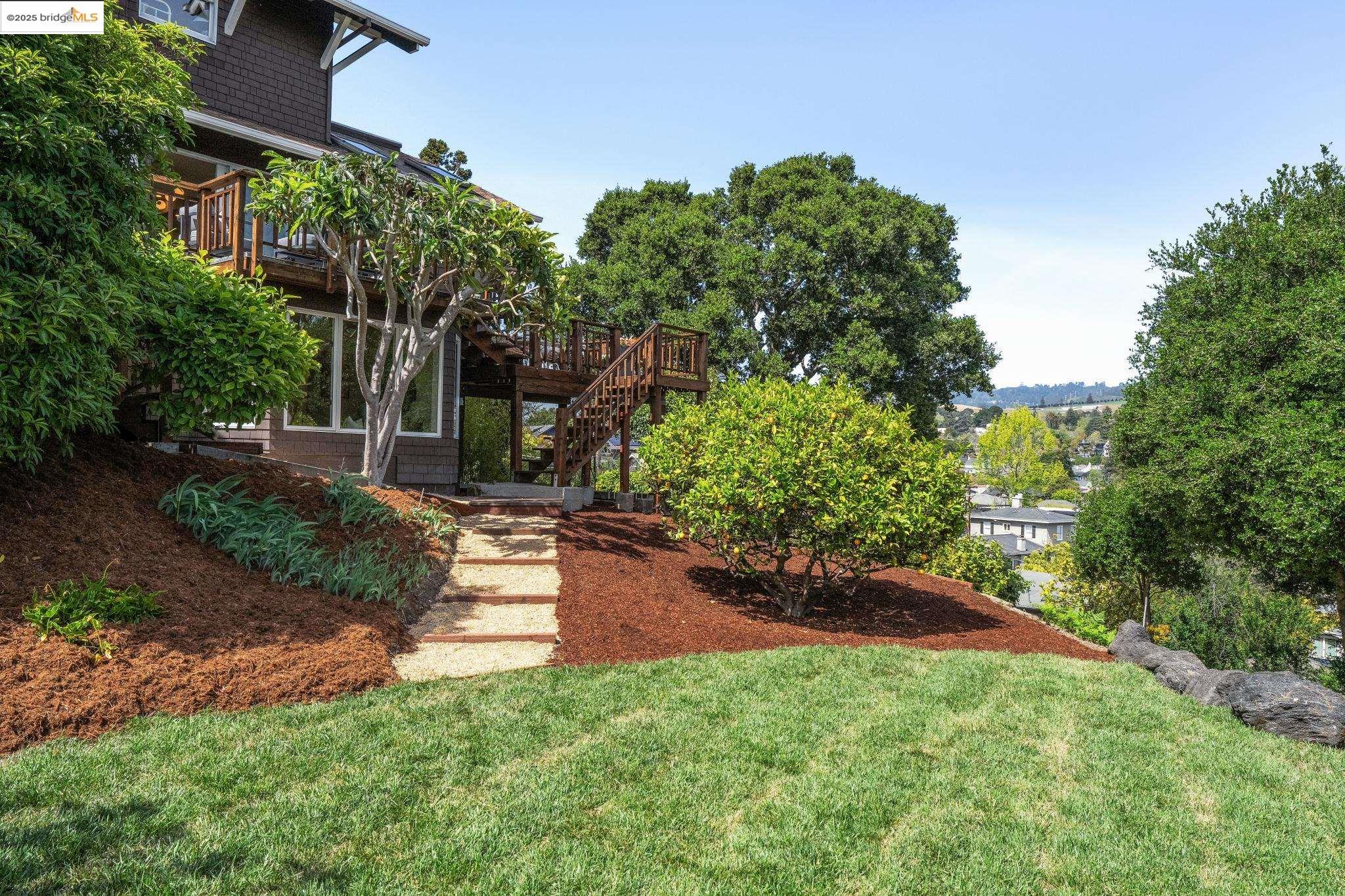 Classic brown shingled charmer packed with contemporary flair and upgrades galore! Sited on a rare and expansive double corner lot this special offering features 4 spacious bedrooms and 2.5 updated bathrooms. The main level is perfect for modern living and entertaining with a spacious great room, verdant views and french doors leading to the outside decks, level lawn and sweeping yard with fruit trees and unlimited potential. Located to stay connected to the action, the kitchen is fresh and bright with new countertops, stainless steel appliances and a sun-filled breakfast room. A comfy den and powder room complete this floor. Upstairs boasts three roomy bedrooms and a recently upgraded split bath. The lower level primary bedroom with ensuite bath has multiple windows framing the views and direct access to the outside. An adjacent laundry room connects to a storage space large enough to pack away anything & everything. Notable upgrades include seismic retrofitting, high-end windows, updated electrical, copper plumbing, owned solar, renovated kitchen, updated baths and a 'design award' winning garage built in 2023. Just around the corner from beloved Beach Elementary and close to Piedmont Ave shops & restaurants. Access to Piedmont's acclaimed schools & services!