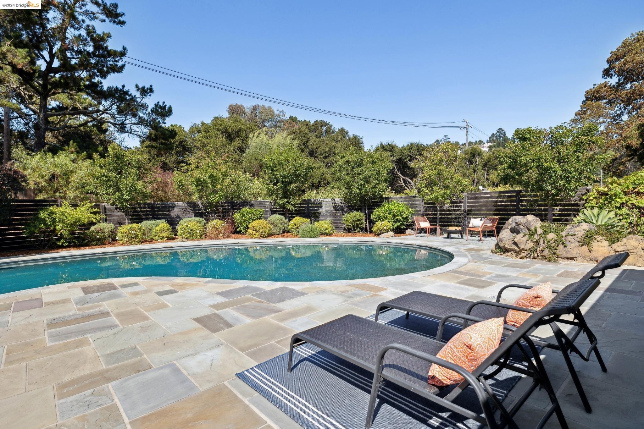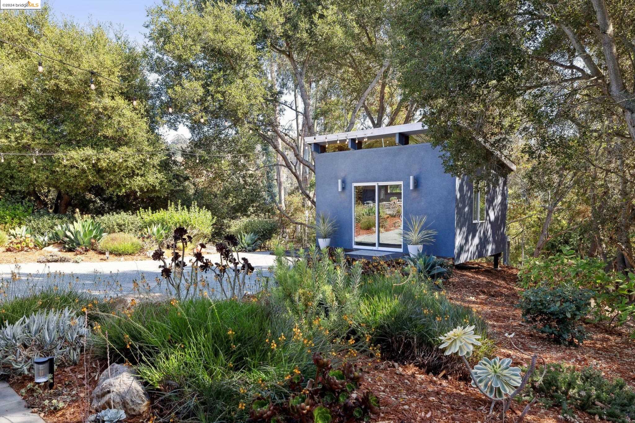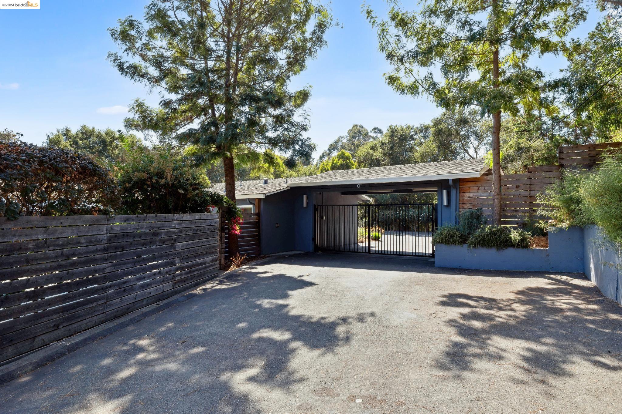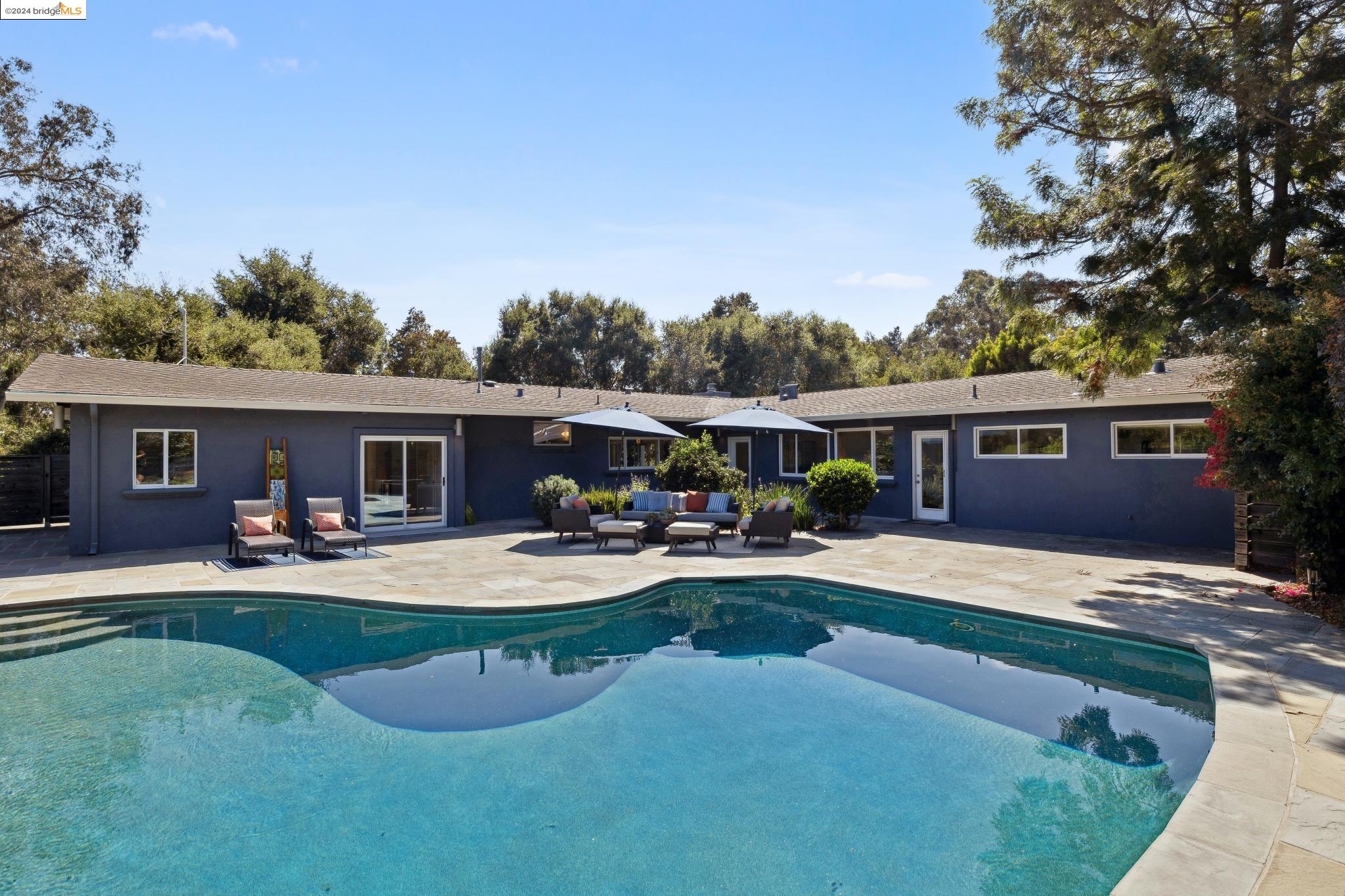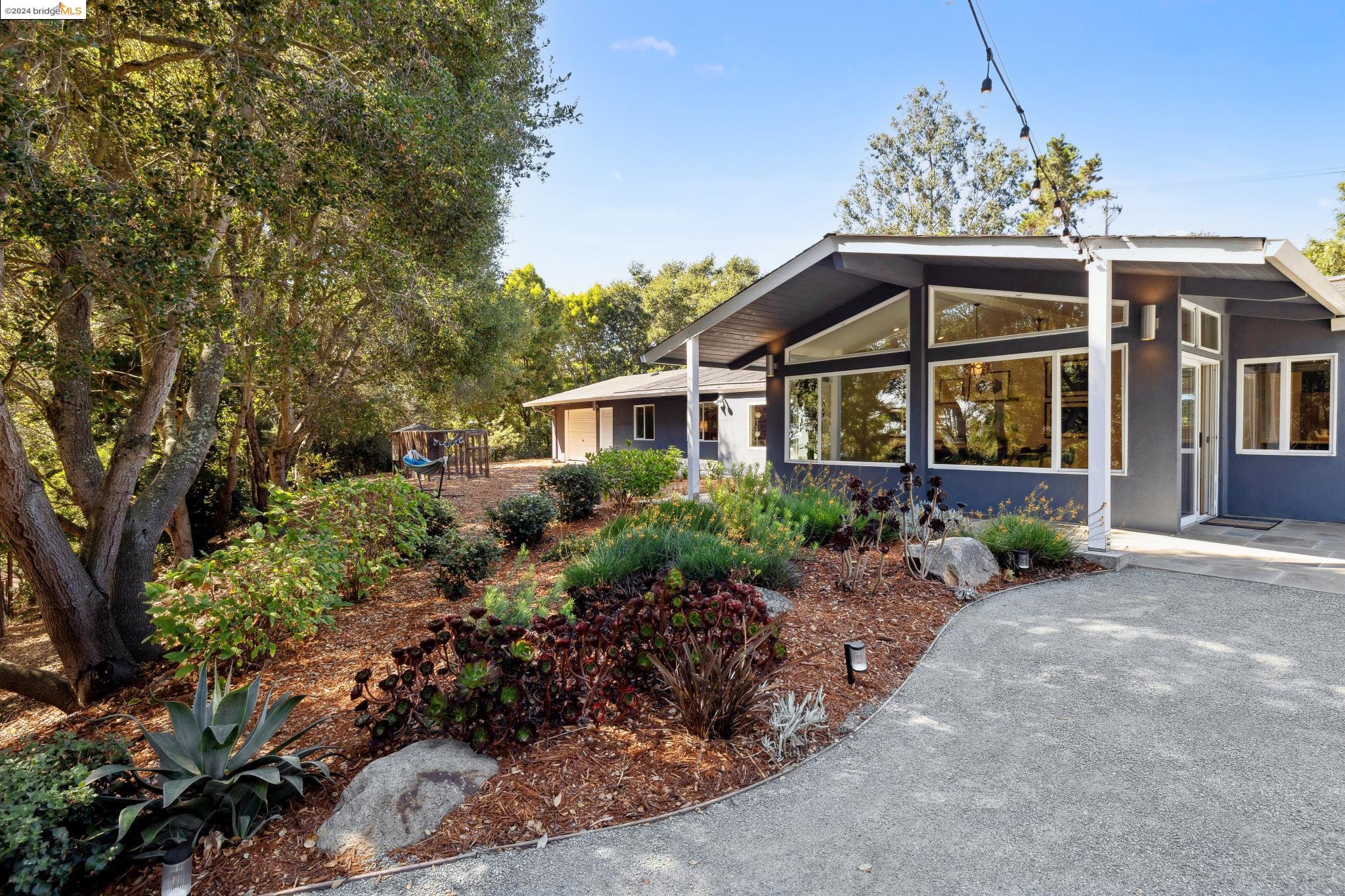 Discreetly nestled on nearly an acre, this superbly landscaped 4-bedroom, 3-bathroom mid-century home is a true showstopper. The spacious foyer connects to the attached garage for easy access. Stylish black slate floors set the tone as the space unfolds into a living room with unobstructed sightlines, a statement fireplace, and a wall of glass framing the natural beauty beyond. An adjacent dining room overlooks the garden, ideal for dinner parties. New white oak floors enhance the single-level floor plan, seamlessly connecting to exceptional outdoor spaces. You'll fall in love with the bluestone patios, sparkling pool, inviting hot tub, and charming detached studio. Winding paths, mature landscaping, veggie beds, and even a chicken coop make this property feel like a private retreat, perfect for relaxation and entertaining. The generous, open kitchen was fully renovated in 2017, featuring a Thermador range, quartz counters, and custom cabinetry. A spacious family room with wet bar accommodates large gatherings, effortlessly opening to the outdoor amenities. Built for John Reading, Oakland's 44th mayor, this 1954 home exemplifies California's indoor-outdoor lifestyle. With its gated entrance, owned solar, and thoughtful design, this unique offering is not to be missed. Come on by!