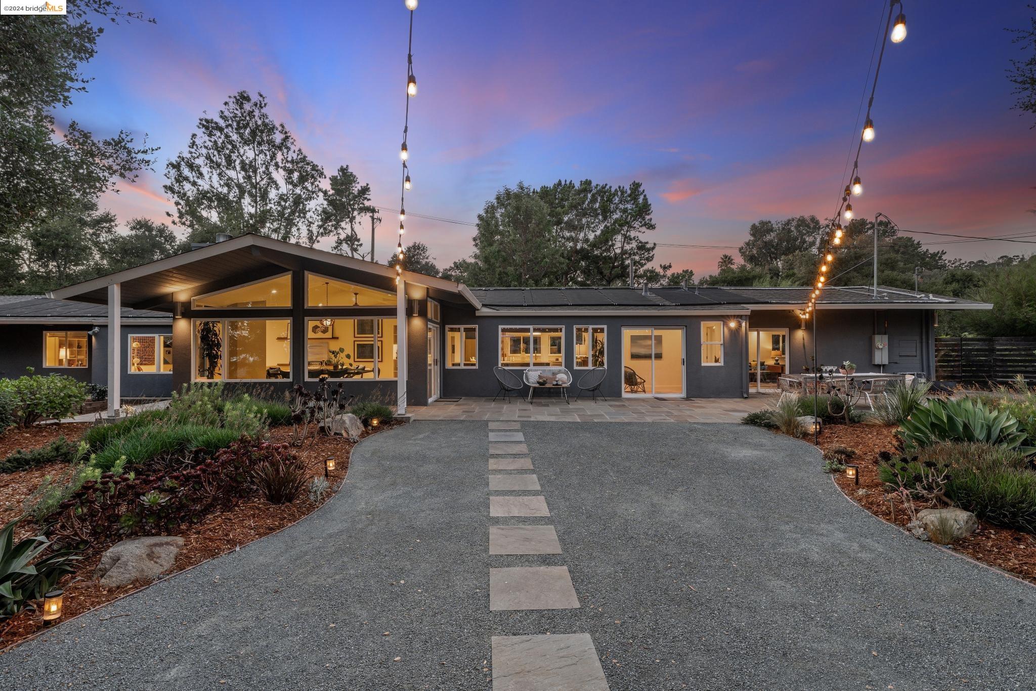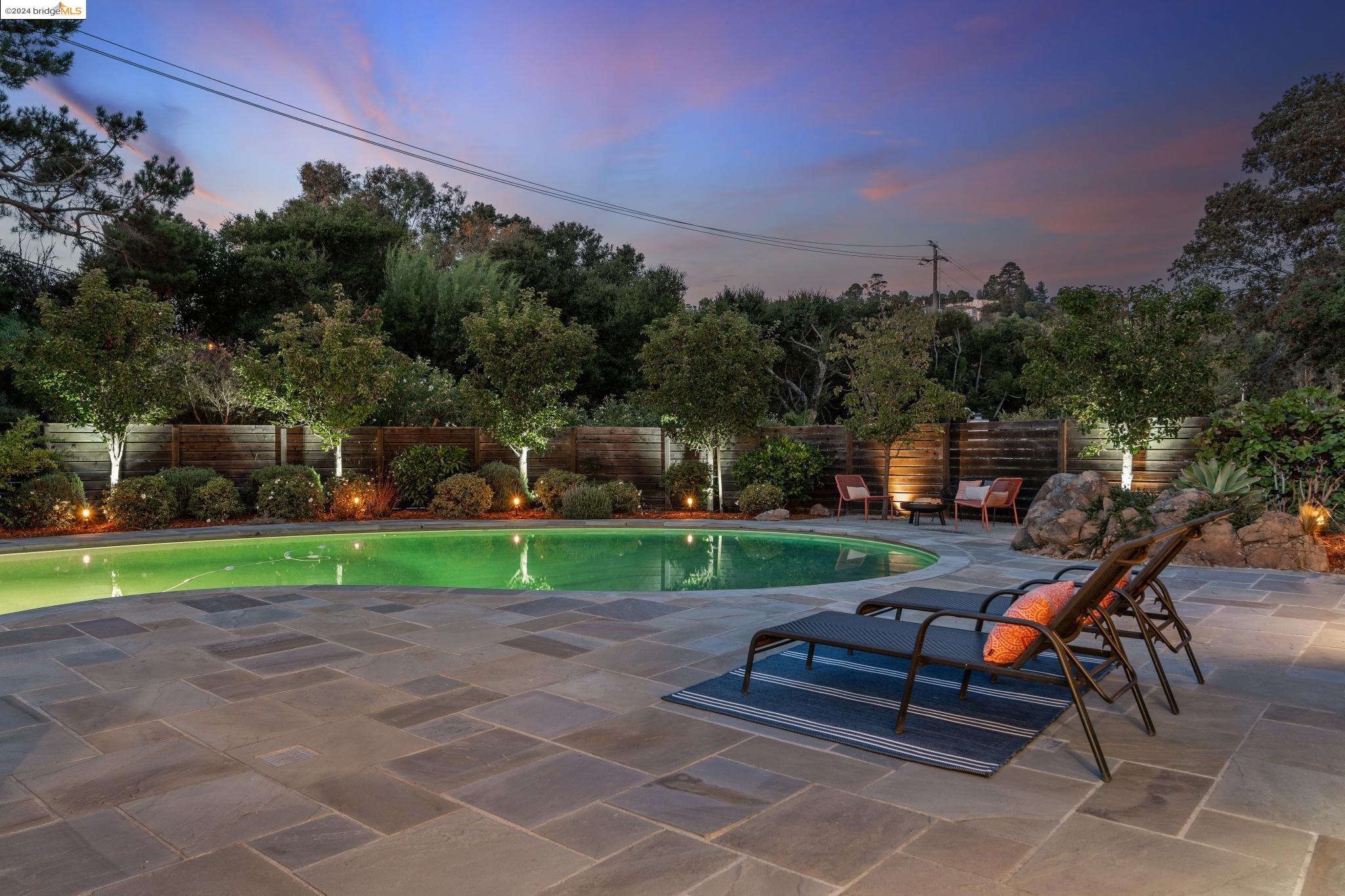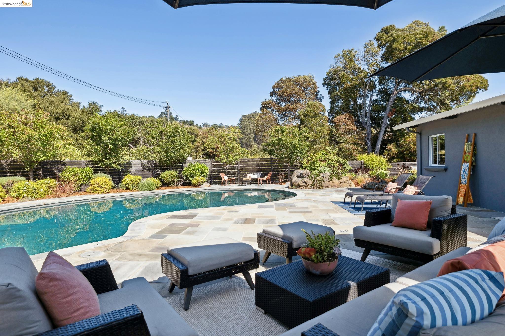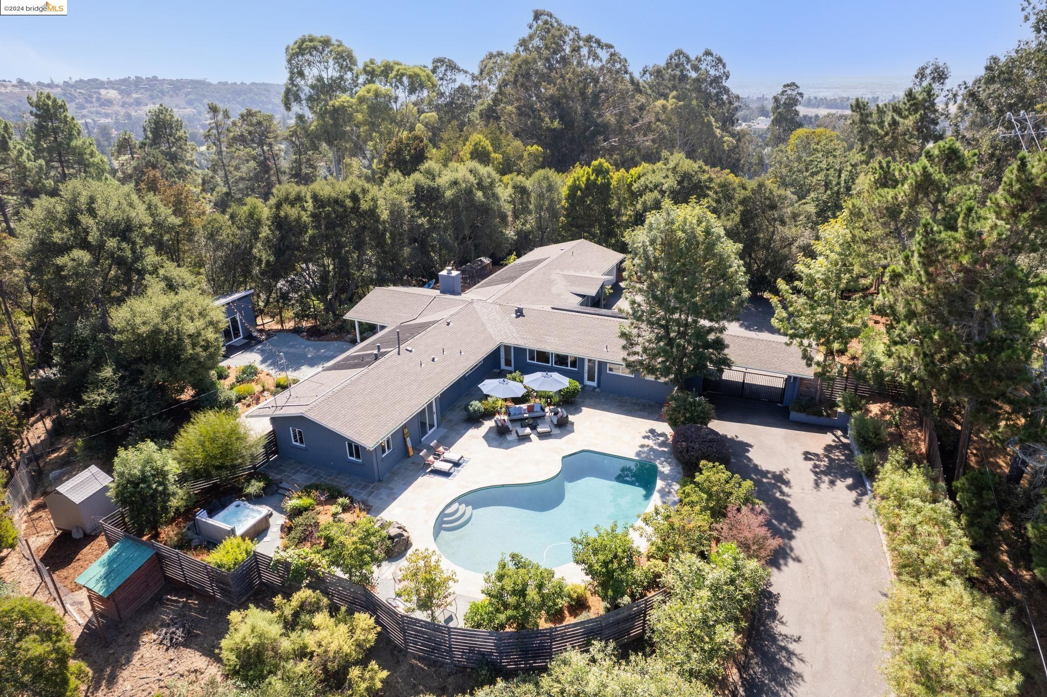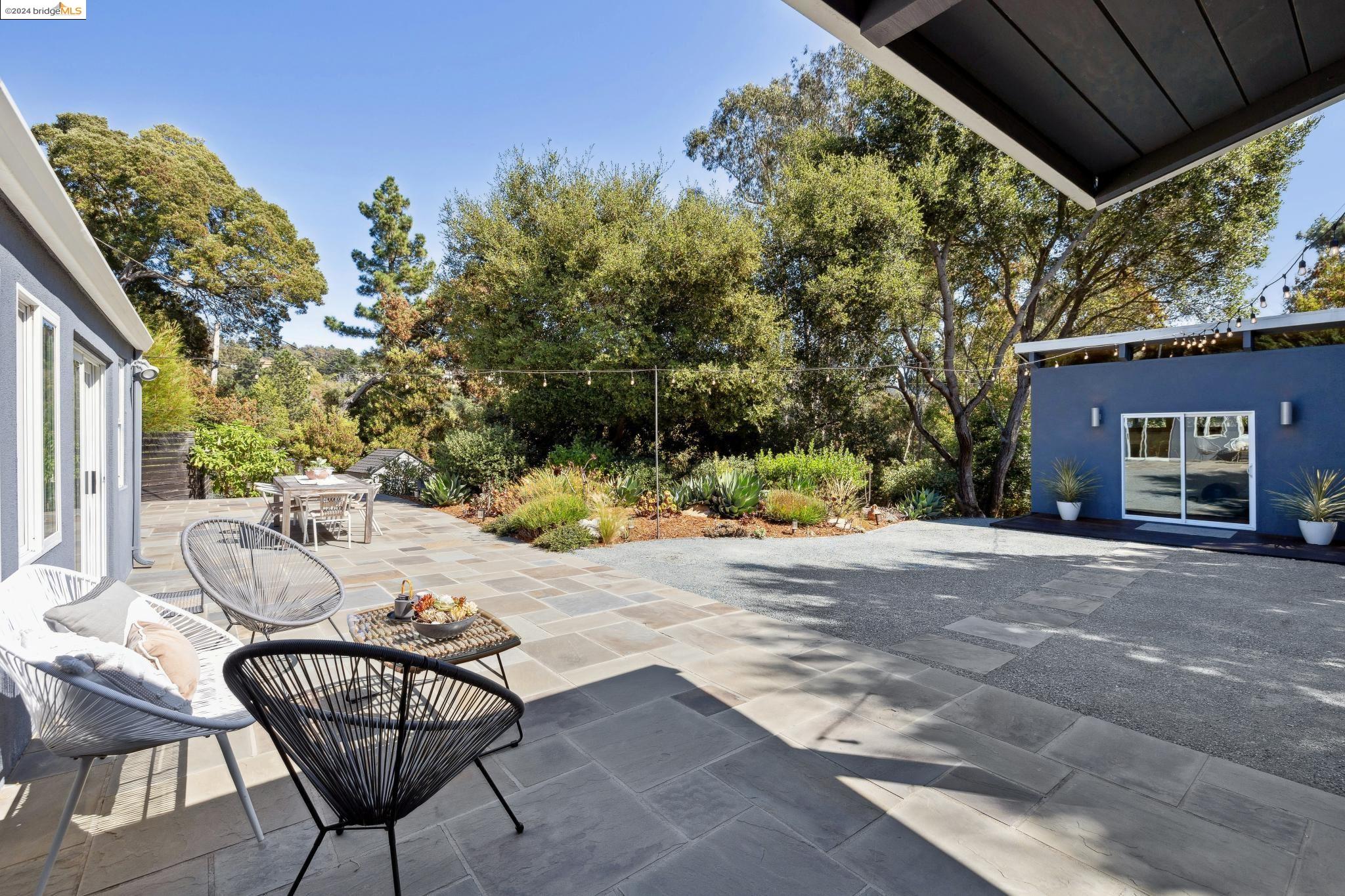 Discreetly nestled on nearly an acre, this superbly landscaped 4-bedroom, 3-bathroom mid-century home is a true showstopper. The spacious foyer connects to the attached garage for easy access. Stylish black slate floors set the tone as the space unfolds into a living room with unobstructed sightlines, a statement fireplace, and a wall of glass framing the natural beauty beyond. An adjacent dining room overlooks the garden, ideal for dinner parties. New white oak floors enhance the single-level floor plan, seamlessly connecting to exceptional outdoor spaces. You'll fall in love with the bluestone patios, sparkling pool, inviting hot tub, and charming detached studio. Winding paths, mature landscaping, veggie beds, and even a chicken coop make this property feel like a private retreat, perfect for relaxation and entertaining. The generous, open kitchen was fully renovated in 2017, featuring a Thermador range, quartz counters, and custom cabinetry. A spacious family room with wet bar accommodates large gatherings, effortlessly opening to the outdoor amenities. Built for John Reading, Oakland's 44th mayor, this 1954 home exemplifies California's indoor-outdoor lifestyle. With its gated entrance, owned solar, and thoughtful design, this unique offering is not to be missed. Come on by!