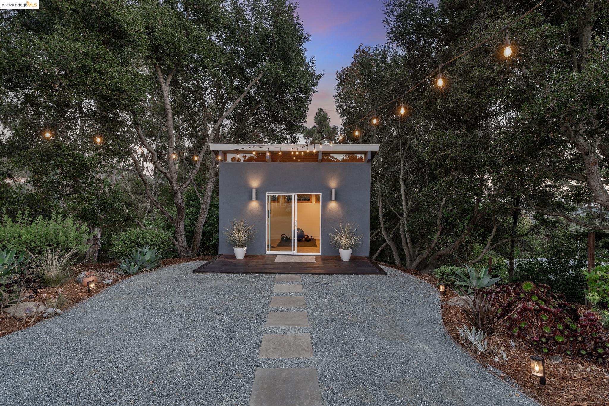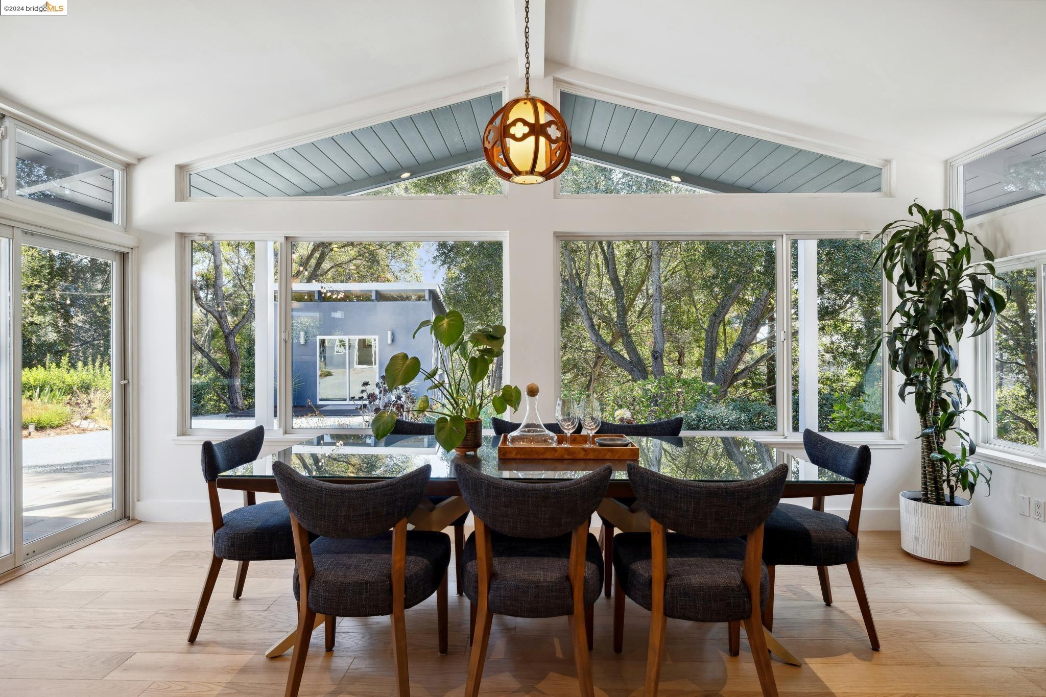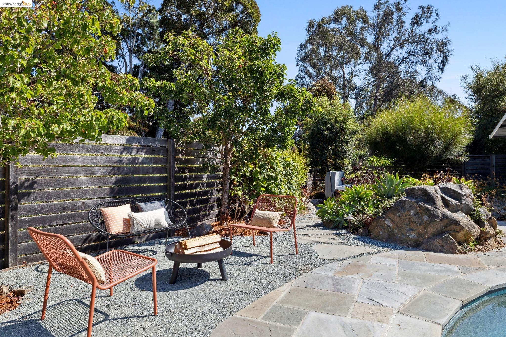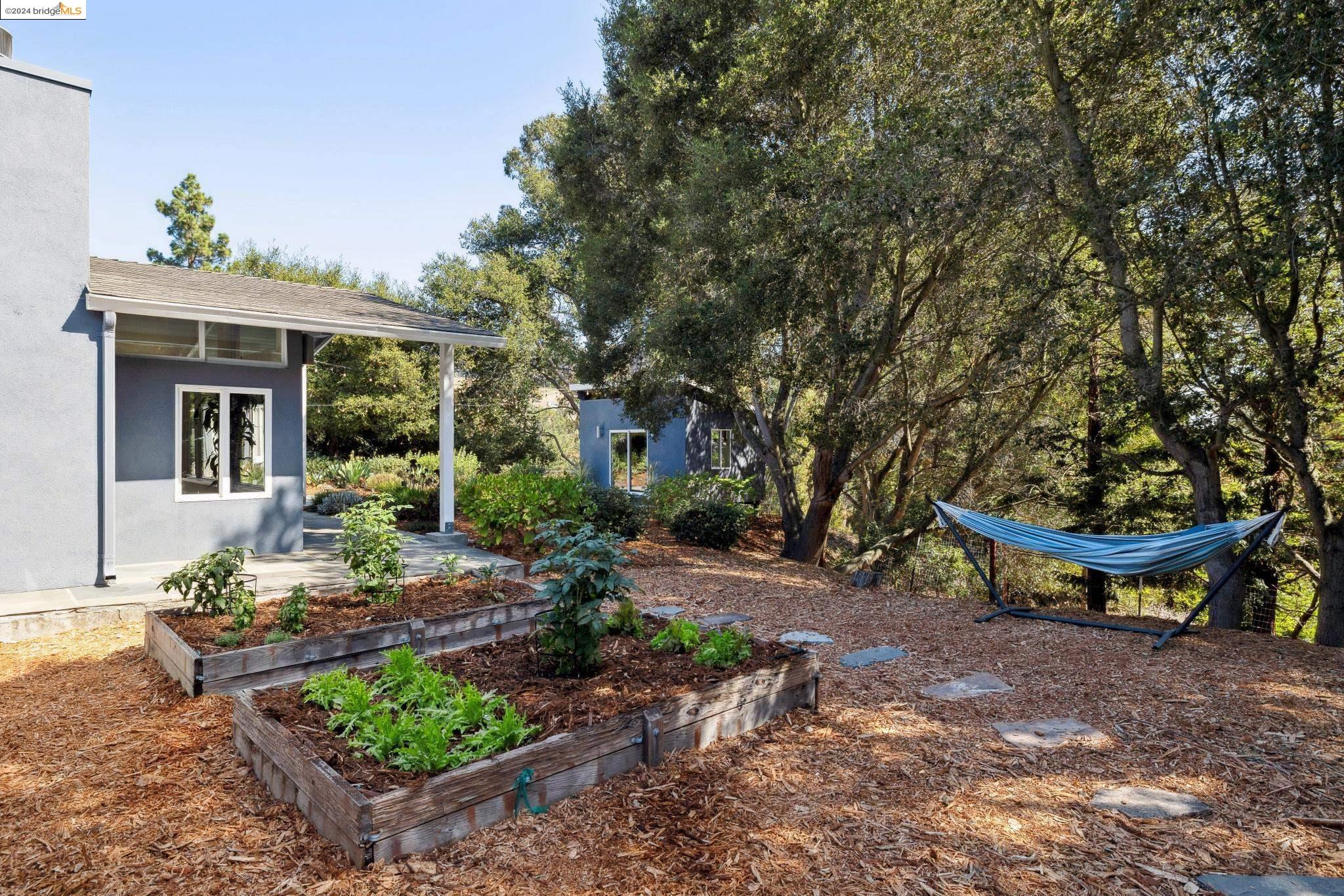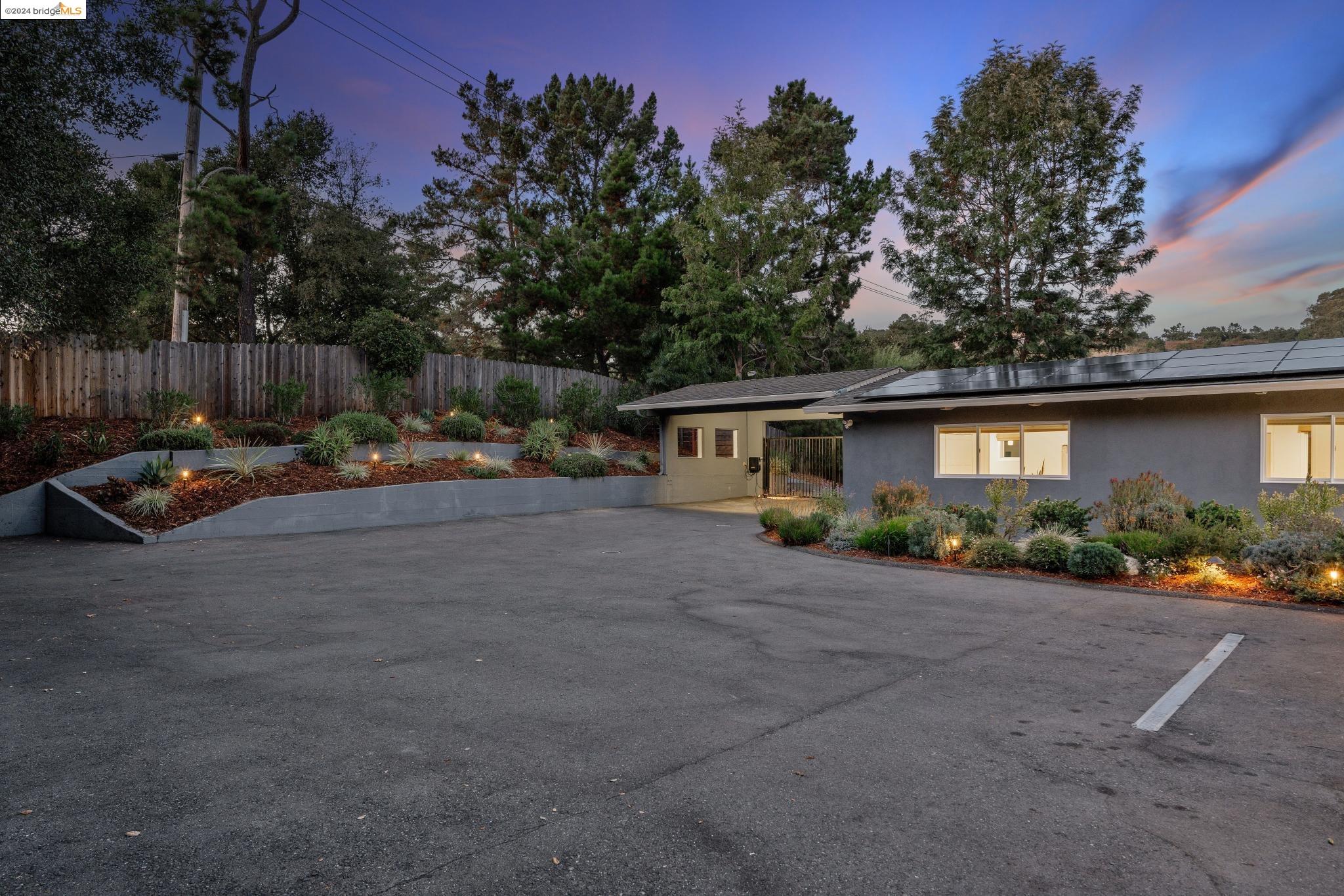 Discreetly nestled on nearly an acre, this superbly landscaped 4-bedroom, 3-bathroom mid-century home is a true showstopper. The spacious foyer connects to the attached garage for easy access. Stylish black slate floors set the tone as the space unfolds into a living room with unobstructed sightlines, a statement fireplace, and a wall of glass framing the natural beauty beyond. An adjacent dining room overlooks the garden, ideal for dinner parties. New white oak floors enhance the single-level floor plan, seamlessly connecting to exceptional outdoor spaces. You'll fall in love with the bluestone patios, sparkling pool, inviting hot tub, and charming detached studio. Winding paths, mature landscaping, veggie beds, and even a chicken coop make this property feel like a private retreat, perfect for relaxation and entertaining. The generous, open kitchen was fully renovated in 2017, featuring a Thermador range, quartz counters, and custom cabinetry. A spacious family room with wet bar accommodates large gatherings, effortlessly opening to the outdoor amenities. Built for John Reading, Oakland's 44th mayor, this 1954 home exemplifies California's indoor-outdoor lifestyle. With its gated entrance, owned solar, and thoughtful design, this unique offering is not to be missed. Come on by!