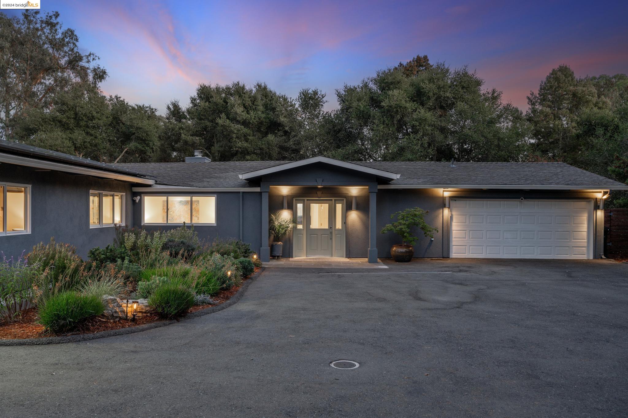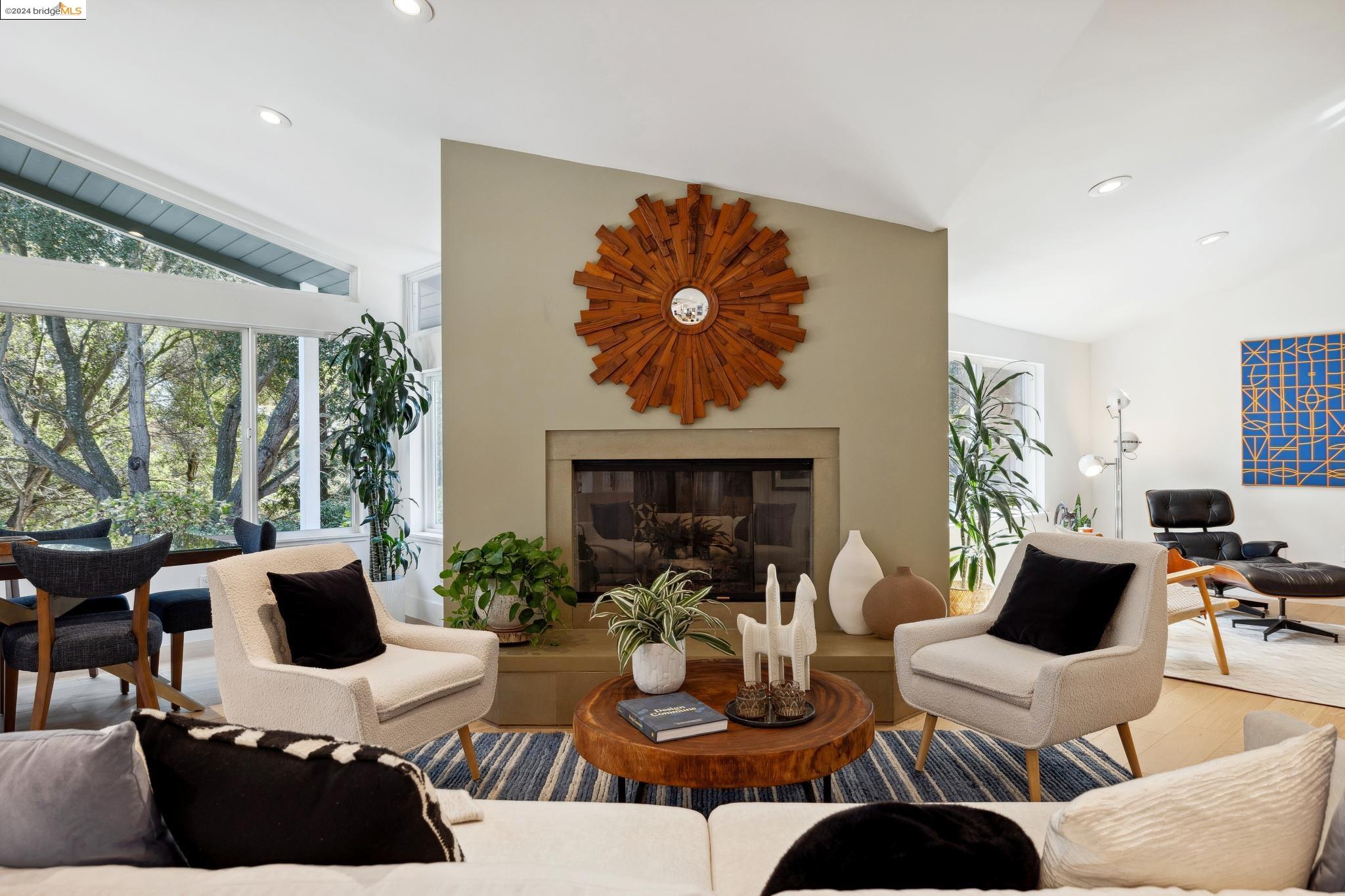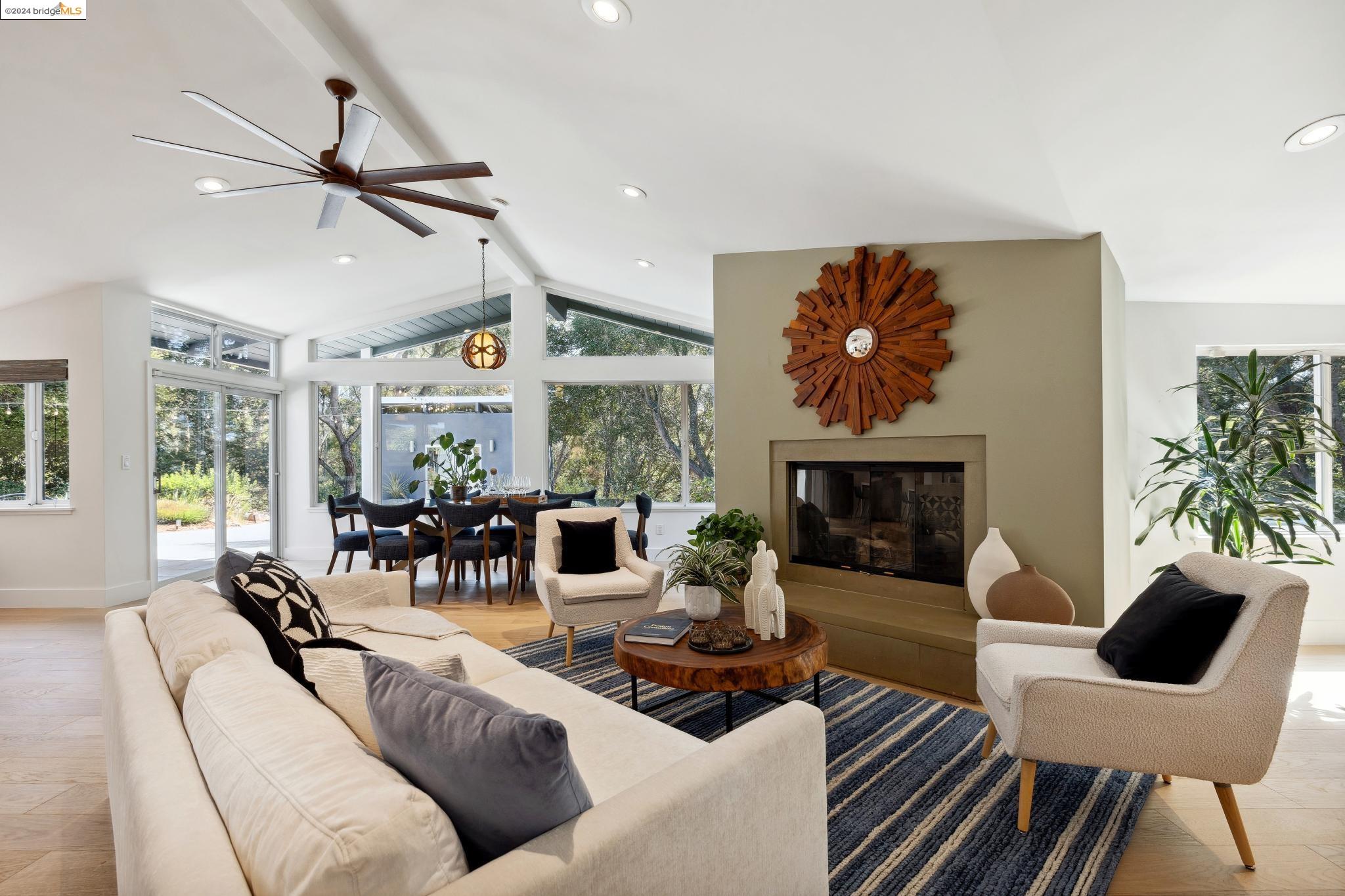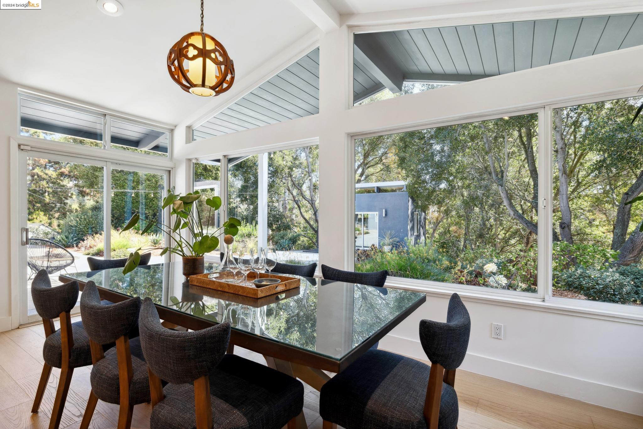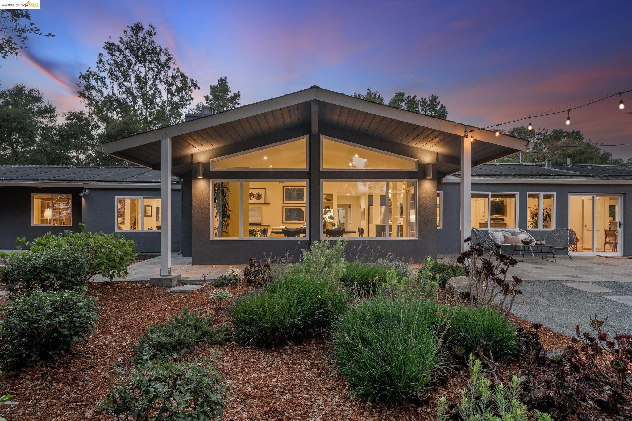 Discreetly nestled on nearly an acre, this superbly landscaped 4-bedroom, 3-bathroom mid-century home is a true showstopper. The spacious foyer connects to the attached garage for easy access. Stylish black slate floors set the tone as the space unfolds into a living room with unobstructed sightlines, a statement fireplace, and a wall of glass framing the natural beauty beyond. An adjacent dining room overlooks the garden, ideal for dinner parties. New white oak floors enhance the single-level floor plan, seamlessly connecting to exceptional outdoor spaces. You'll fall in love with the bluestone patios, sparkling pool, inviting hot tub, and charming detached studio. Winding paths, mature landscaping, veggie beds, and even a chicken coop make this property feel like a private retreat, perfect for relaxation and entertaining. The generous, open kitchen was fully renovated in 2017, featuring a Thermador range, quartz counters, and custom cabinetry. A spacious family room with wet bar accommodates large gatherings, effortlessly opening to the outdoor amenities. Built for John Reading, Oakland's 44th mayor, this 1954 home exemplifies California's indoor-outdoor lifestyle. With its gated entrance, owned solar, and thoughtful design, this unique offering is not to be missed. Come on by!