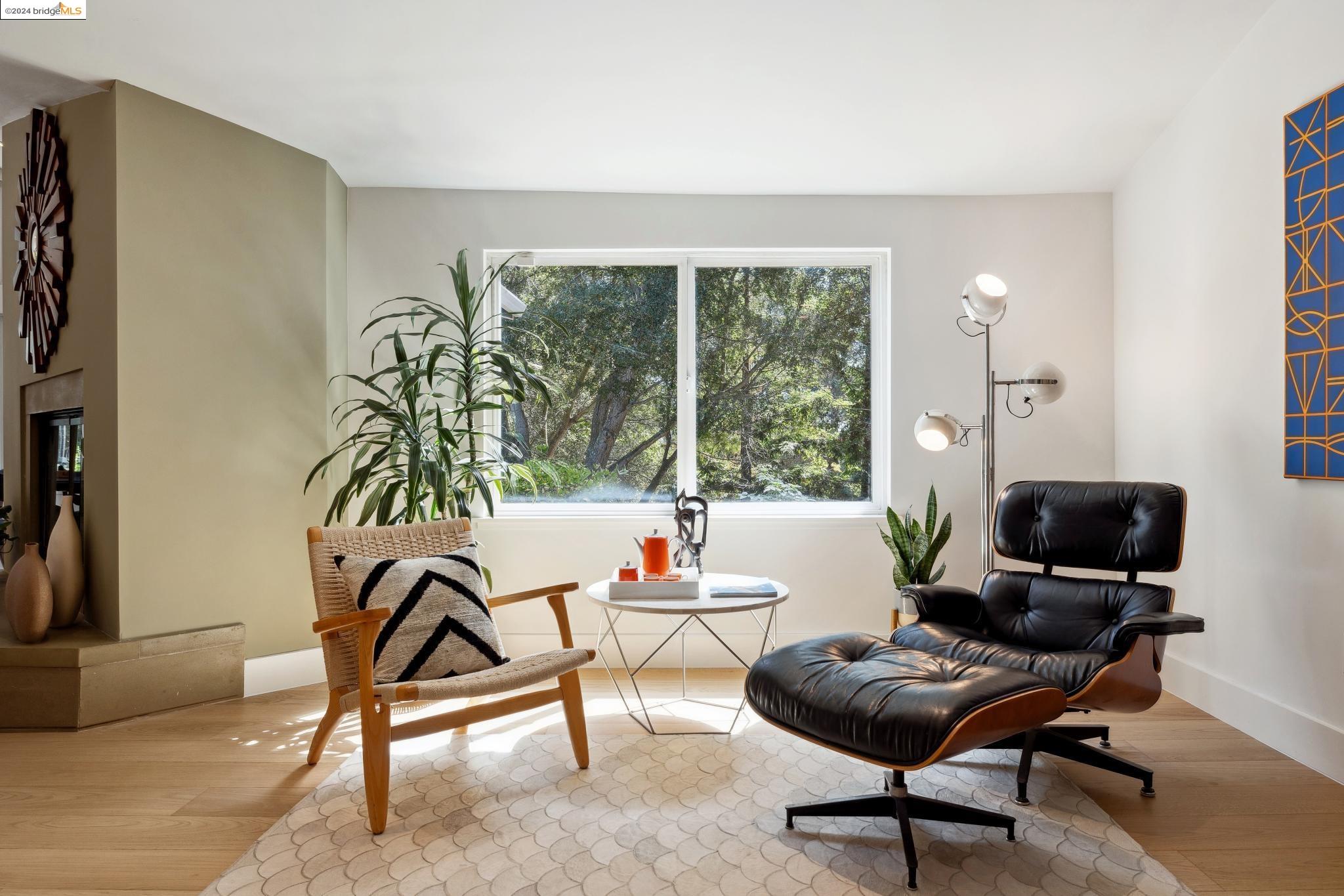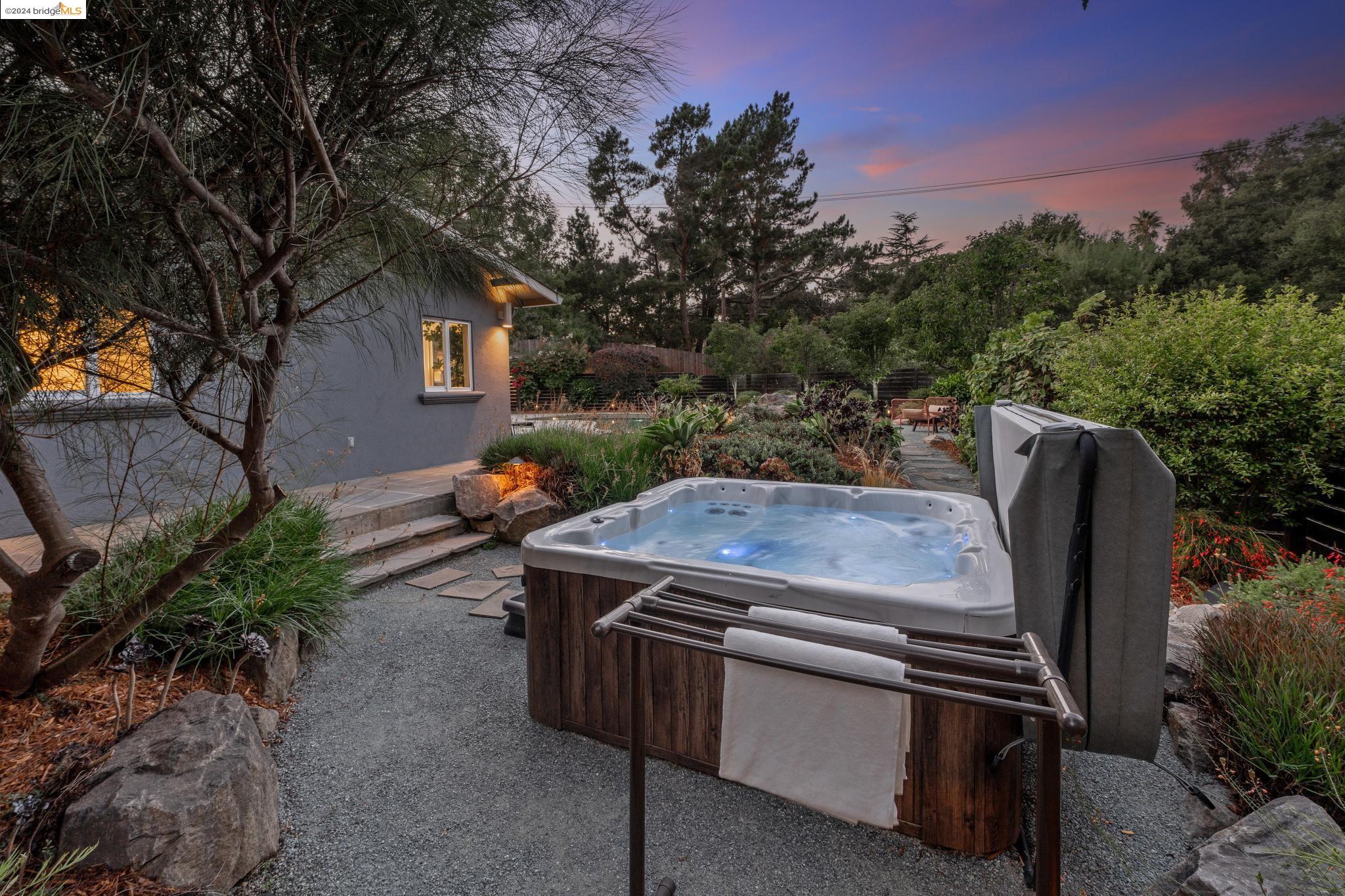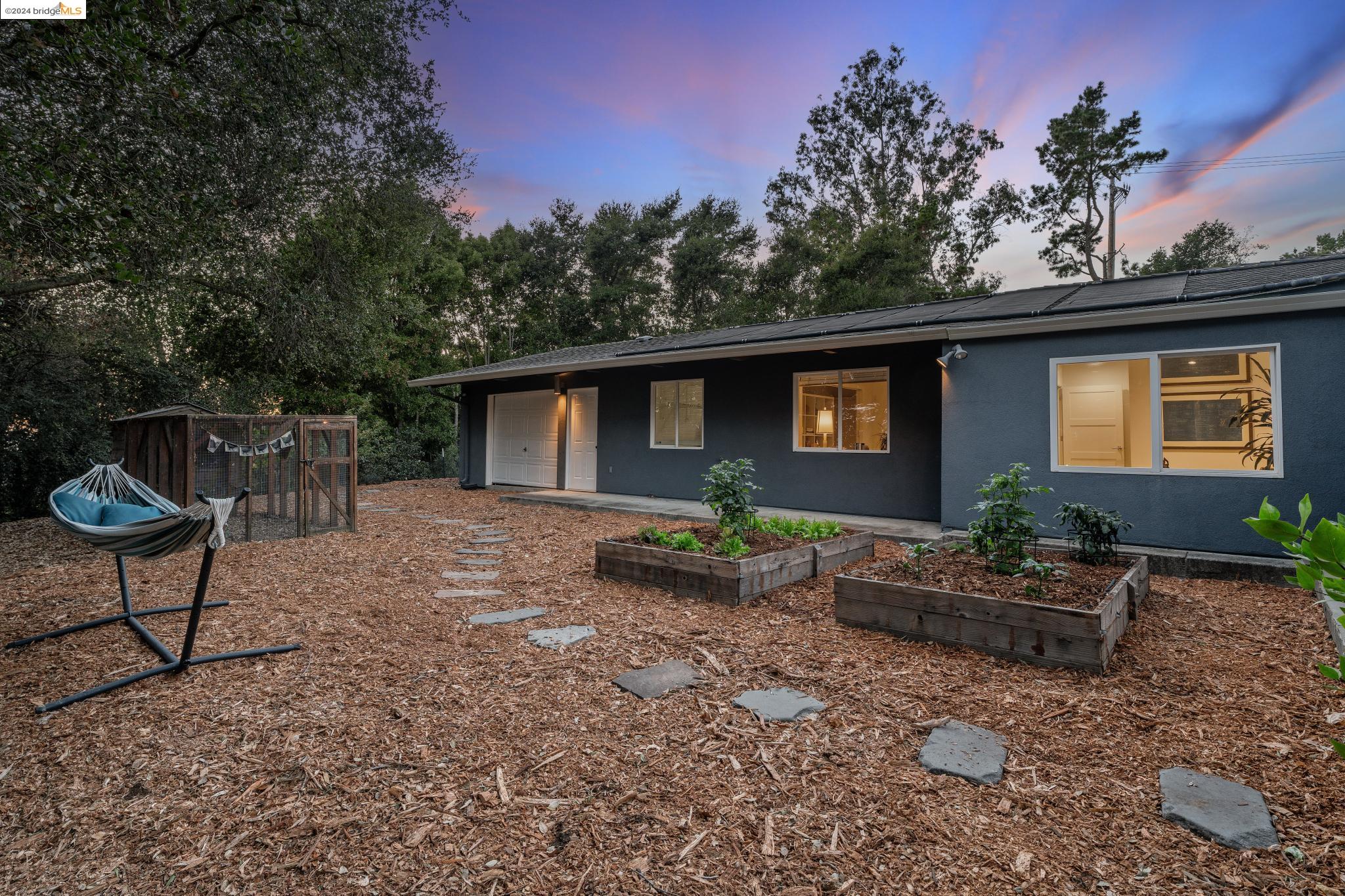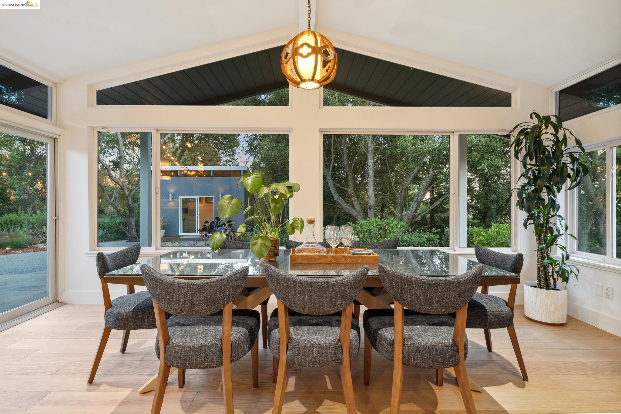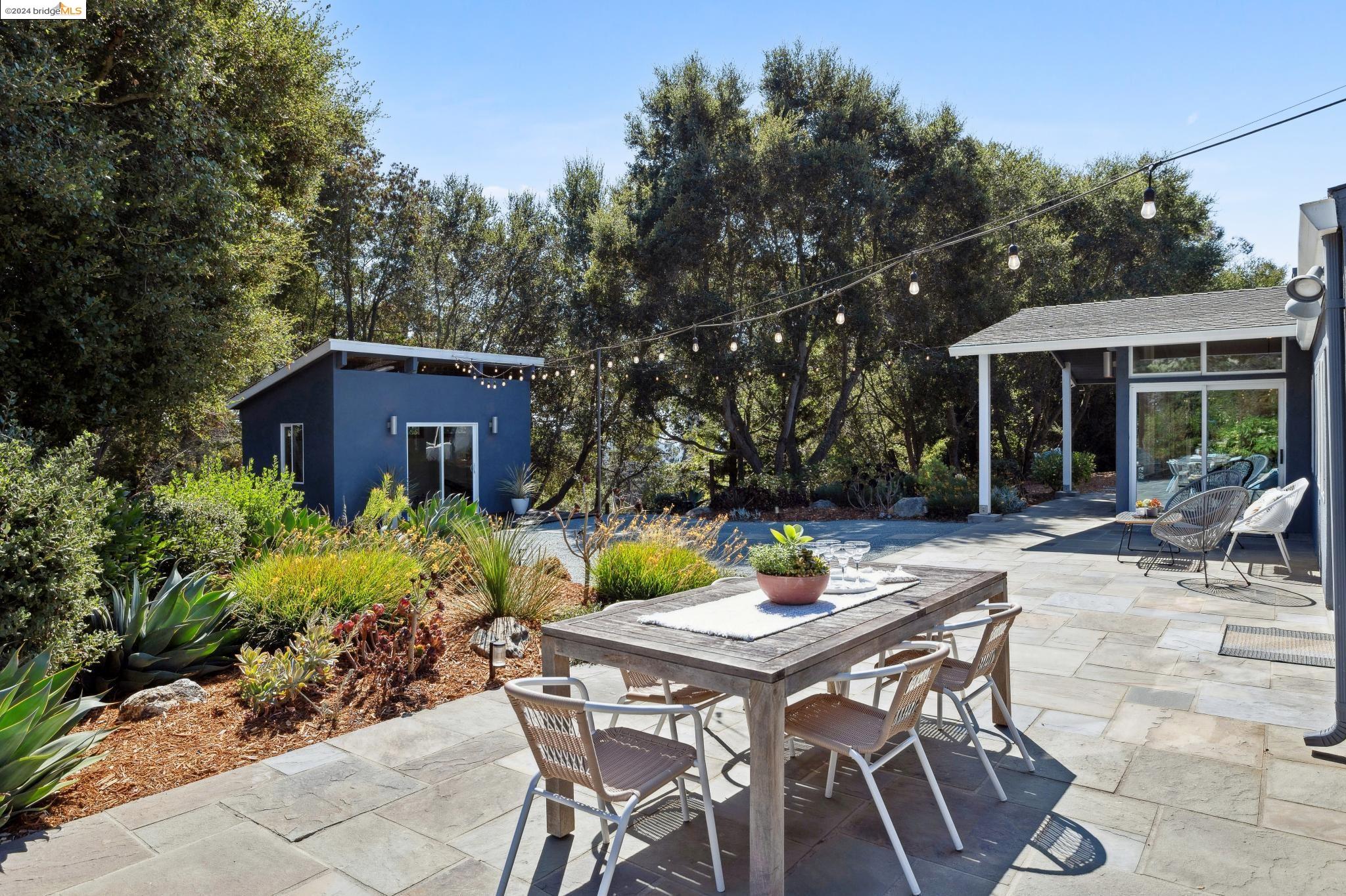 Discreetly nestled on nearly an acre, this superbly landscaped 4-bedroom, 3-bathroom mid-century home is a true showstopper. The spacious foyer connects to the attached garage for easy access. Stylish black slate floors set the tone as the space unfolds into a living room with unobstructed sightlines, a statement fireplace, and a wall of glass framing the natural beauty beyond. An adjacent dining room overlooks the garden, ideal for dinner parties. New white oak floors enhance the single-level floor plan, seamlessly connecting to exceptional outdoor spaces. You'll fall in love with the bluestone patios, sparkling pool, inviting hot tub, and charming detached studio. Winding paths, mature landscaping, veggie beds, and even a chicken coop make this property feel like a private retreat, perfect for relaxation and entertaining. The generous, open kitchen was fully renovated in 2017, featuring a Thermador range, quartz counters, and custom cabinetry. A spacious family room with wet bar accommodates large gatherings, effortlessly opening to the outdoor amenities. Built for John Reading, Oakland's 44th mayor, this 1954 home exemplifies California's indoor-outdoor lifestyle. With its gated entrance, owned solar, and thoughtful design, this unique offering is not to be missed. Come on by!