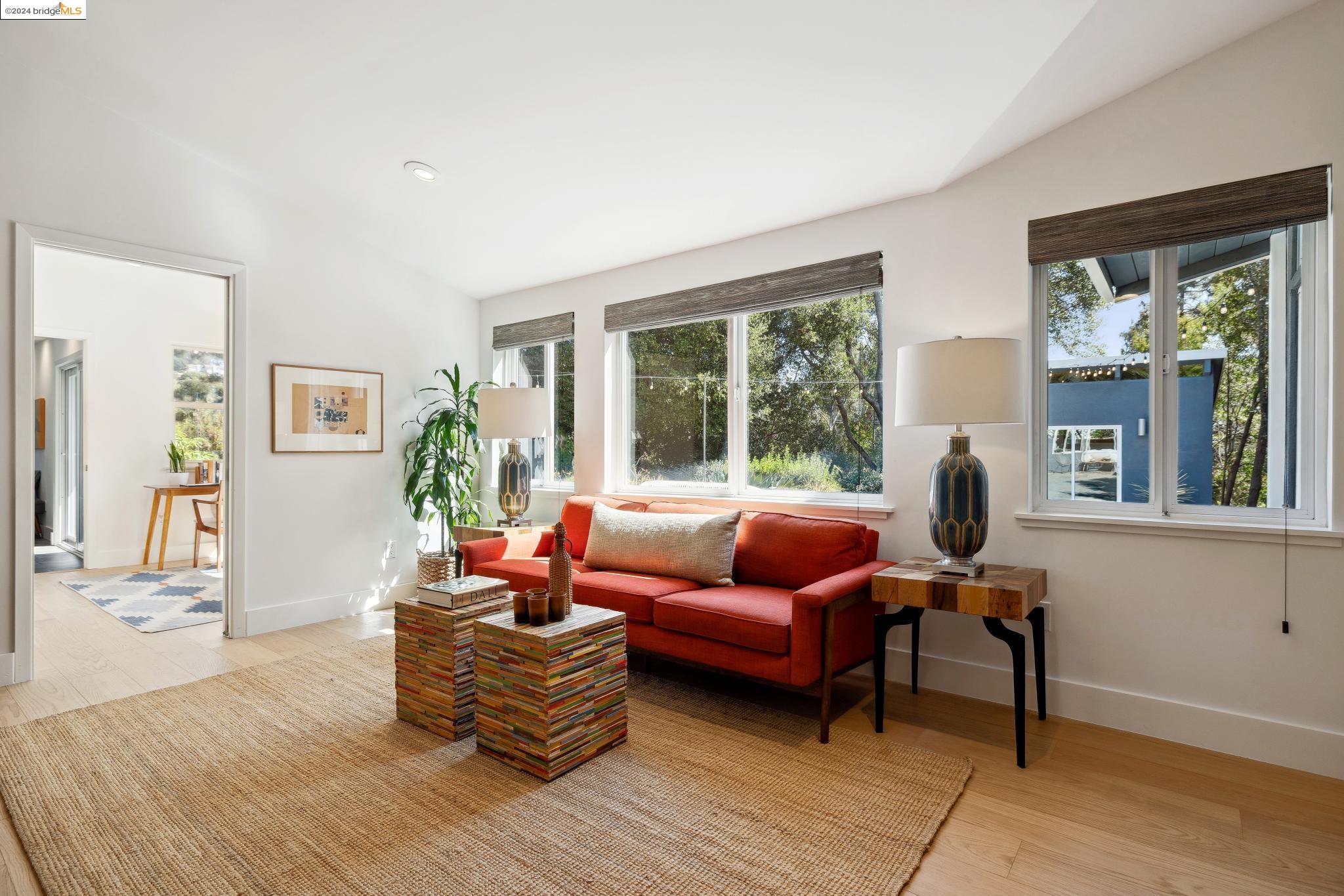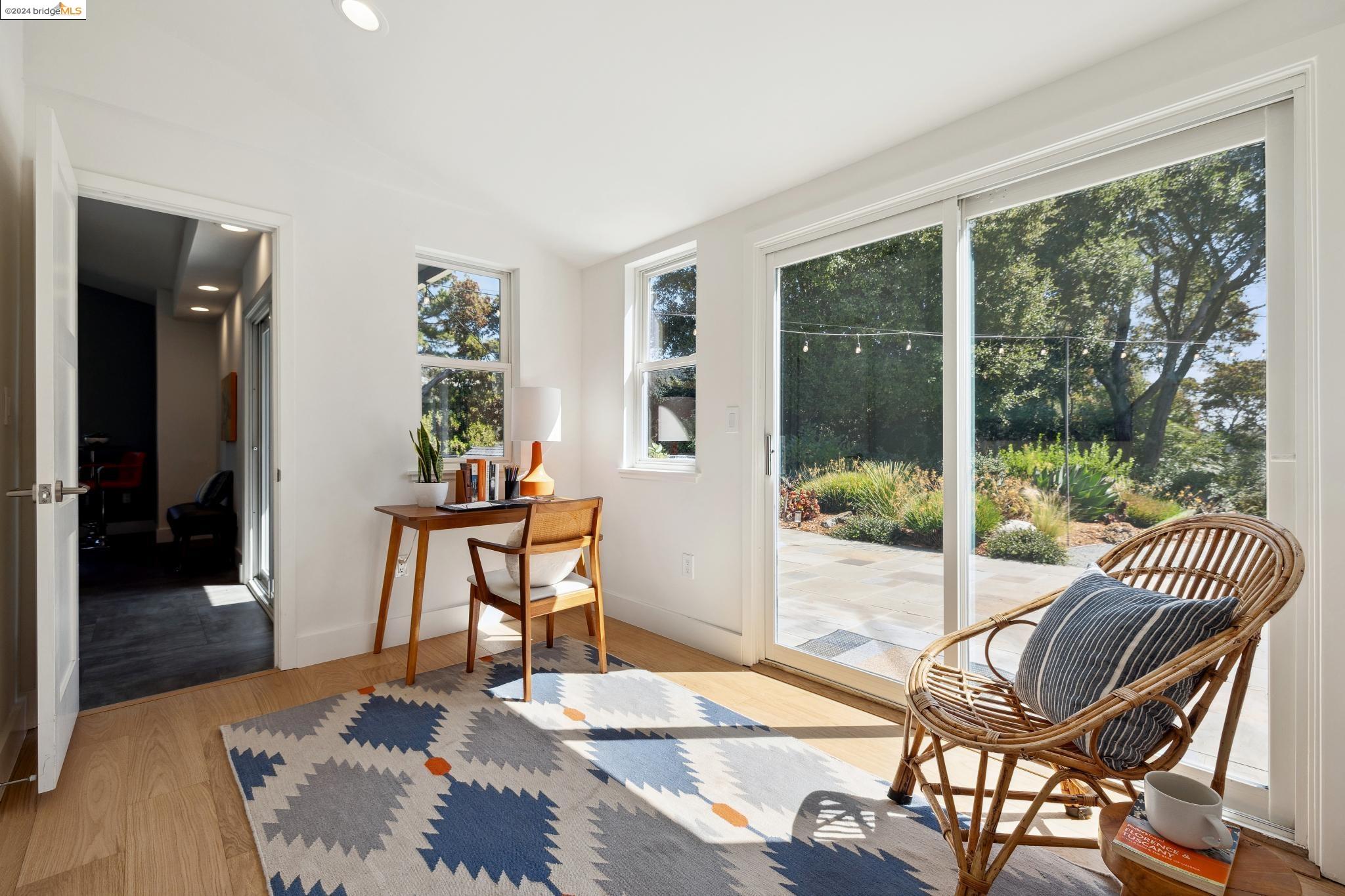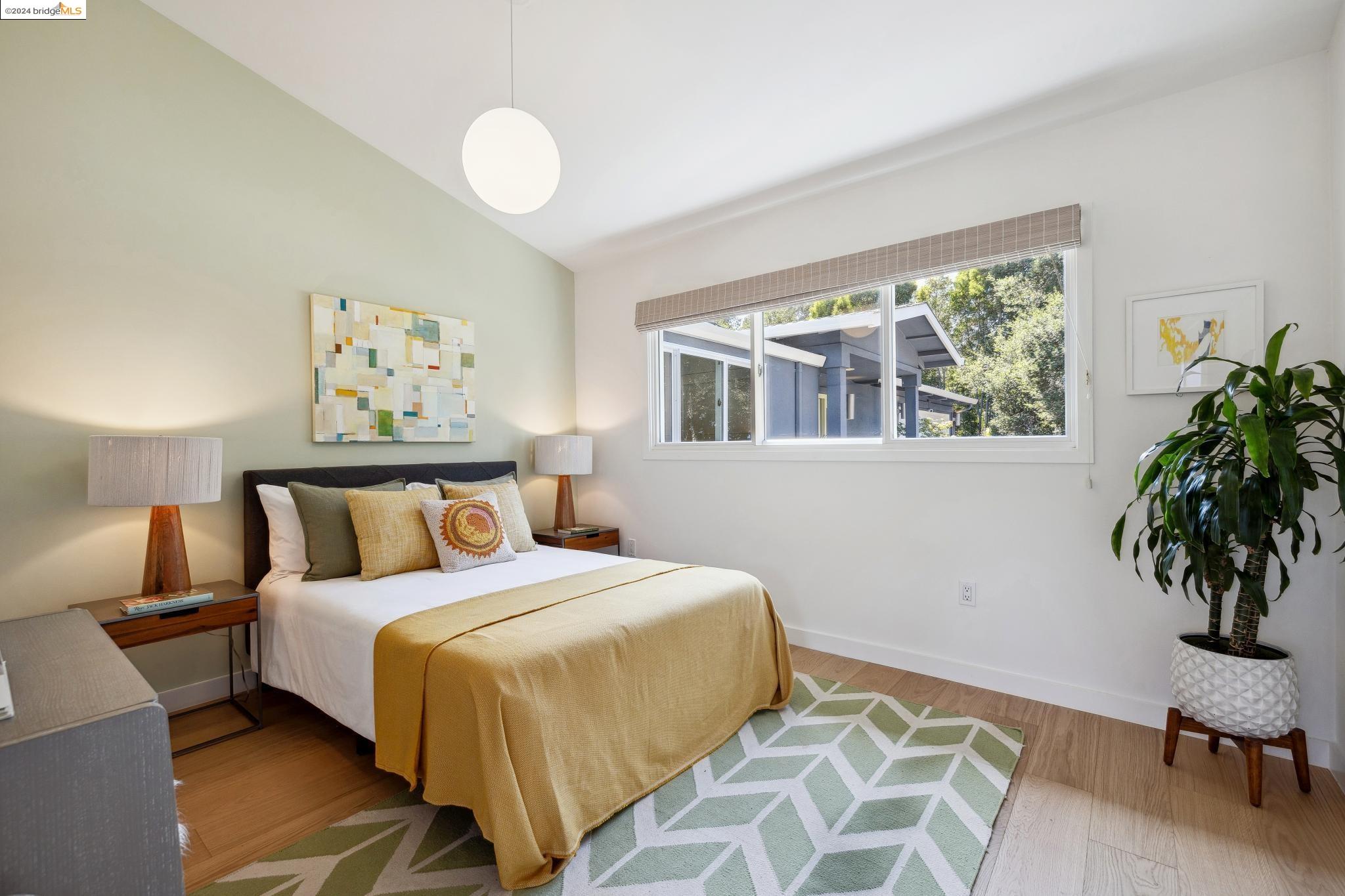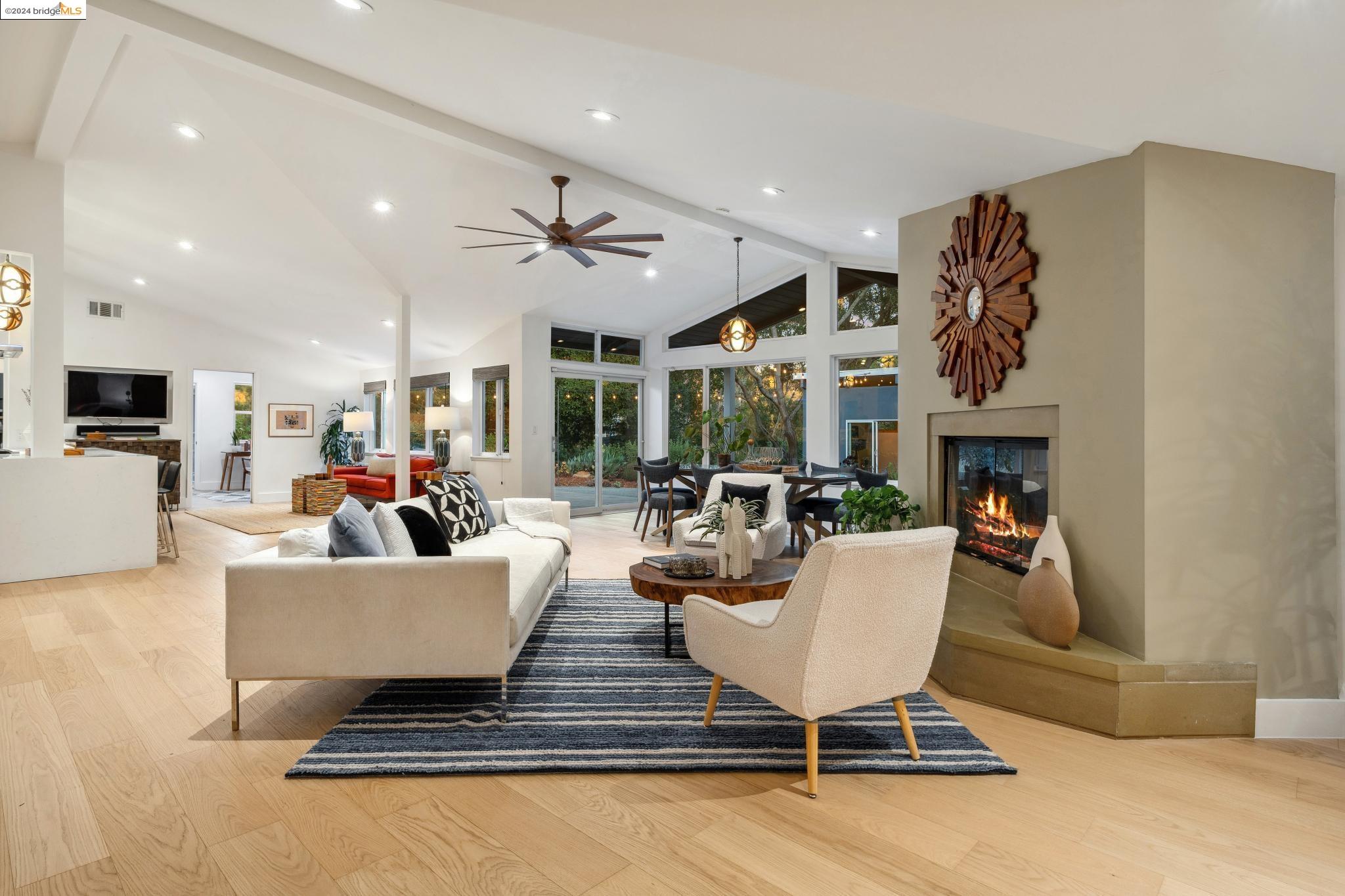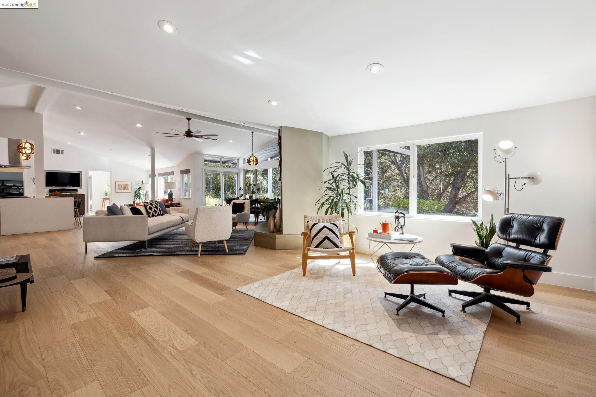 Discreetly nestled on nearly an acre, this superbly landscaped 4-bedroom, 3-bathroom mid-century home is a true showstopper. The spacious foyer connects to the attached garage for easy access. Stylish black slate floors set the tone as the space unfolds into a living room with unobstructed sightlines, a statement fireplace, and a wall of glass framing the natural beauty beyond. An adjacent dining room overlooks the garden, ideal for dinner parties. New white oak floors enhance the single-level floor plan, seamlessly connecting to exceptional outdoor spaces. You'll fall in love with the bluestone patios, sparkling pool, inviting hot tub, and charming detached studio. Winding paths, mature landscaping, veggie beds, and even a chicken coop make this property feel like a private retreat, perfect for relaxation and entertaining. The generous, open kitchen was fully renovated in 2017, featuring a Thermador range, quartz counters, and custom cabinetry. A spacious family room with wet bar accommodates large gatherings, effortlessly opening to the outdoor amenities. Built for John Reading, Oakland's 44th mayor, this 1954 home exemplifies California's indoor-outdoor lifestyle. With its gated entrance, owned solar, and thoughtful design, this unique offering is not to be missed. Come on by!