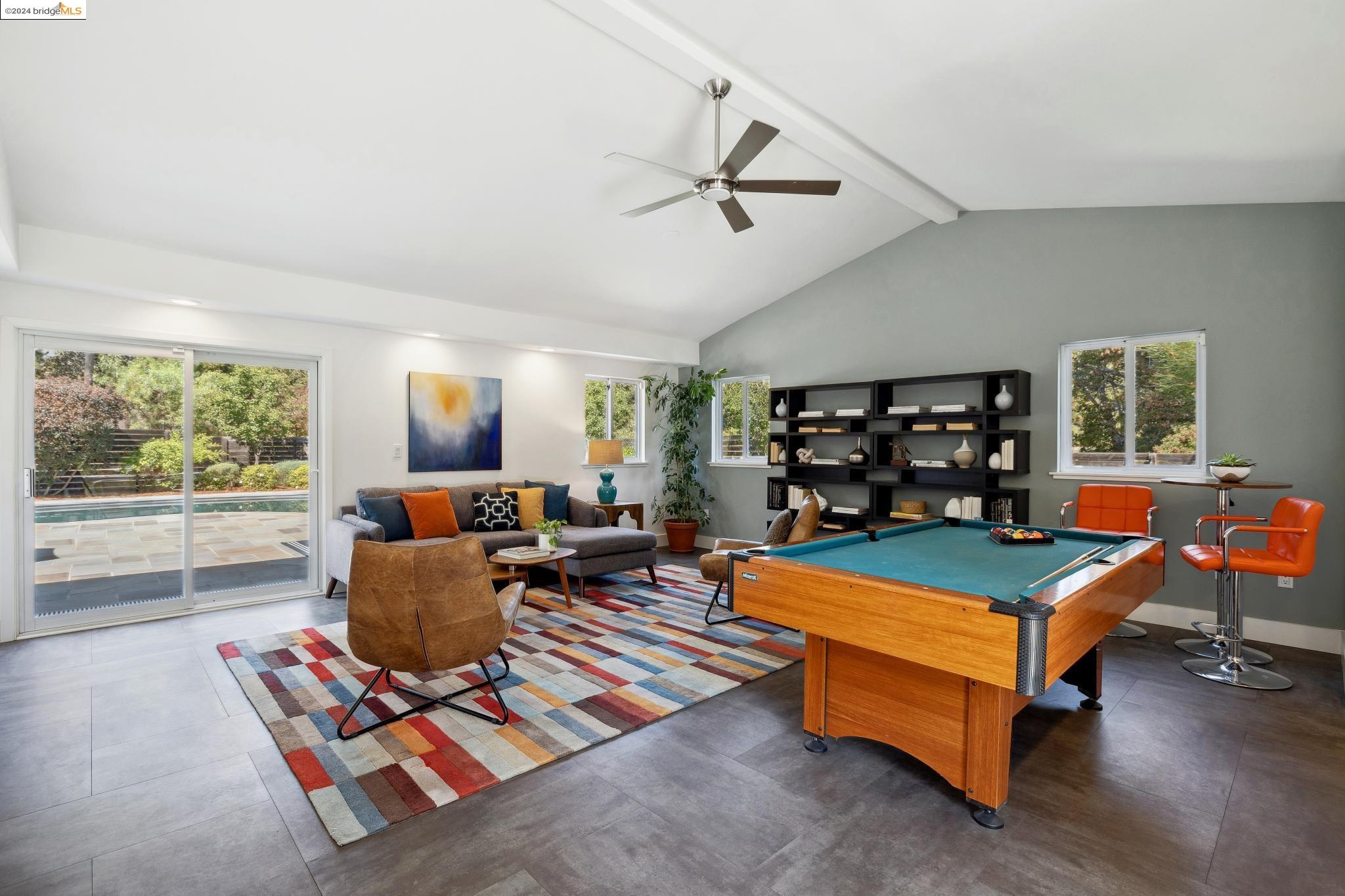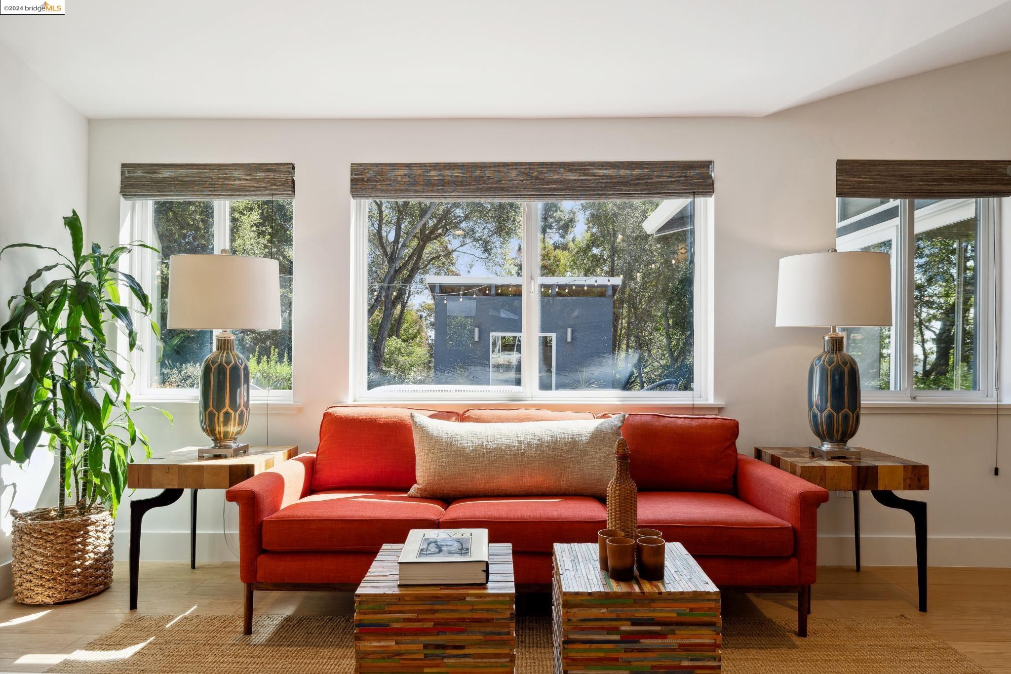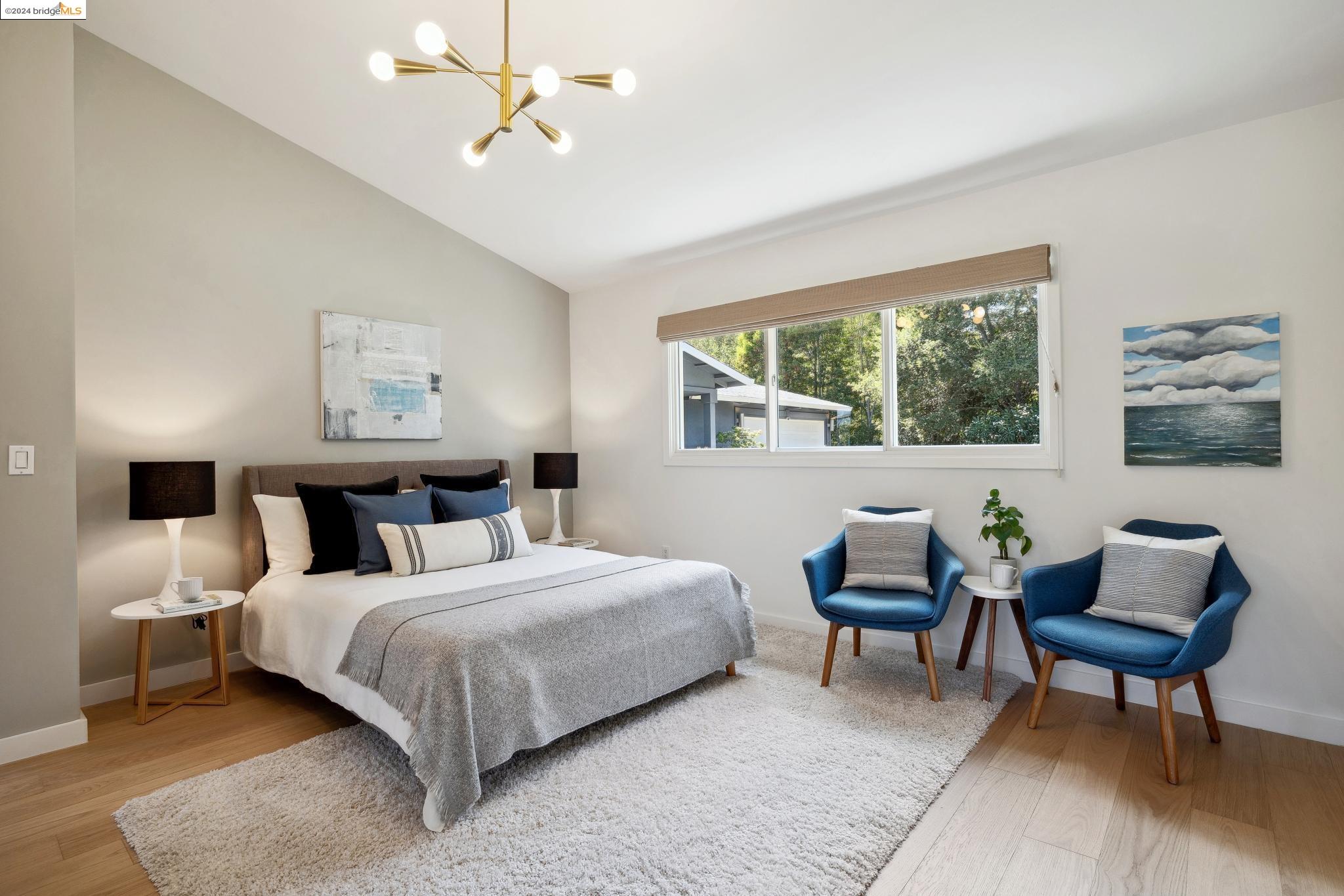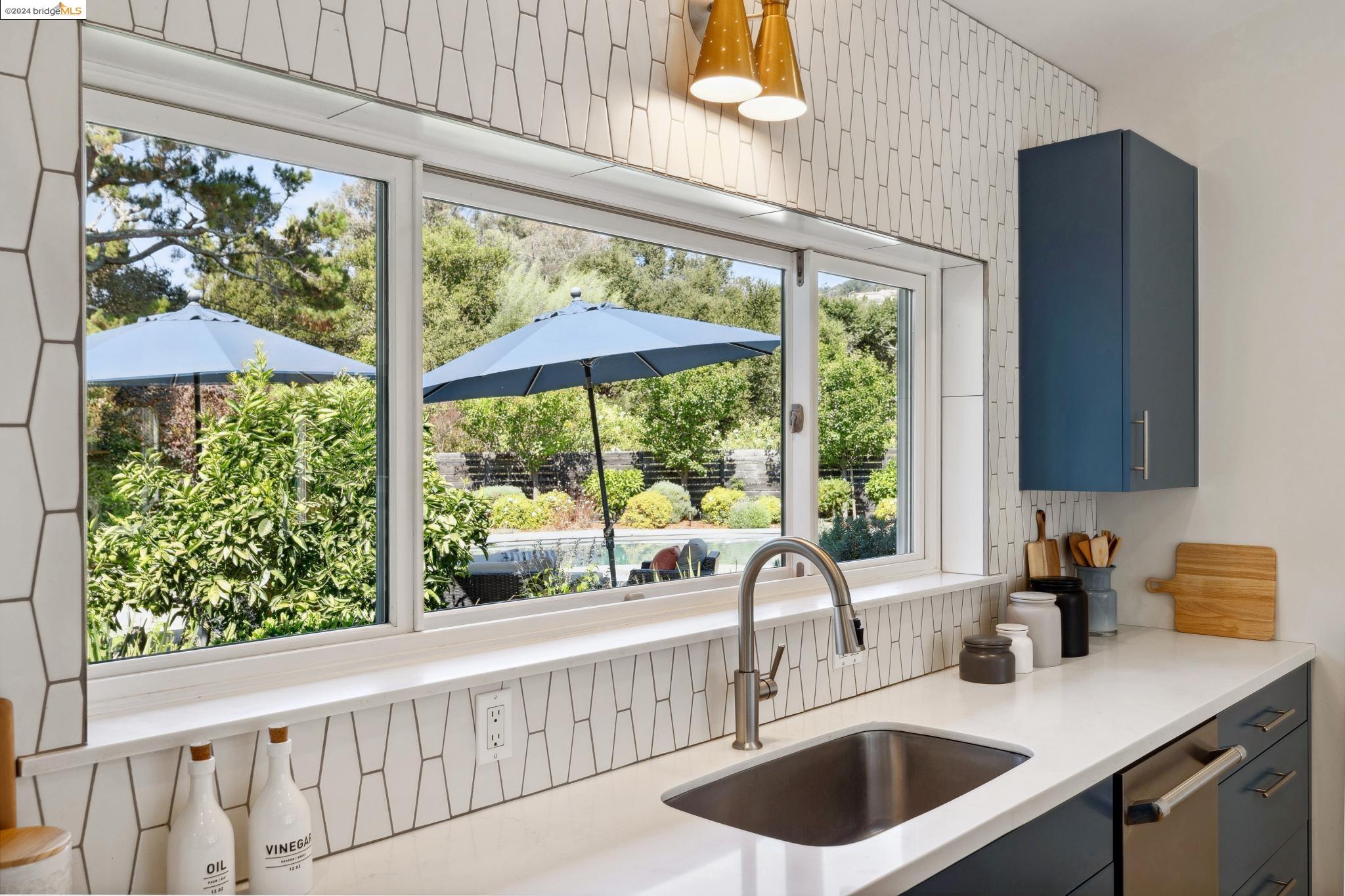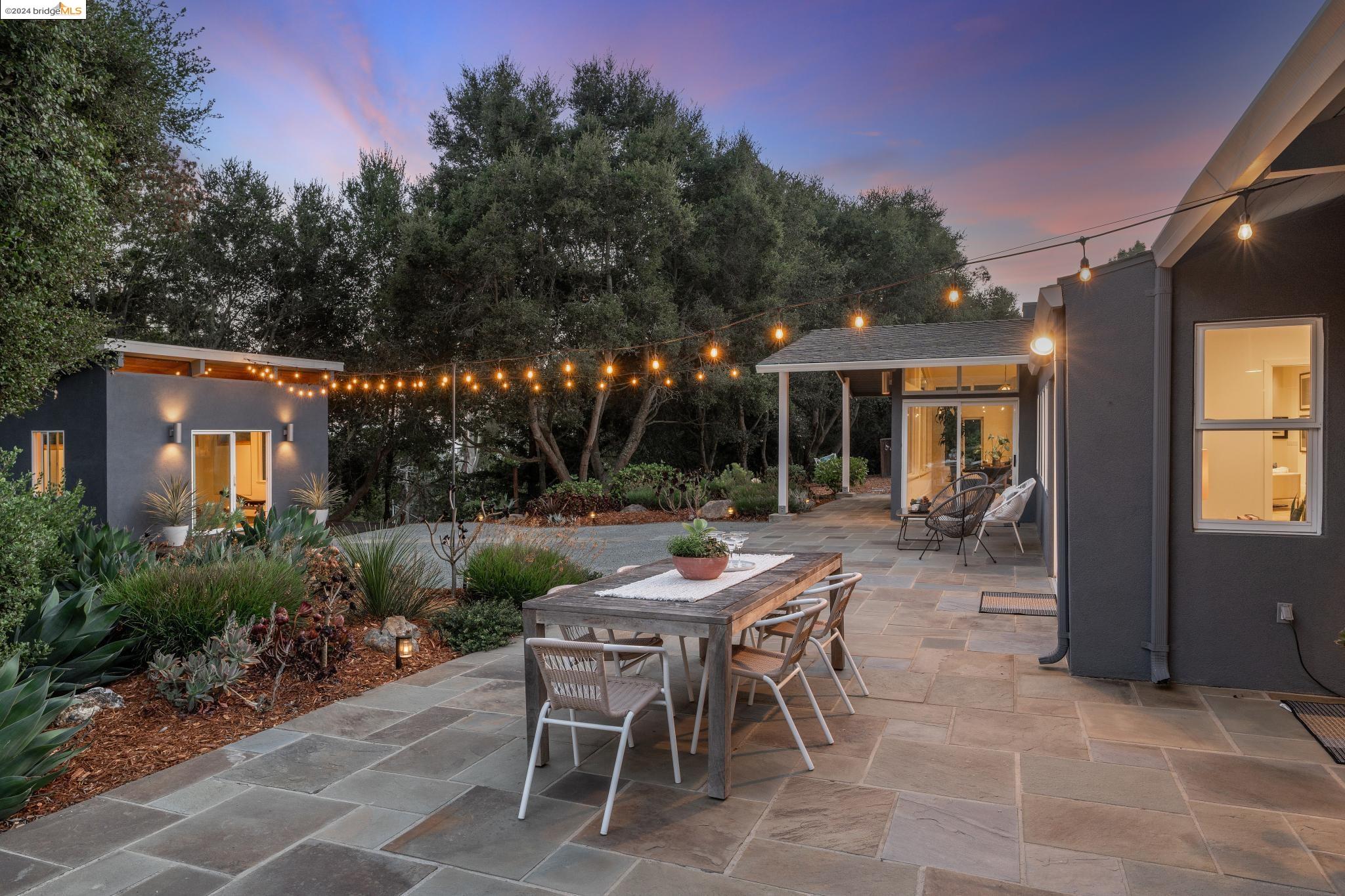 Discreetly nestled on nearly an acre, this superbly landscaped 4-bedroom, 3-bathroom mid-century home is a true showstopper. The spacious foyer connects to the attached garage for easy access. Stylish black slate floors set the tone as the space unfolds into a living room with unobstructed sightlines, a statement fireplace, and a wall of glass framing the natural beauty beyond. An adjacent dining room overlooks the garden, ideal for dinner parties. New white oak floors enhance the single-level floor plan, seamlessly connecting to exceptional outdoor spaces. You'll fall in love with the bluestone patios, sparkling pool, inviting hot tub, and charming detached studio. Winding paths, mature landscaping, veggie beds, and even a chicken coop make this property feel like a private retreat, perfect for relaxation and entertaining. The generous, open kitchen was fully renovated in 2017, featuring a Thermador range, quartz counters, and custom cabinetry. A spacious family room with wet bar accommodates large gatherings, effortlessly opening to the outdoor amenities. Built for John Reading, Oakland's 44th mayor, this 1954 home exemplifies California's indoor-outdoor lifestyle. With its gated entrance, owned solar, and thoughtful design, this unique offering is not to be missed. Come on by!