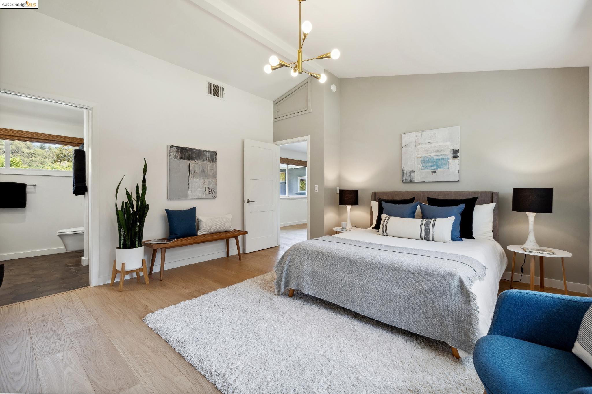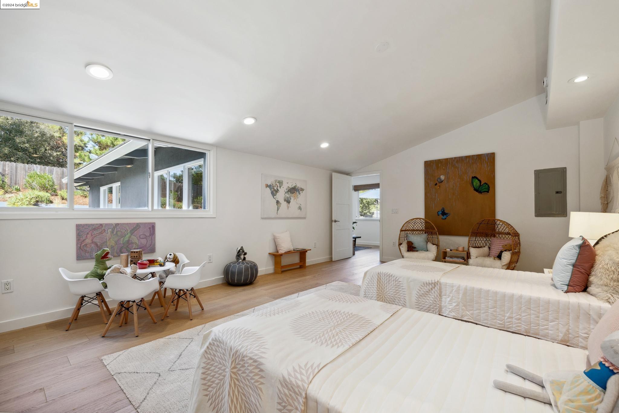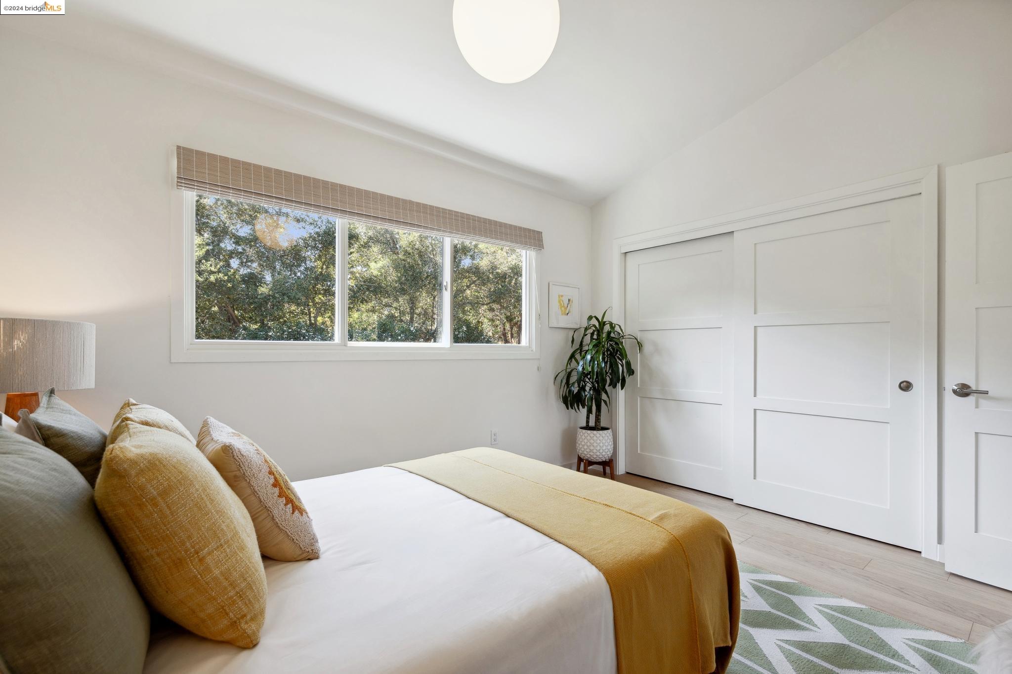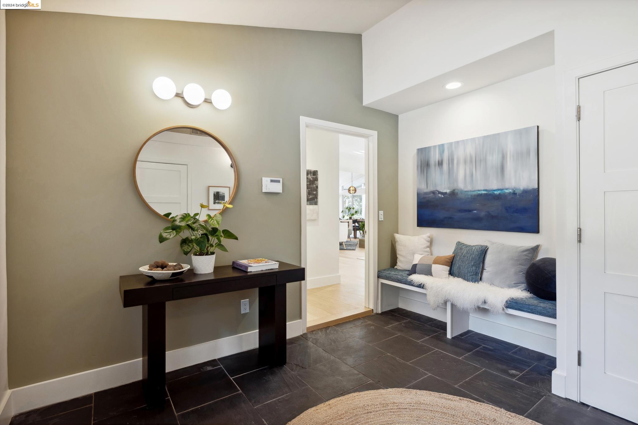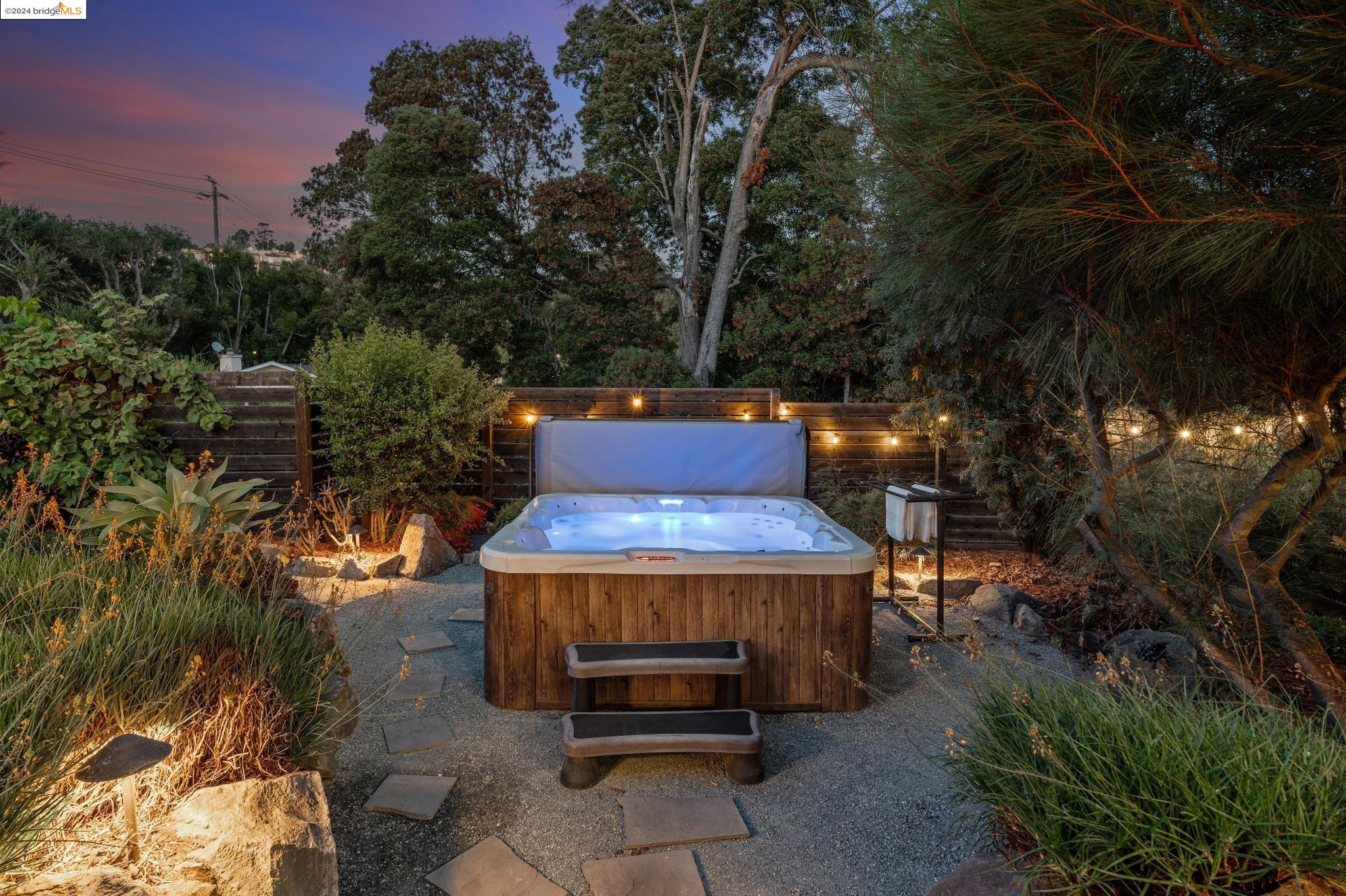 Discreetly nestled on nearly an acre, this superbly landscaped 4-bedroom, 3-bathroom mid-century home is a true showstopper. The spacious foyer connects to the attached garage for easy access. Stylish black slate floors set the tone as the space unfolds into a living room with unobstructed sightlines, a statement fireplace, and a wall of glass framing the natural beauty beyond. An adjacent dining room overlooks the garden, ideal for dinner parties. New white oak floors enhance the single-level floor plan, seamlessly connecting to exceptional outdoor spaces. You'll fall in love with the bluestone patios, sparkling pool, inviting hot tub, and charming detached studio. Winding paths, mature landscaping, veggie beds, and even a chicken coop make this property feel like a private retreat, perfect for relaxation and entertaining. The generous, open kitchen was fully renovated in 2017, featuring a Thermador range, quartz counters, and custom cabinetry. A spacious family room with wet bar accommodates large gatherings, effortlessly opening to the outdoor amenities. Built for John Reading, Oakland's 44th mayor, this 1954 home exemplifies California's indoor-outdoor lifestyle. With its gated entrance, owned solar, and thoughtful design, this unique offering is not to be missed. Come on by!
