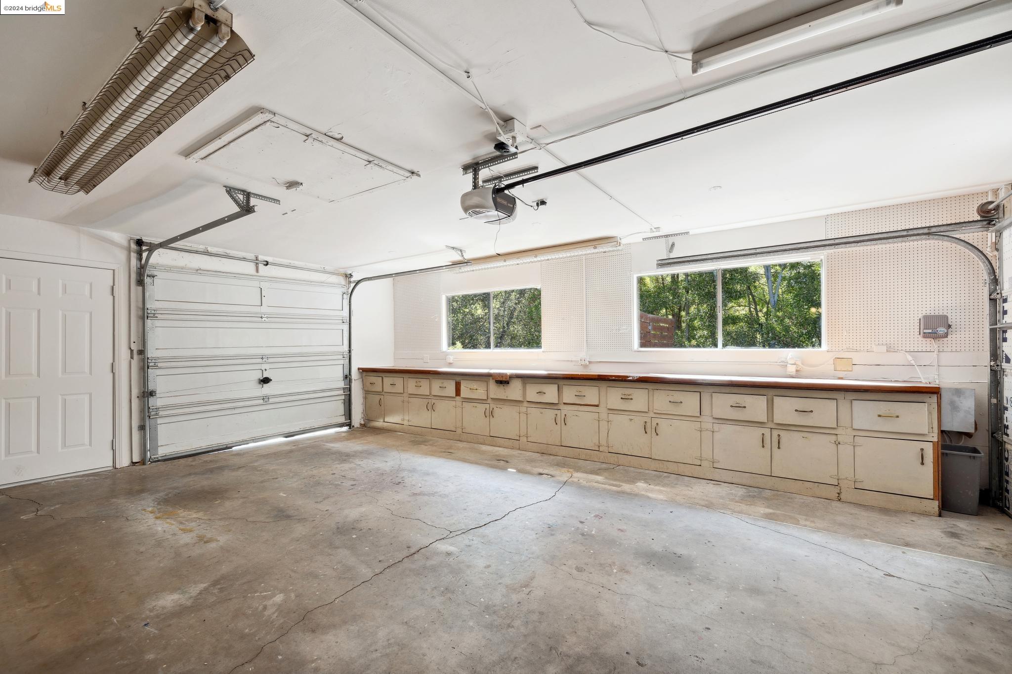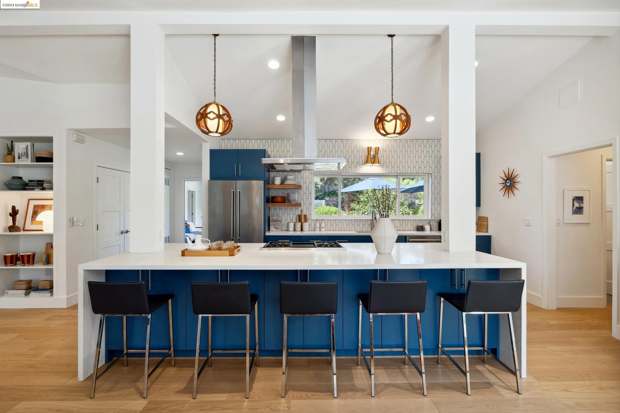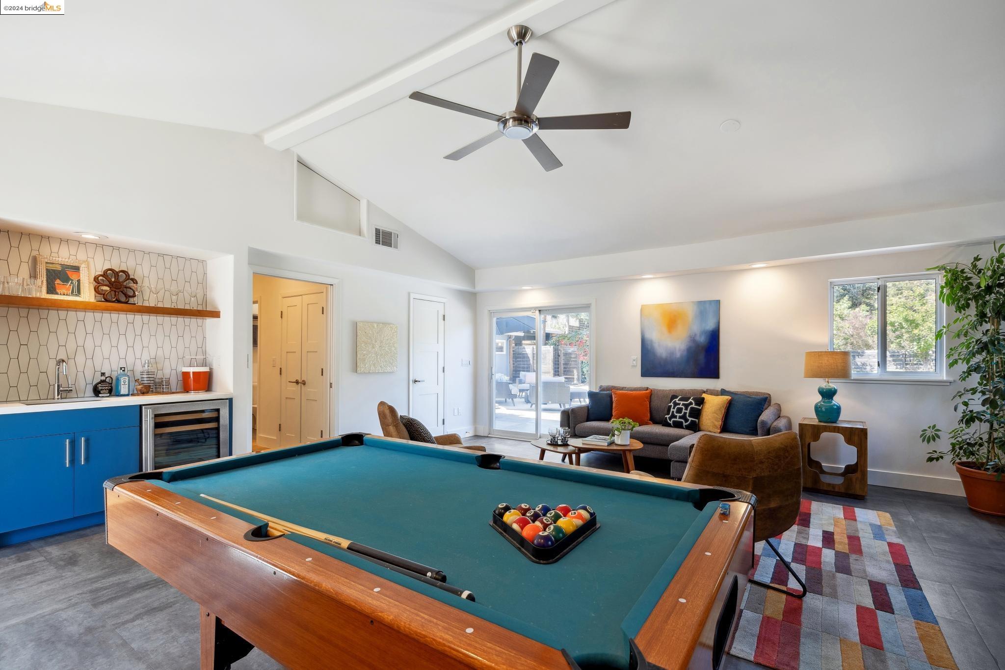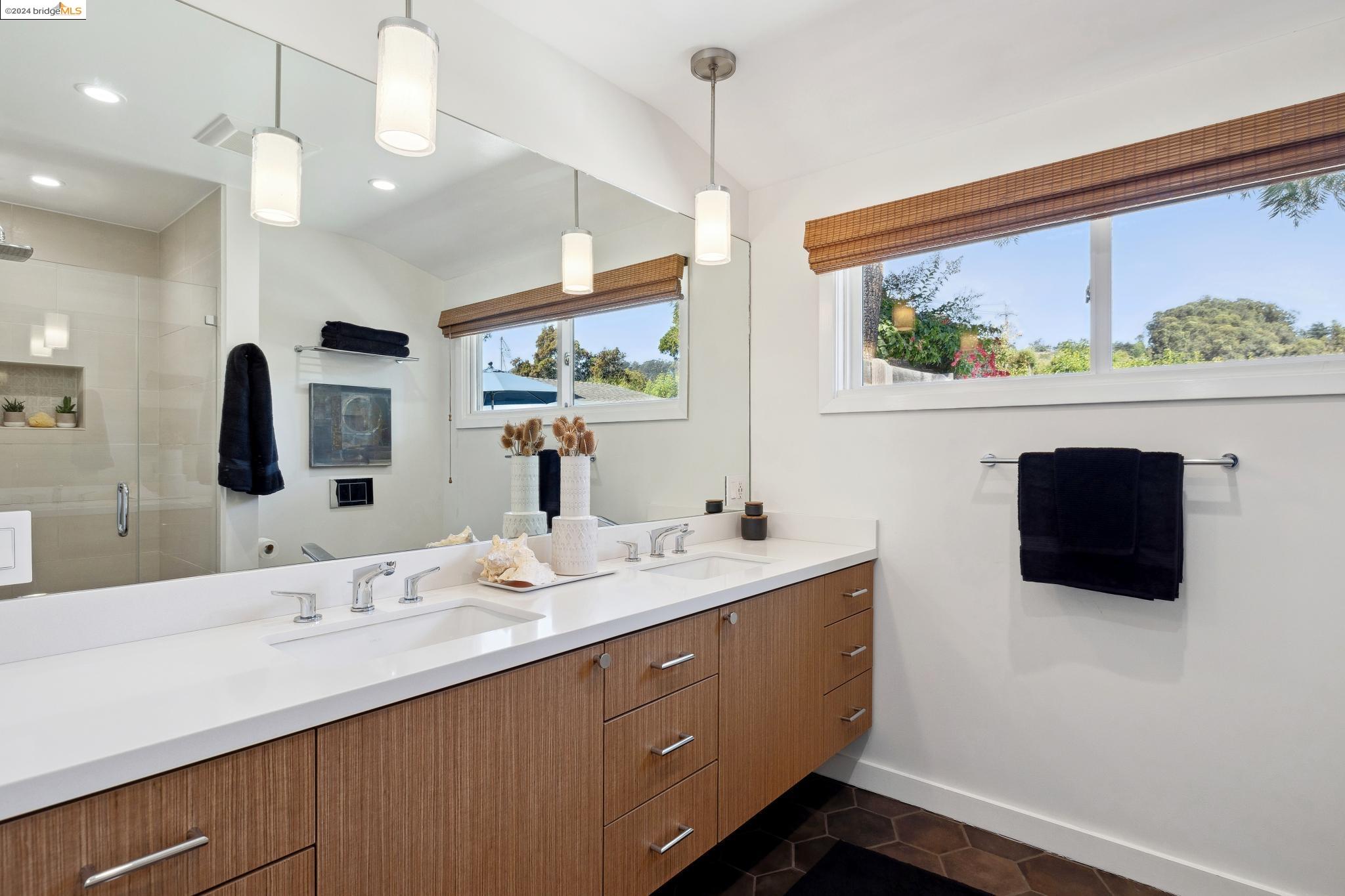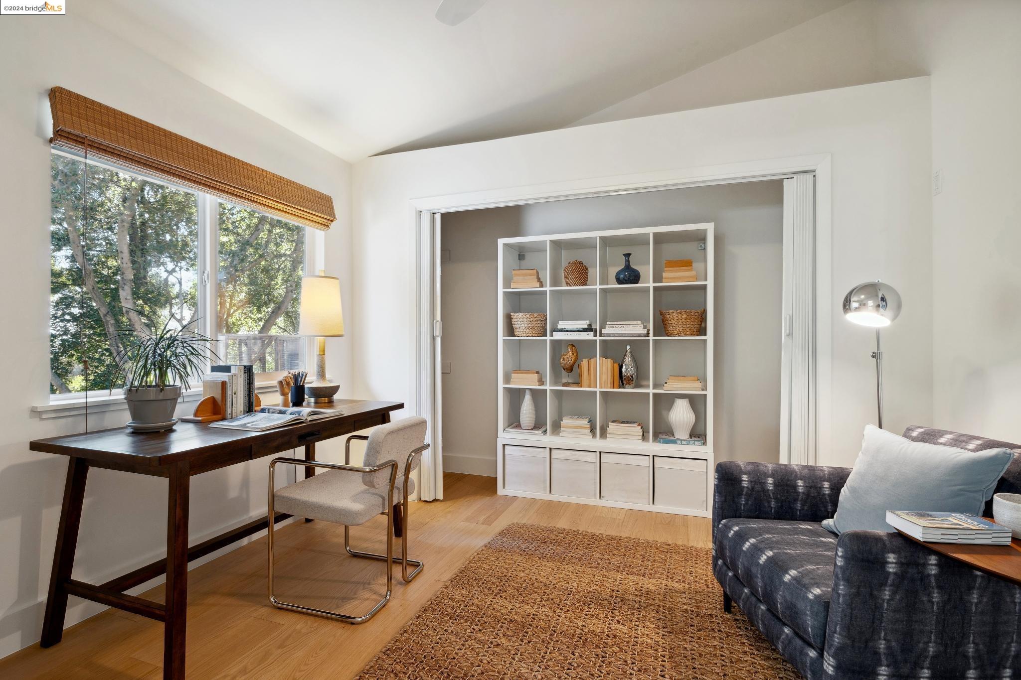 Discreetly nestled on nearly an acre, this superbly landscaped 4-bedroom, 3-bathroom mid-century home is a true showstopper. The spacious foyer connects to the attached garage for easy access. Stylish black slate floors set the tone as the space unfolds into a living room with unobstructed sightlines, a statement fireplace, and a wall of glass framing the natural beauty beyond. An adjacent dining room overlooks the garden, ideal for dinner parties. New white oak floors enhance the single-level floor plan, seamlessly connecting to exceptional outdoor spaces. You'll fall in love with the bluestone patios, sparkling pool, inviting hot tub, and charming detached studio. Winding paths, mature landscaping, veggie beds, and even a chicken coop make this property feel like a private retreat, perfect for relaxation and entertaining. The generous, open kitchen was fully renovated in 2017, featuring a Thermador range, quartz counters, and custom cabinetry. A spacious family room with wet bar accommodates large gatherings, effortlessly opening to the outdoor amenities. Built for John Reading, Oakland's 44th mayor, this 1954 home exemplifies California's indoor-outdoor lifestyle. With its gated entrance, owned solar, and thoughtful design, this unique offering is not to be missed. Come on by!