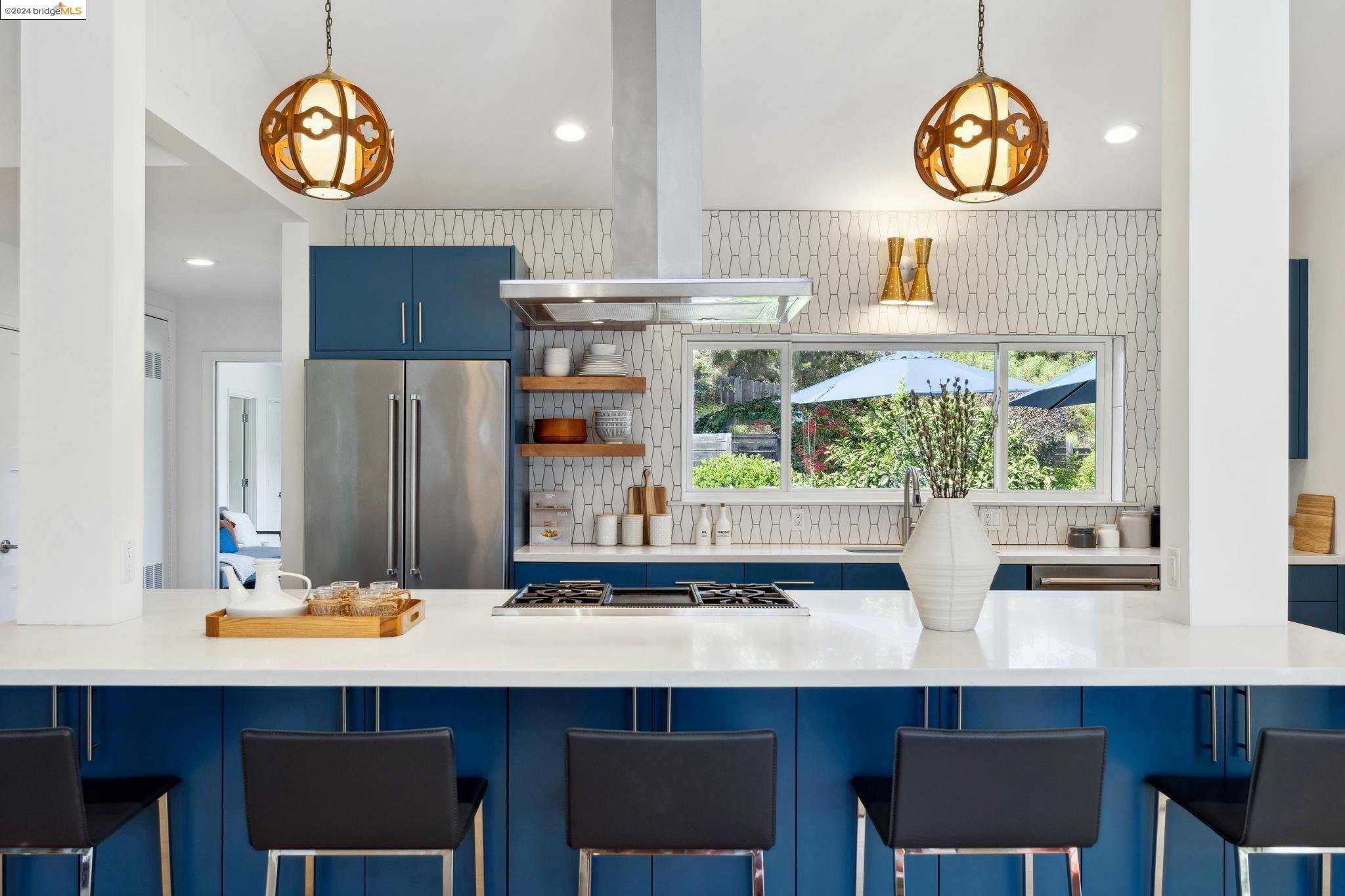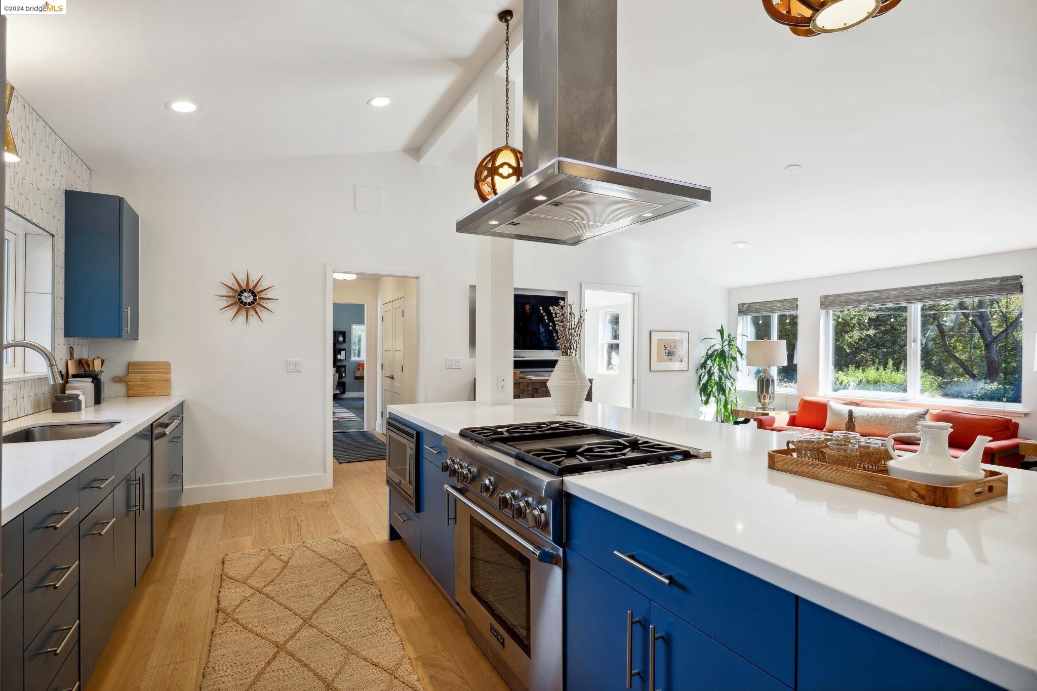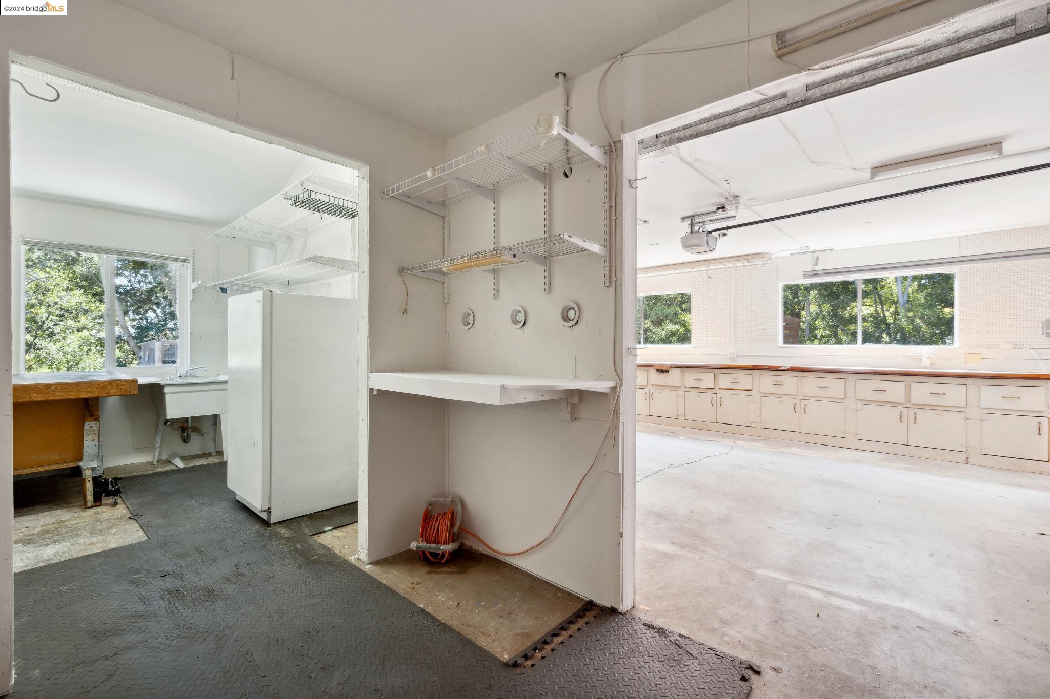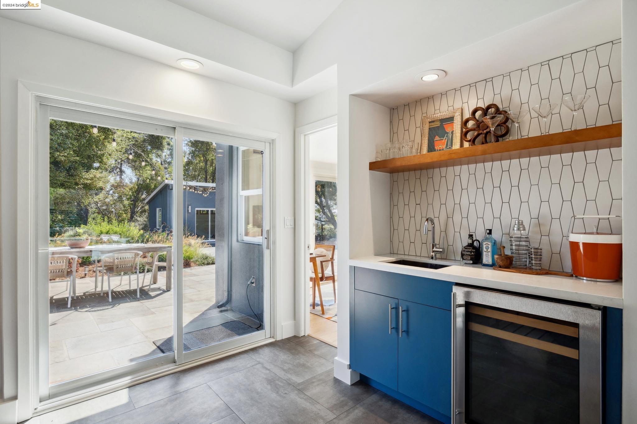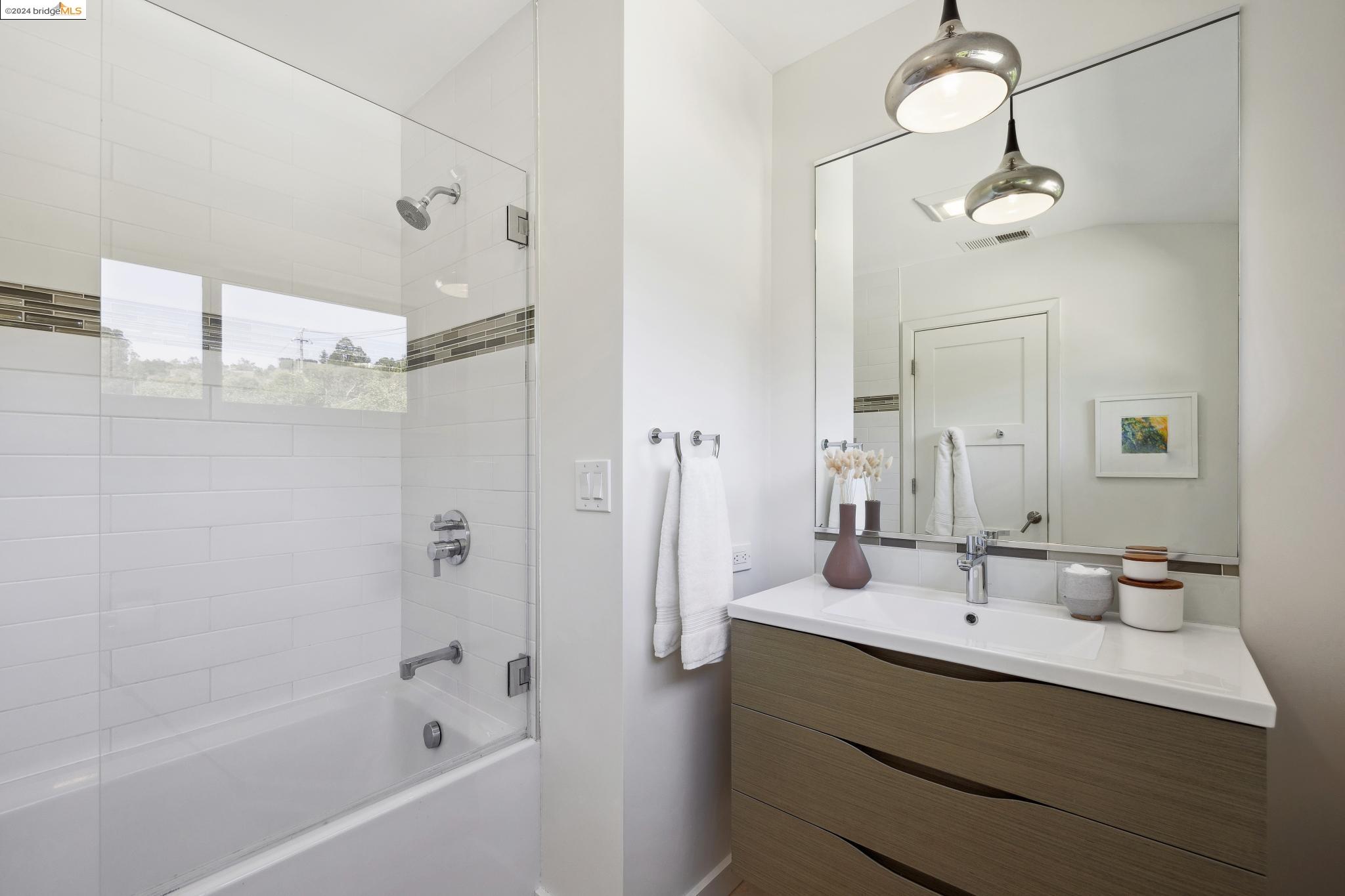 Discreetly nestled on nearly an acre, this superbly landscaped 4-bedroom, 3-bathroom mid-century home is a true showstopper. The spacious foyer connects to the attached garage for easy access. Stylish black slate floors set the tone as the space unfolds into a living room with unobstructed sightlines, a statement fireplace, and a wall of glass framing the natural beauty beyond. An adjacent dining room overlooks the garden, ideal for dinner parties. New white oak floors enhance the single-level floor plan, seamlessly connecting to exceptional outdoor spaces. You'll fall in love with the bluestone patios, sparkling pool, inviting hot tub, and charming detached studio. Winding paths, mature landscaping, veggie beds, and even a chicken coop make this property feel like a private retreat, perfect for relaxation and entertaining. The generous, open kitchen was fully renovated in 2017, featuring a Thermador range, quartz counters, and custom cabinetry. A spacious family room with wet bar accommodates large gatherings, effortlessly opening to the outdoor amenities. Built for John Reading, Oakland's 44th mayor, this 1954 home exemplifies California's indoor-outdoor lifestyle. With its gated entrance, owned solar, and thoughtful design, this unique offering is not to be missed. Come on by!
