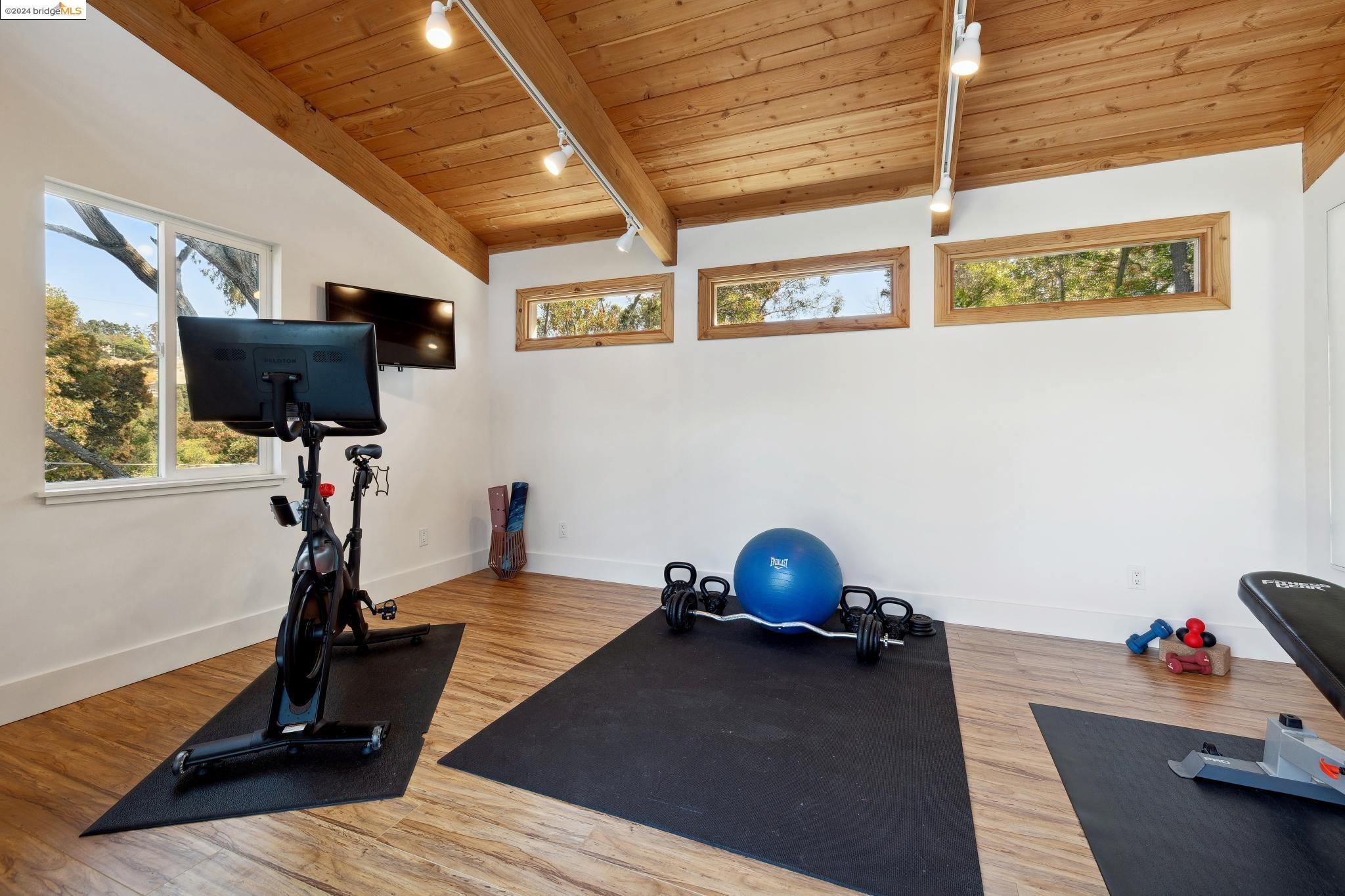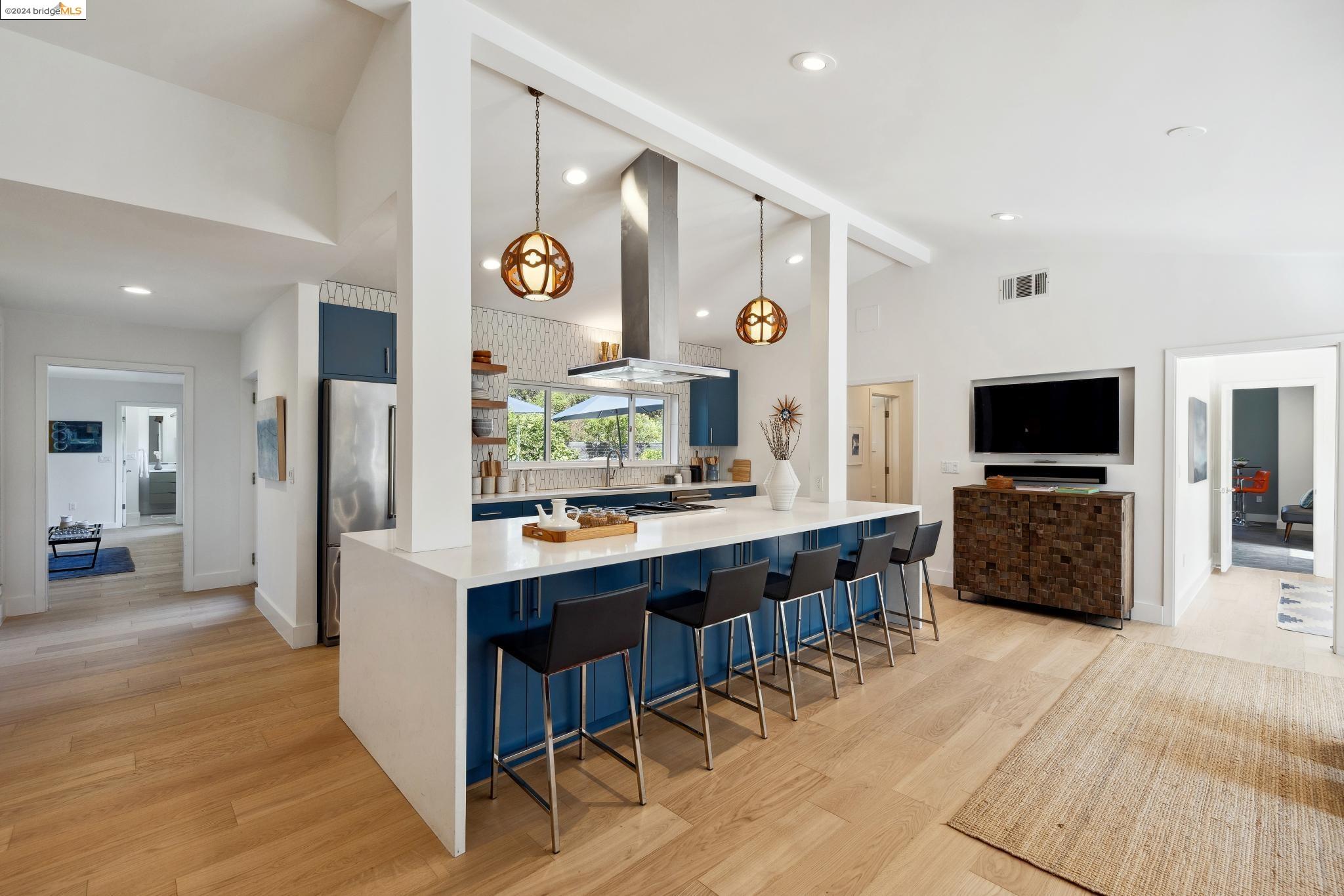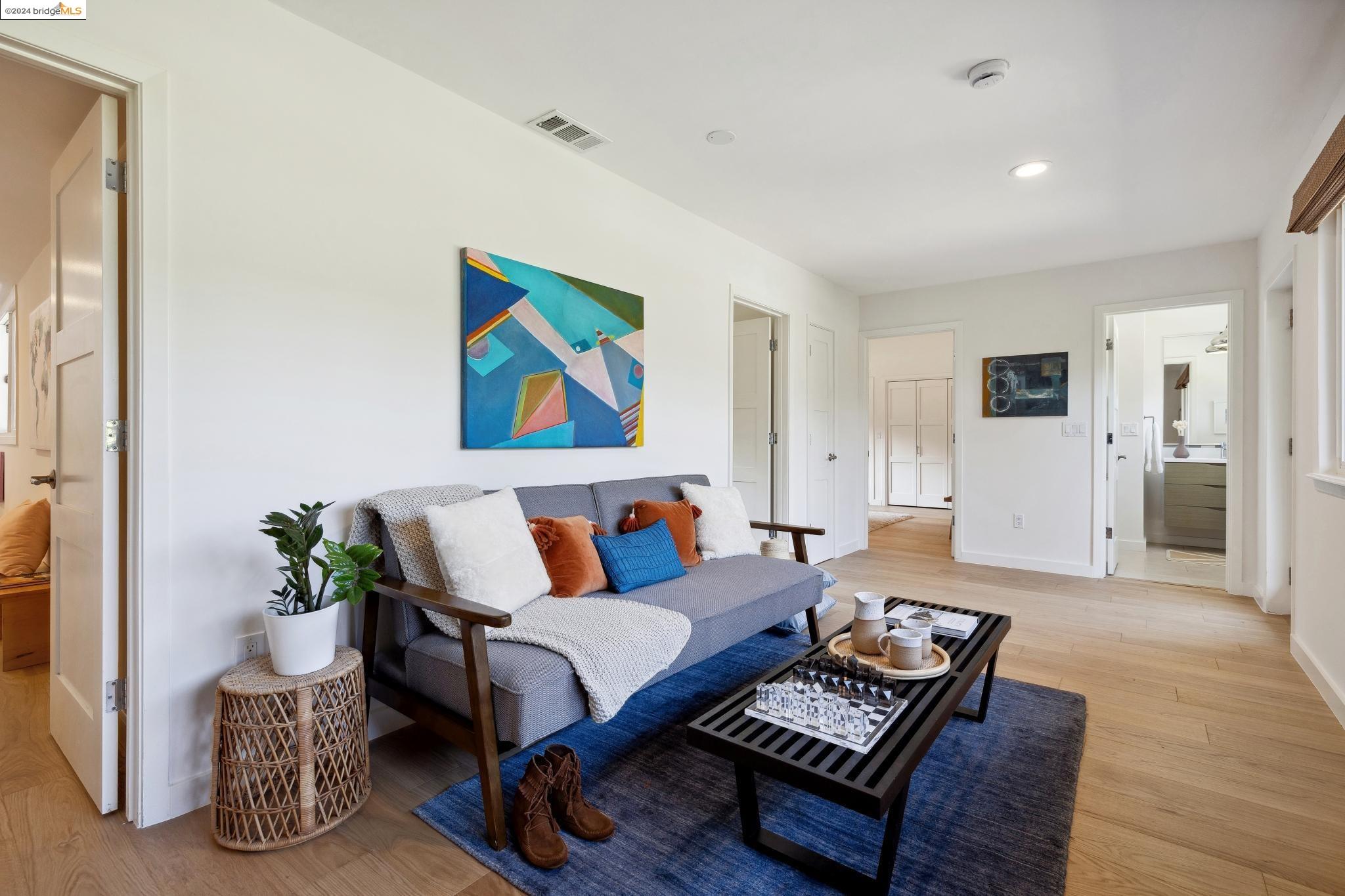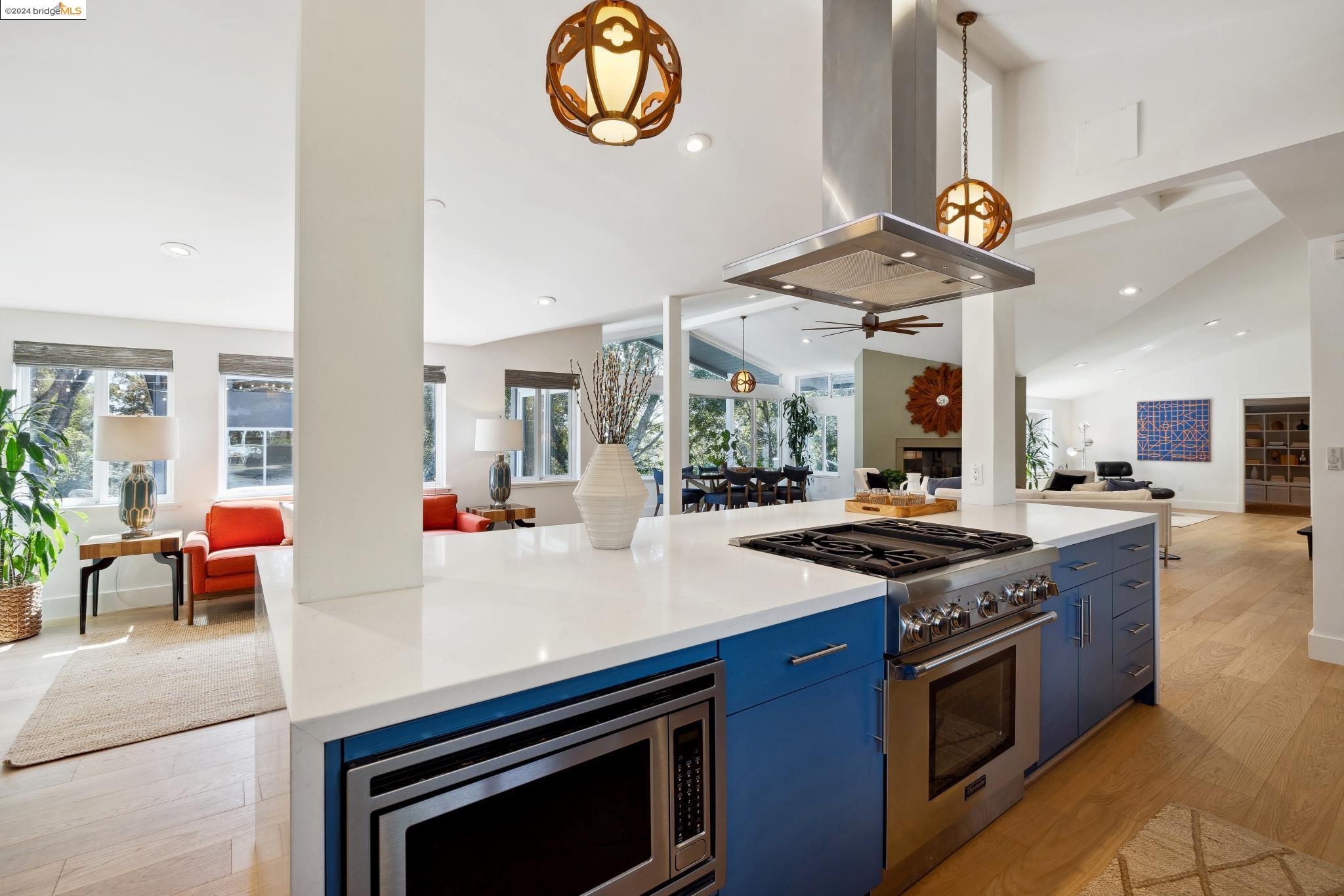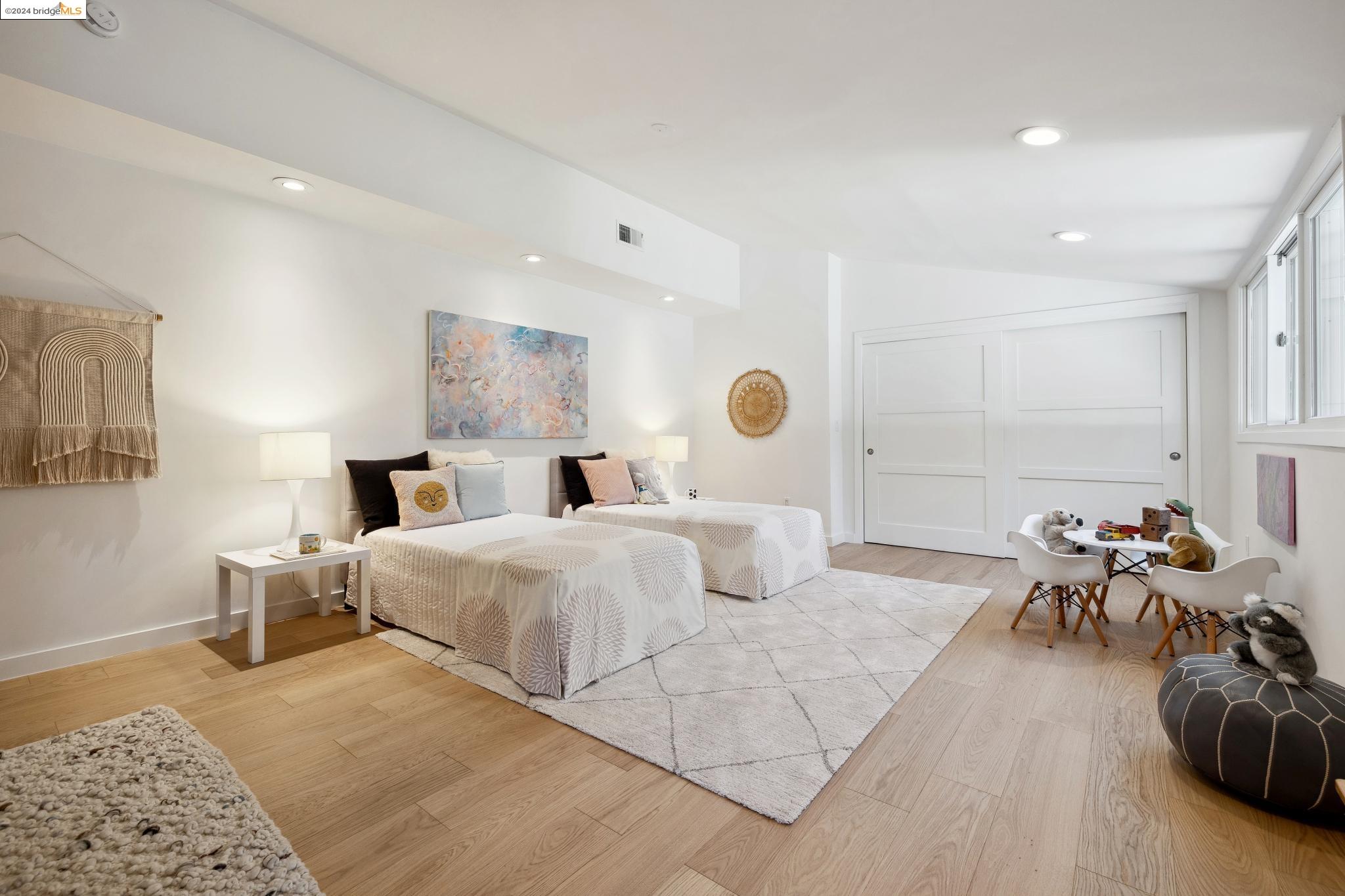 Discreetly nestled on nearly an acre, this superbly landscaped 4-bedroom, 3-bathroom mid-century home is a true showstopper. The spacious foyer connects to the attached garage for easy access. Stylish black slate floors set the tone as the space unfolds into a living room with unobstructed sightlines, a statement fireplace, and a wall of glass framing the natural beauty beyond. An adjacent dining room overlooks the garden, ideal for dinner parties. New white oak floors enhance the single-level floor plan, seamlessly connecting to exceptional outdoor spaces. You'll fall in love with the bluestone patios, sparkling pool, inviting hot tub, and charming detached studio. Winding paths, mature landscaping, veggie beds, and even a chicken coop make this property feel like a private retreat, perfect for relaxation and entertaining. The generous, open kitchen was fully renovated in 2017, featuring a Thermador range, quartz counters, and custom cabinetry. A spacious family room with wet bar accommodates large gatherings, effortlessly opening to the outdoor amenities. Built for John Reading, Oakland's 44th mayor, this 1954 home exemplifies California's indoor-outdoor lifestyle. With its gated entrance, owned solar, and thoughtful design, this unique offering is not to be missed. Come on by!