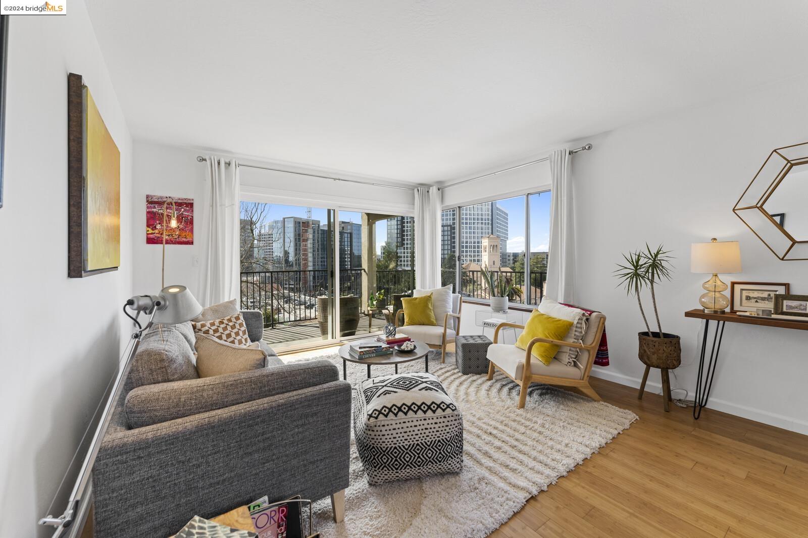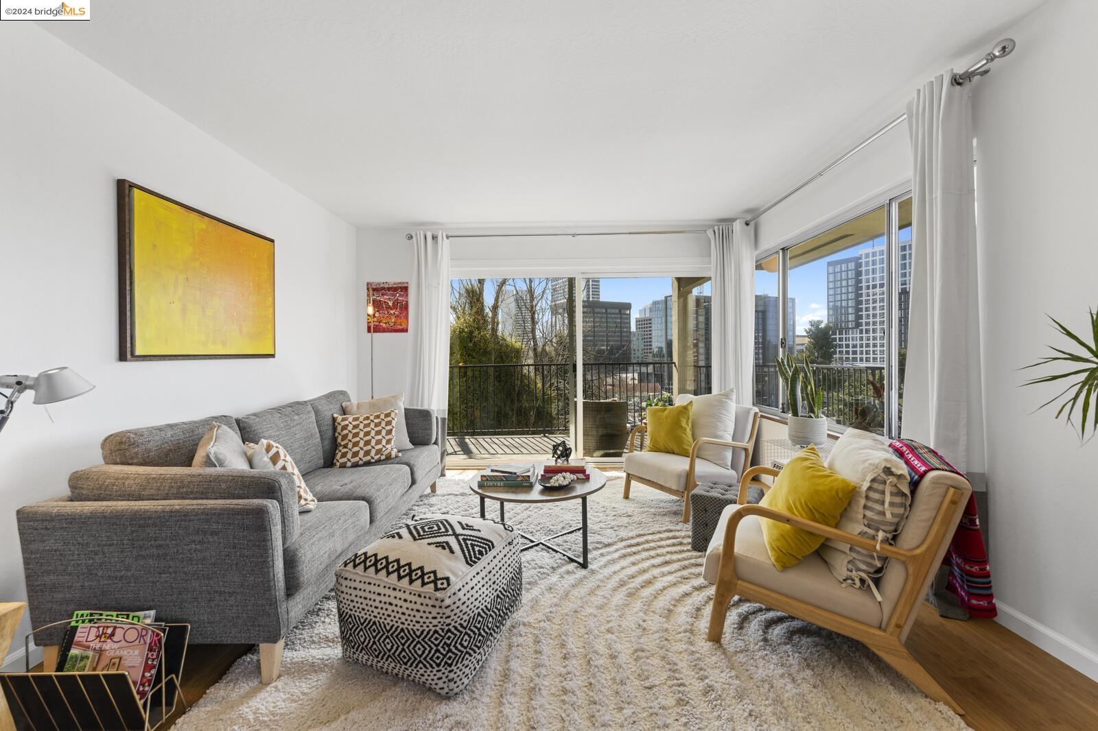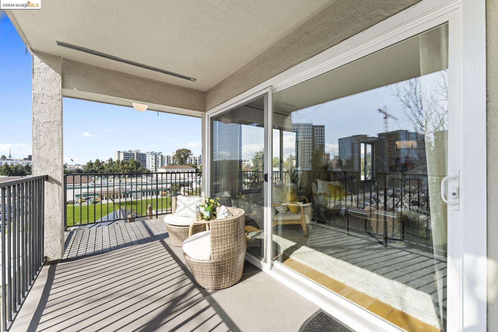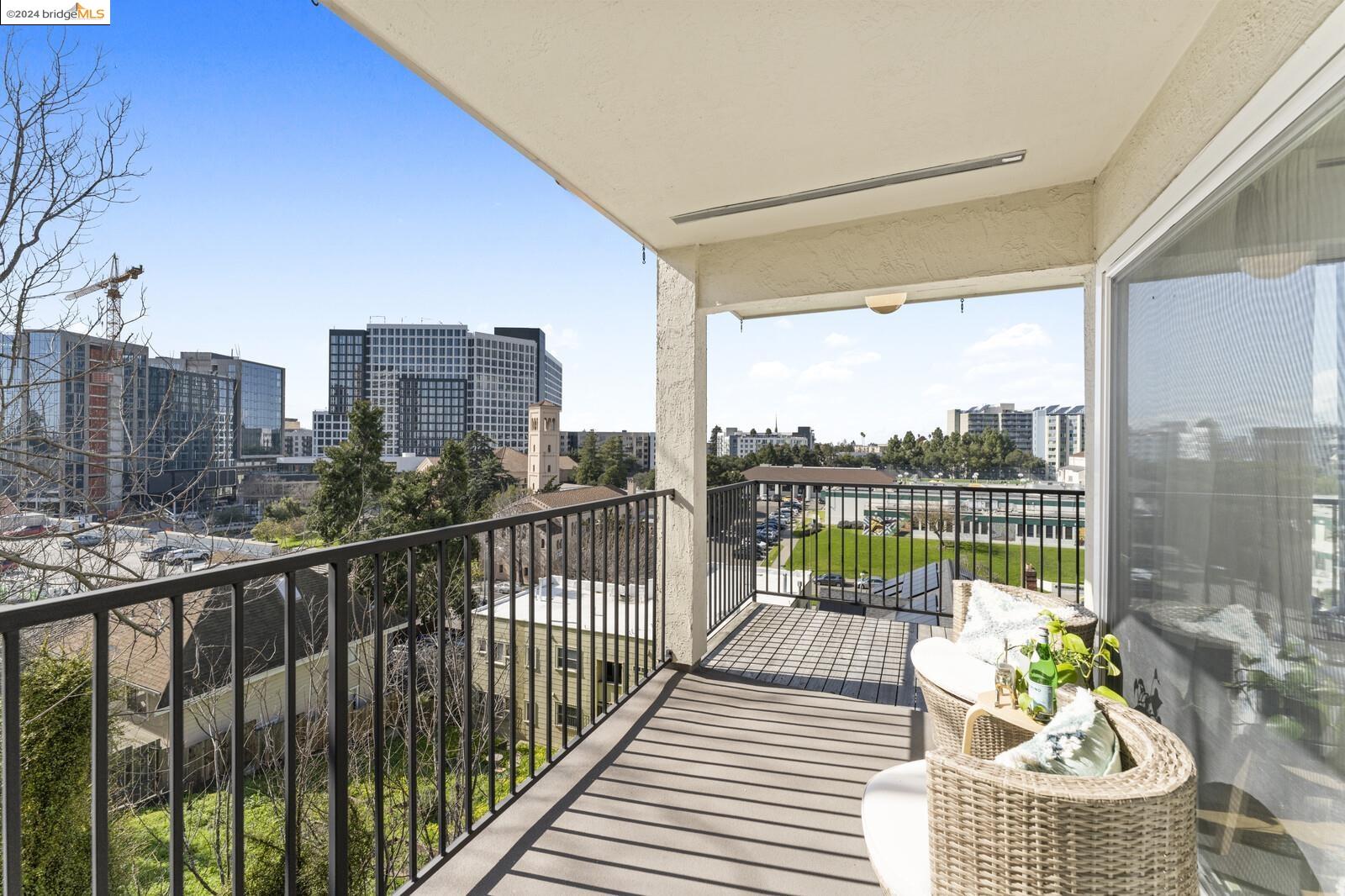 Light-filled and spacious, this corner unit Adams Point condo has been tastefully updated and awaits its new owners. Spend your evenings out on the expansive private balcony facing the sunset savoring the fantastic views of the city. The two bedroom two bathroom 1094 sqft unit is situated on the first floor at the back of the building with just one shared wall. With a bounty of natural light, updated kitchen and baths, and a seamless living/dining area that opens to the outdoor space, this home provides the perfect blend of comfort and style. The unit boasts new quartz countertops, new bathroom flooring and counters, new bedroom carpet, and a fresh coat of paint. The spacious primary bedroom is accompanied by an ensuite bathroom, while the second bedroom opens out to the balcony. Each floor has shared laundry and every unit has one parking spot in the enclosed garage. Enjoy all the benefits of living in the heart of Oakland, just minutes away from Lake Merritt, Whole Foods, BART and the abundance of local restaurants. Come take a look today!
