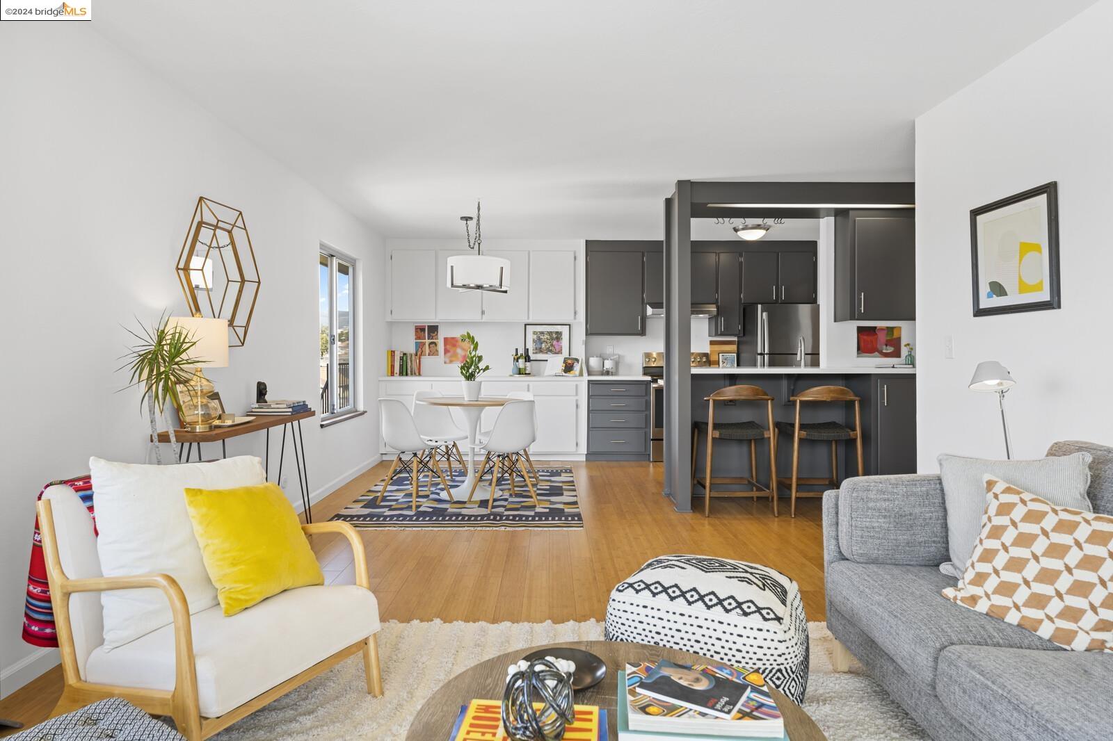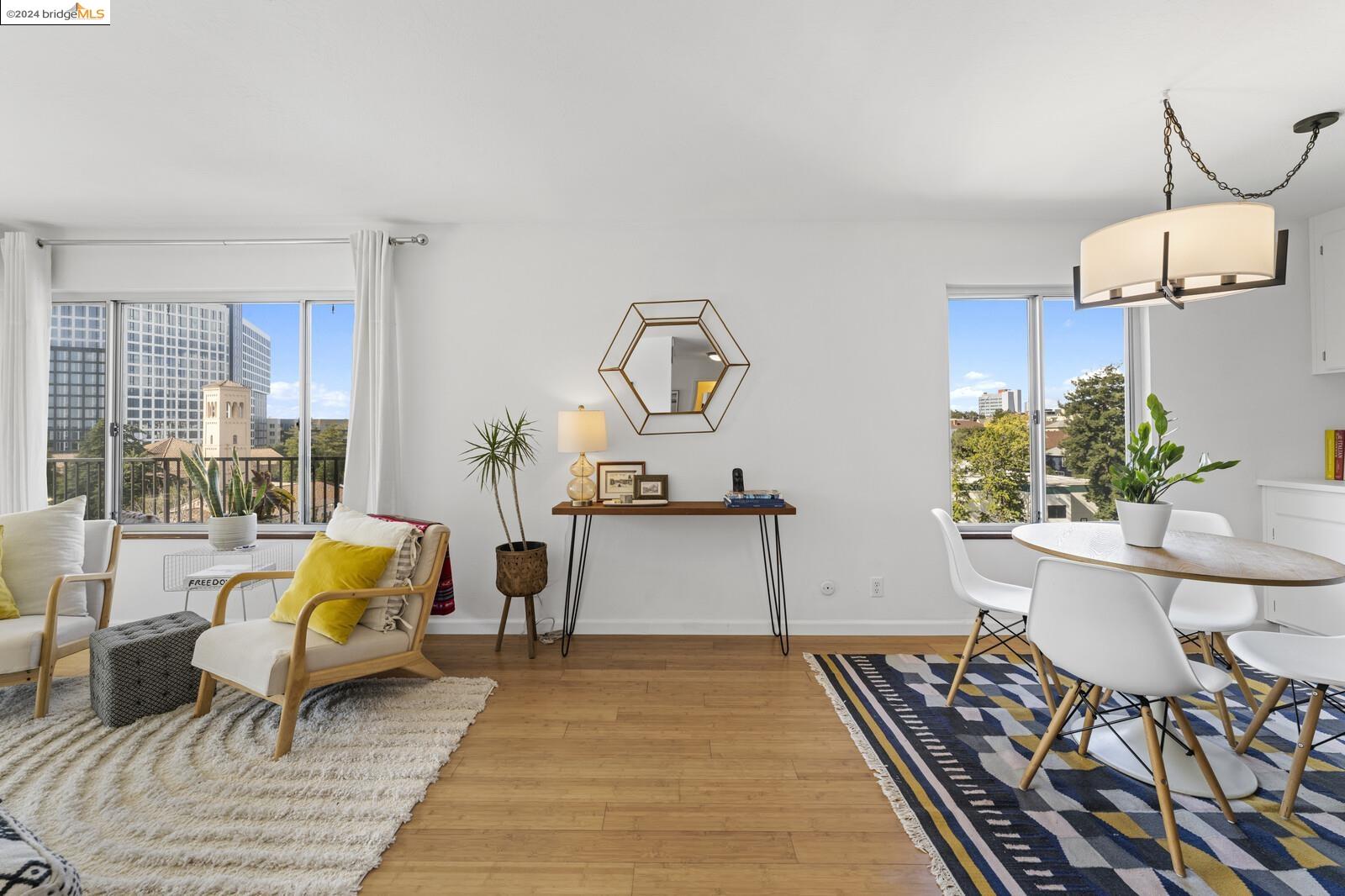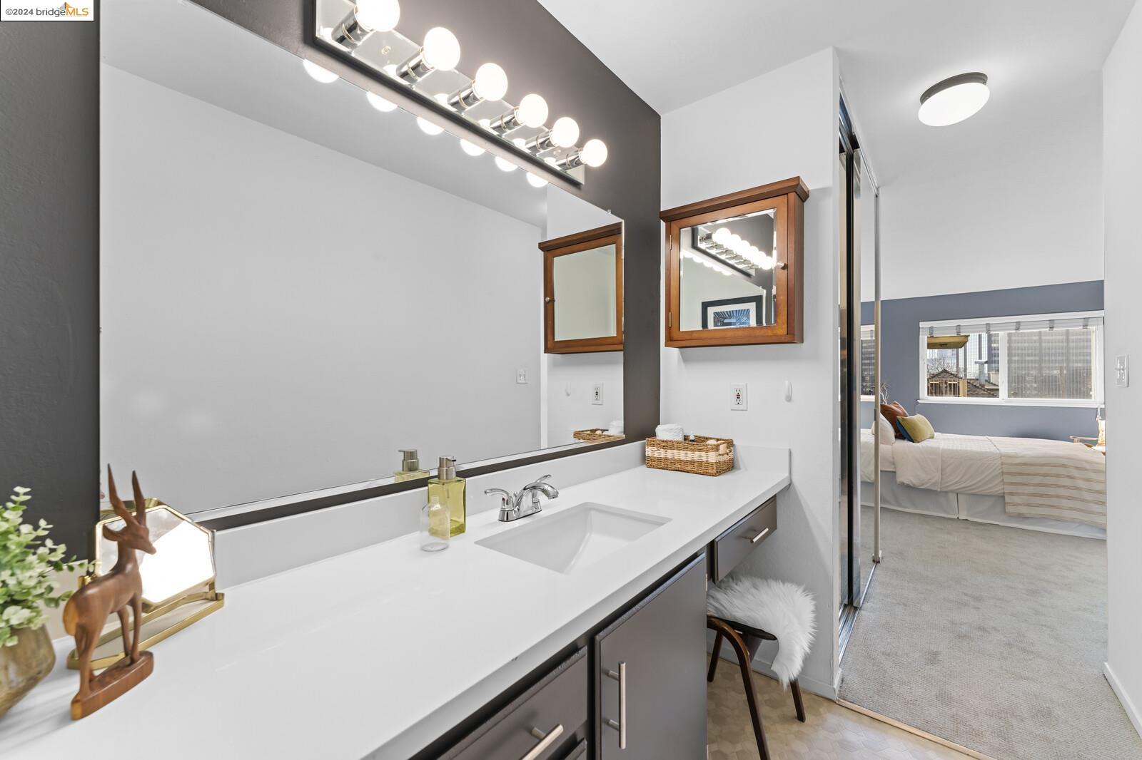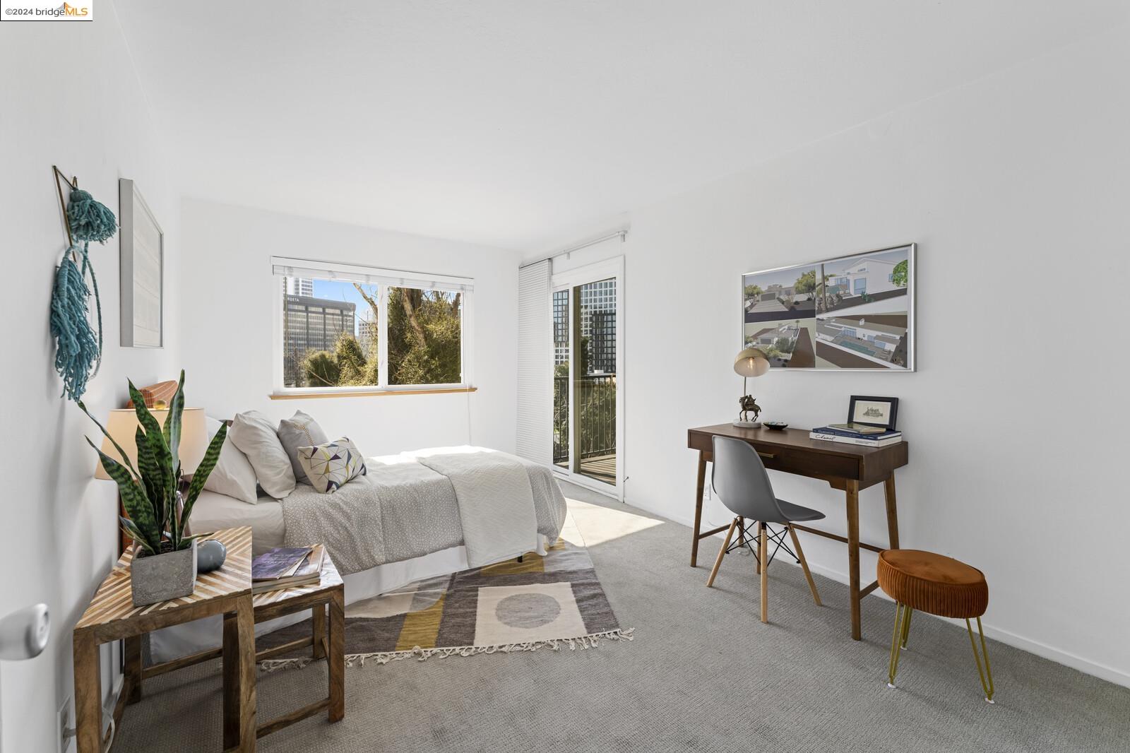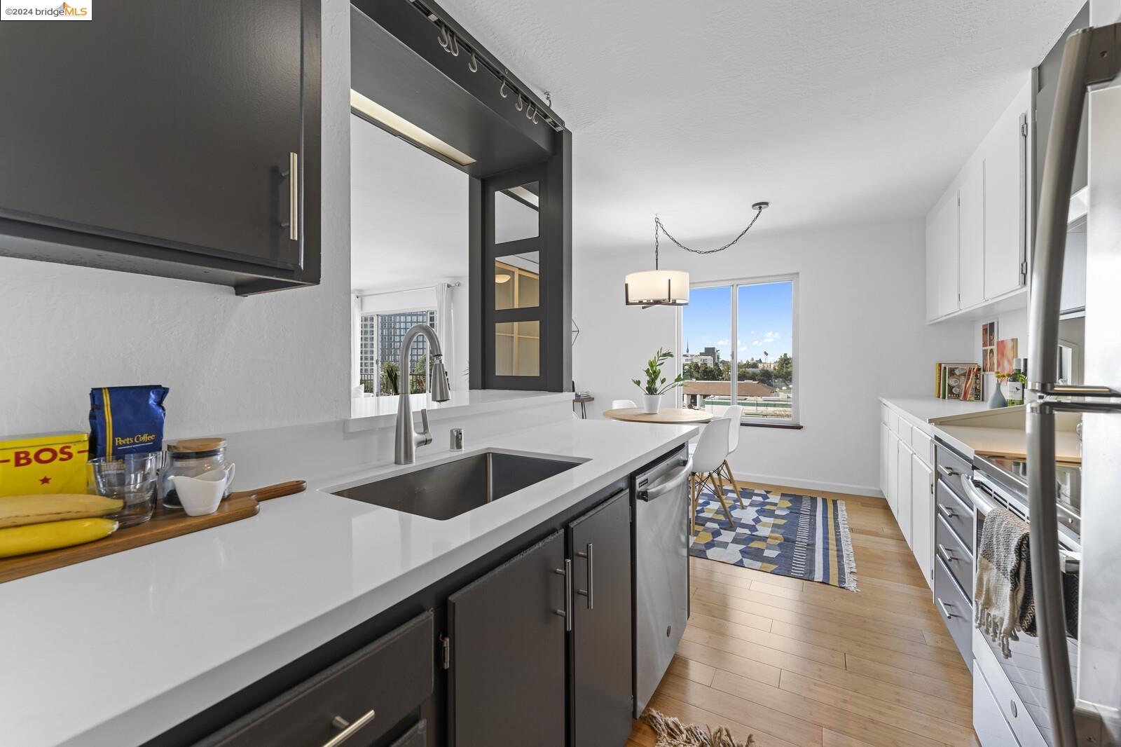 Light-filled and spacious, this corner unit Adams Point condo has been tastefully updated and awaits its new owners. Spend your evenings out on the expansive private balcony facing the sunset savoring the fantastic views of the city. The two bedroom two bathroom 1094 sqft unit is situated on the first floor at the back of the building with just one shared wall. With a bounty of natural light, updated kitchen and baths, and a seamless living/dining area that opens to the outdoor space, this home provides the perfect blend of comfort and style. The unit boasts new quartz countertops, new bathroom flooring and counters, new bedroom carpet, and a fresh coat of paint. The spacious primary bedroom is accompanied by an ensuite bathroom, while the second bedroom opens out to the balcony. Each floor has shared laundry and every unit has one parking spot in the enclosed garage. Enjoy all the benefits of living in the heart of Oakland, just minutes away from Lake Merritt, Whole Foods, BART and the abundance of local restaurants. Come take a look today!