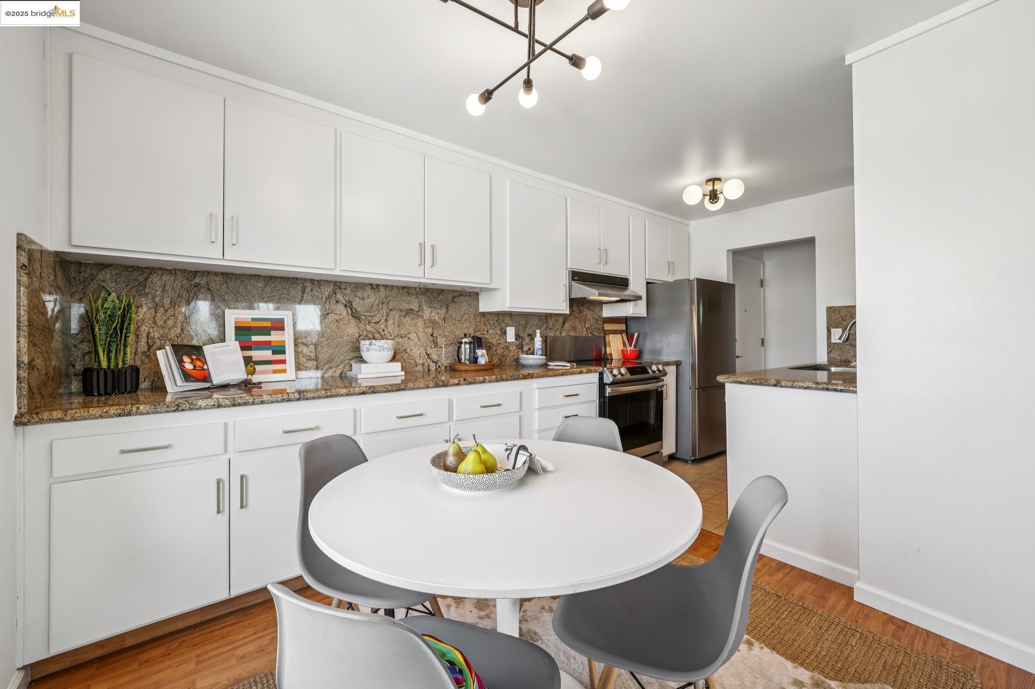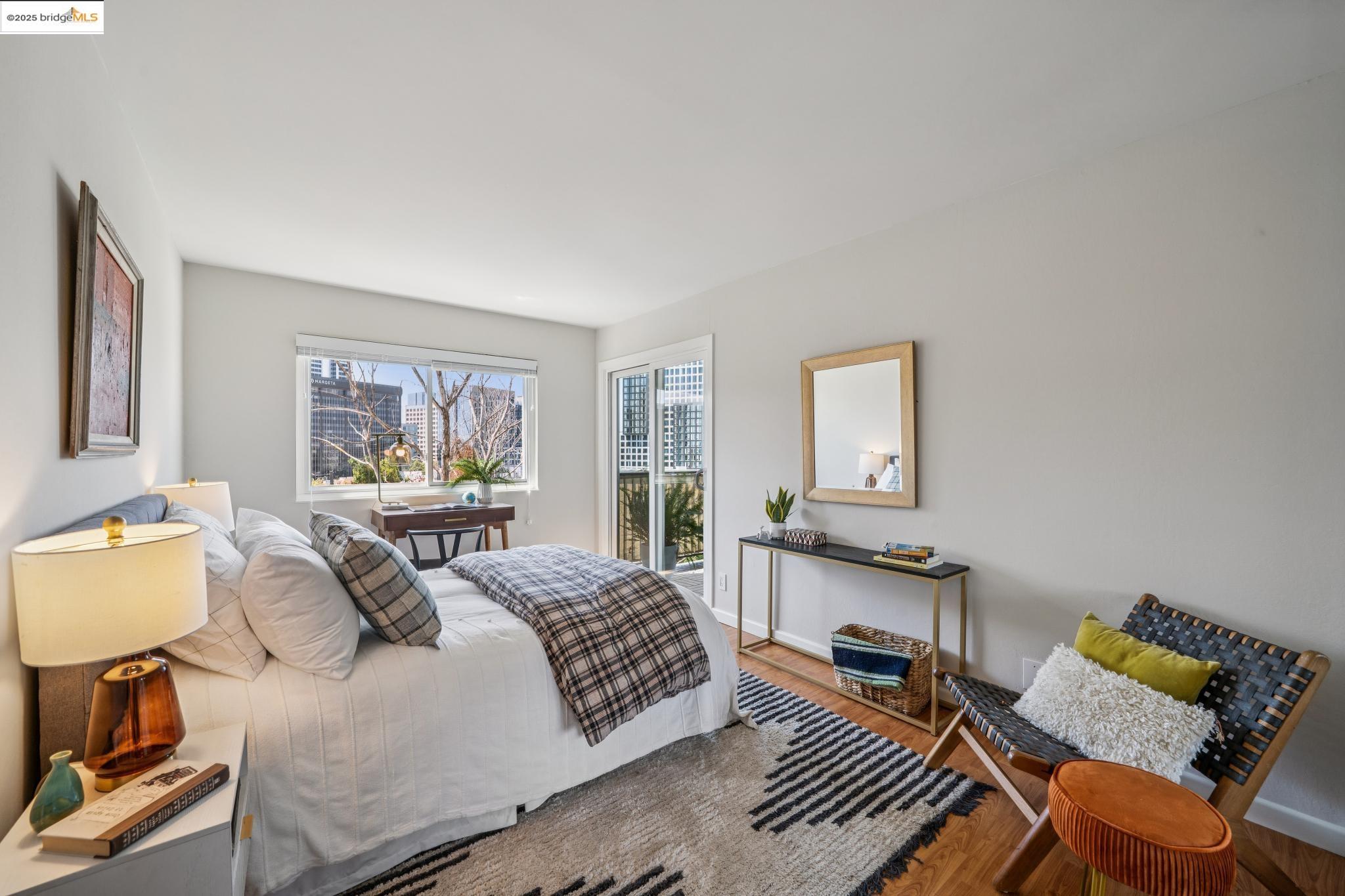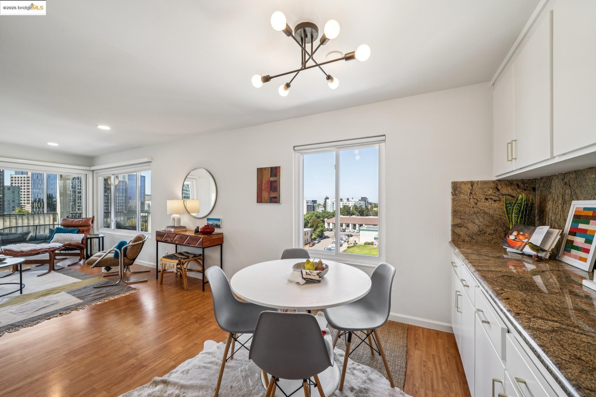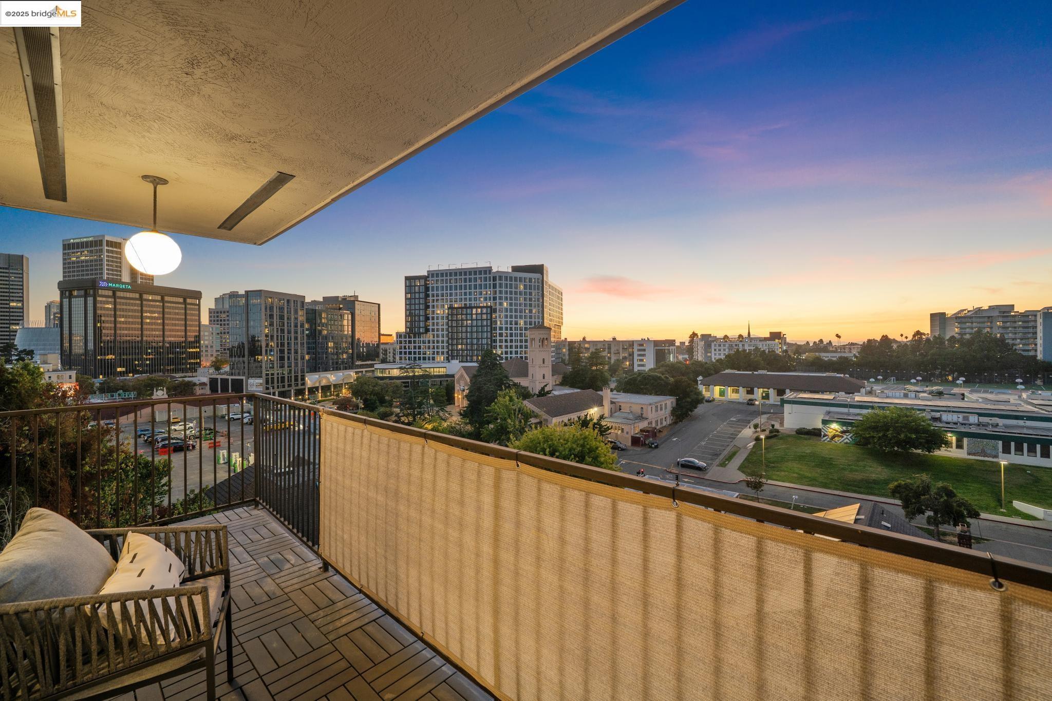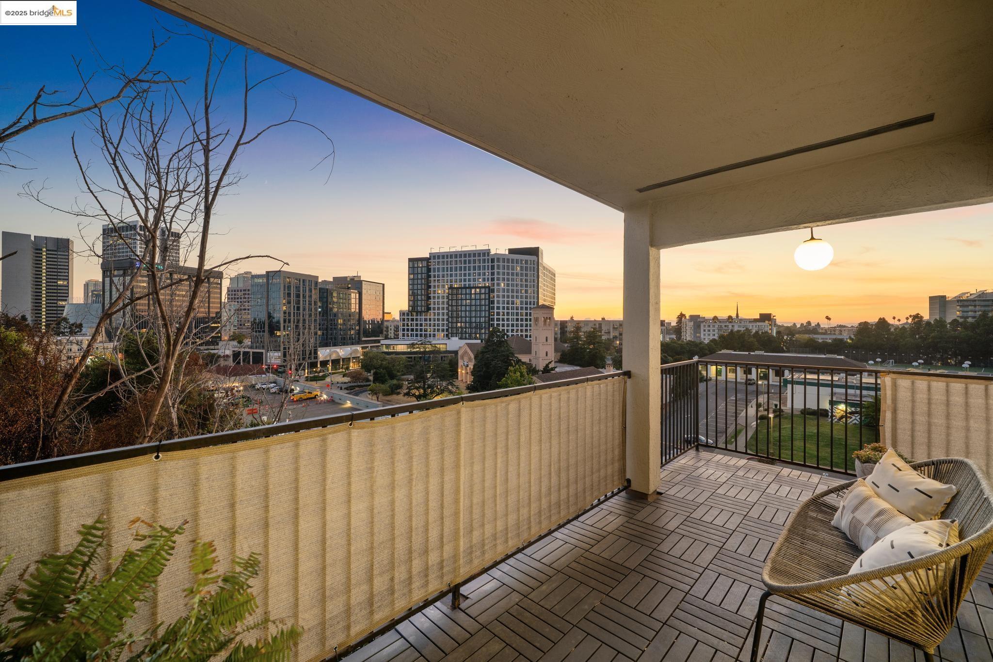 Welcome to 85 Vernon Street #208, a beautiful rear corner unit with captivating views and an oversized wraparound balcony in Adams Point. The living room invites you to unwind and enjoy the seamless flow from the dining area out to the balcony, the perfect place to host gatherings or enjoy quiet dinners. The kitchen is a chef's delight, featuring granite countertops, updated cabinetry, and an induction range. This serene private space offers commanding views of historic buildings, city lights, and lush trees, making it an ideal spot for your morning coffee or tea, or evening relaxation as the sun sets over the city. The spacious primary suite is a comforting haven with two closets and an updated bathroom. A bright second bedroom with direct balcony access further accentuates the indoor-outdoor living experience. Additional storage spaces maximize comfort and functionality. The solar-powered building underscores a commitment to sustainability and includes secure parking, two elevators, and intercom access. Minutes from Lake Merritt, you're at the center of one of Oakland's most desirable neighborhoods. Whole Foods, Grand Lake Farmers Market, local shops, and easy BART and freeway access make travel throughout the Bay Area effortless. Your new chapter awaits!
