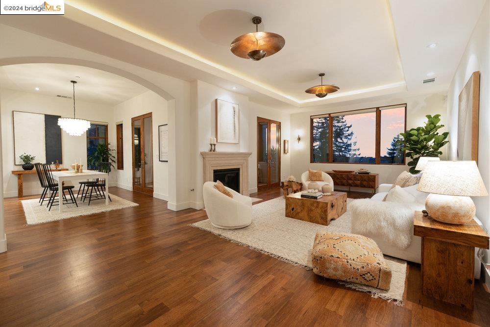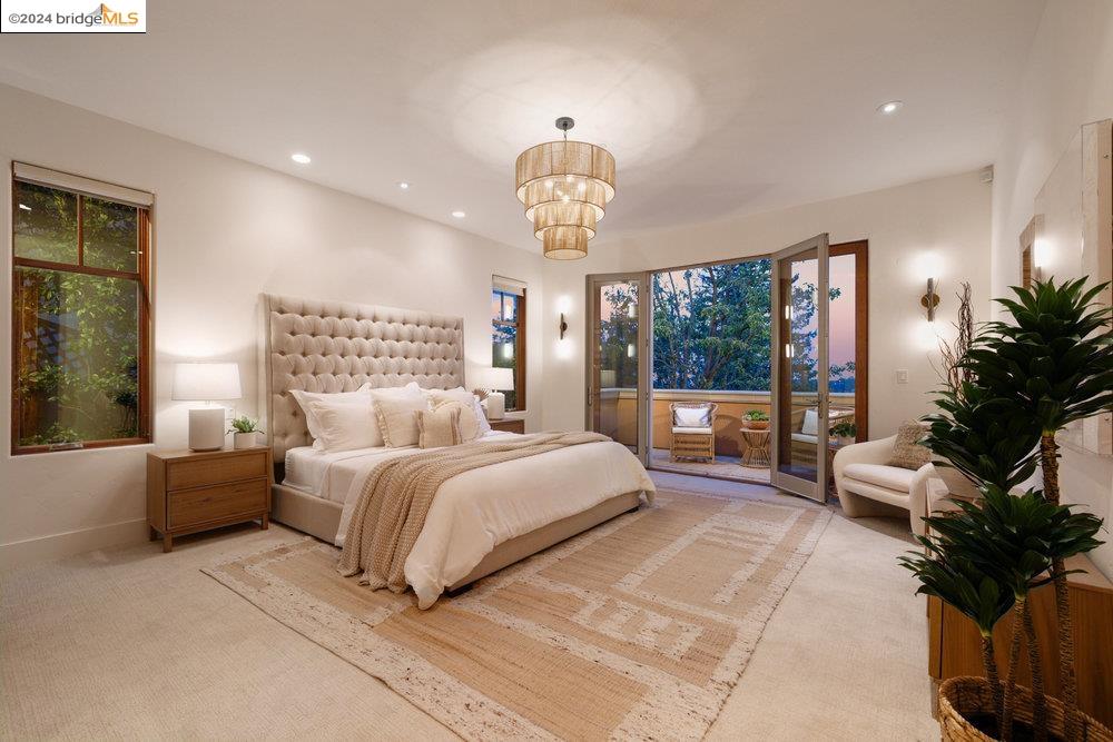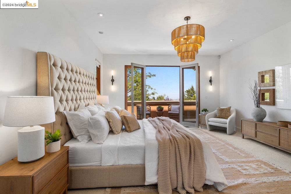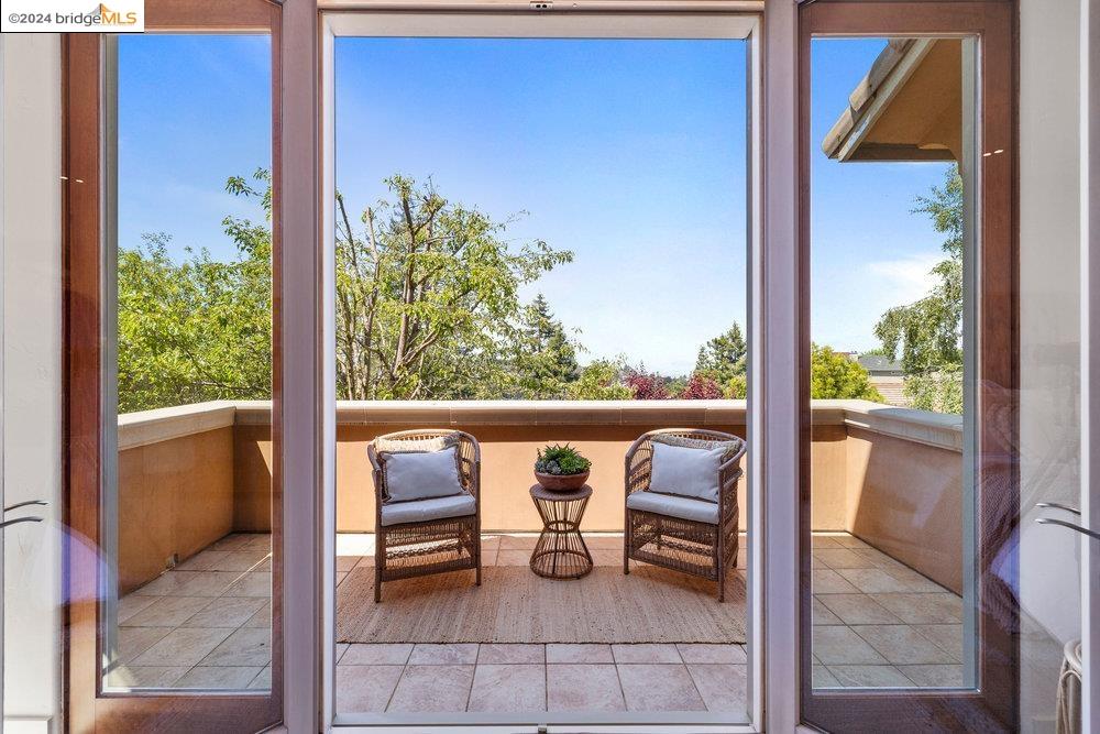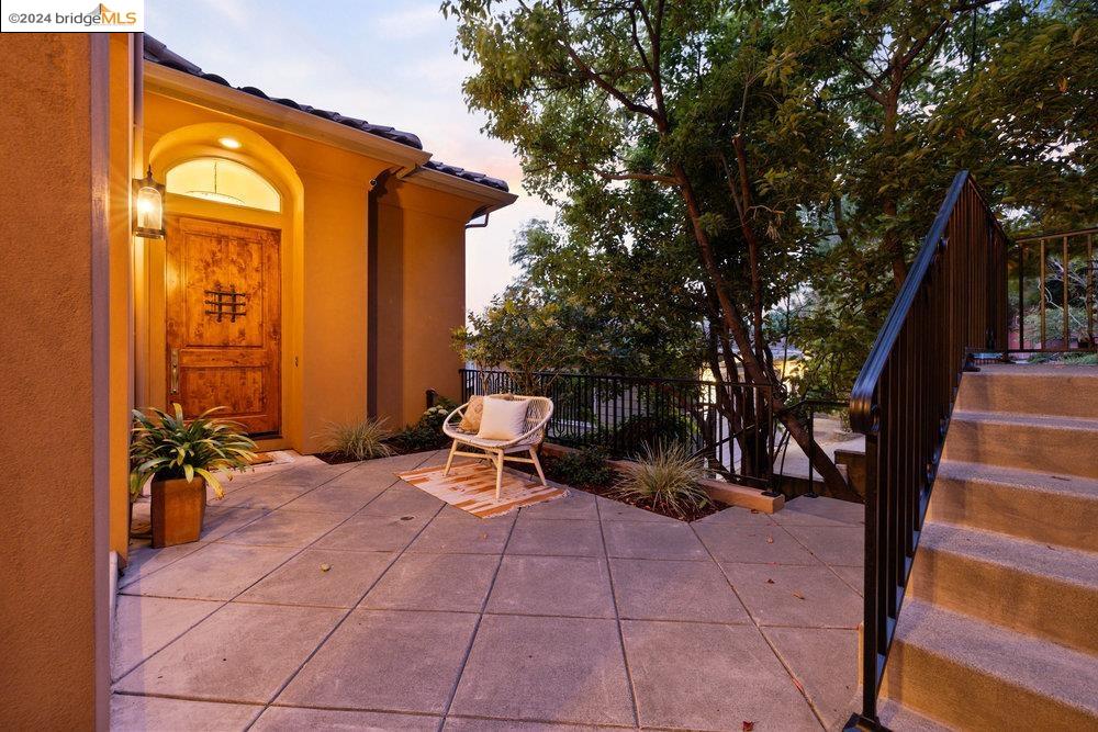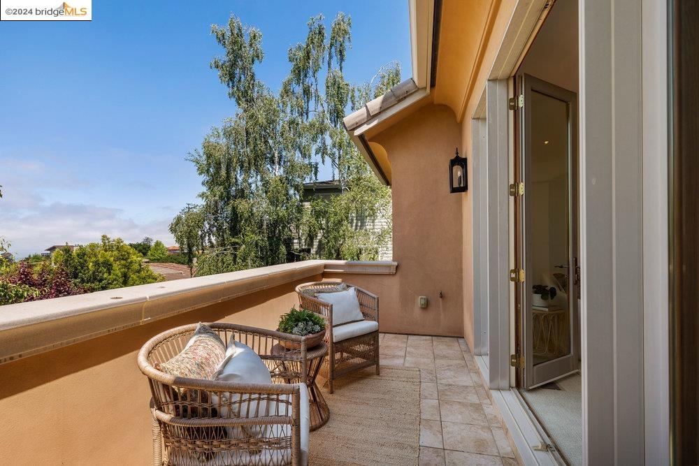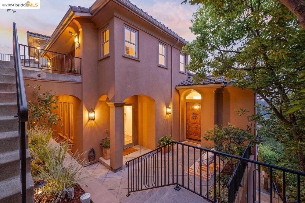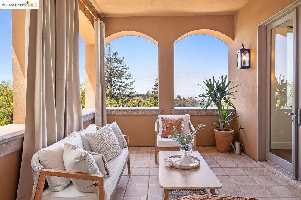 This romantic Montclair Mediterranean welcomes you with enchanting architectural lines and high-end finishes. Warm wood windows and patio doors frame expansive San Francisco Bay and Golden Gate Bridge views. Arched doorways and tray ceilings add interest to the open, airy rooms. Accessible from both the living room and breakfast room, a dreamy loggia offers an outdoor fireplace for entertaining for excellent indoor-outdoor flow. The chef's kitchen is a true delight with honed Taj Mahal quartzite counters, 6-burner Wolf range, Subzero refrigerator, wine fridge, and warming drawer. Just behind the kitchen is a spacious formal dining room with an attached wine room and glass doors leading to the front patio. The lower levels feature four bedrooms and three full bathrooms, including a large primary suite with a private deck for relaxing, night or day. Working from home will never grow old from the home office with a spectacular view and beautiful divided-lite glass doors. A light-filled family room flows nicely to a grassy yard and garden. Additional features of the home include an attached 2-car garage, solar panels, electric car charger, Nest thermostats and exterior cameras, hardwired ethernet, and air conditioning on the main floor. This fine home awaits your arrival.