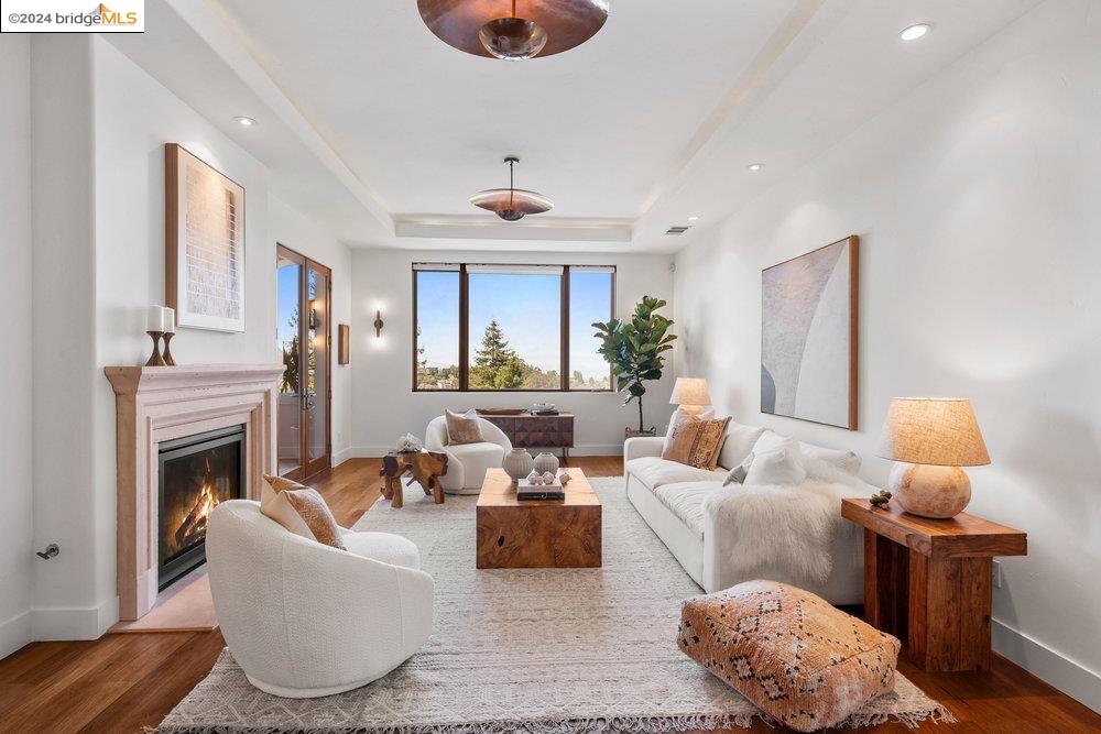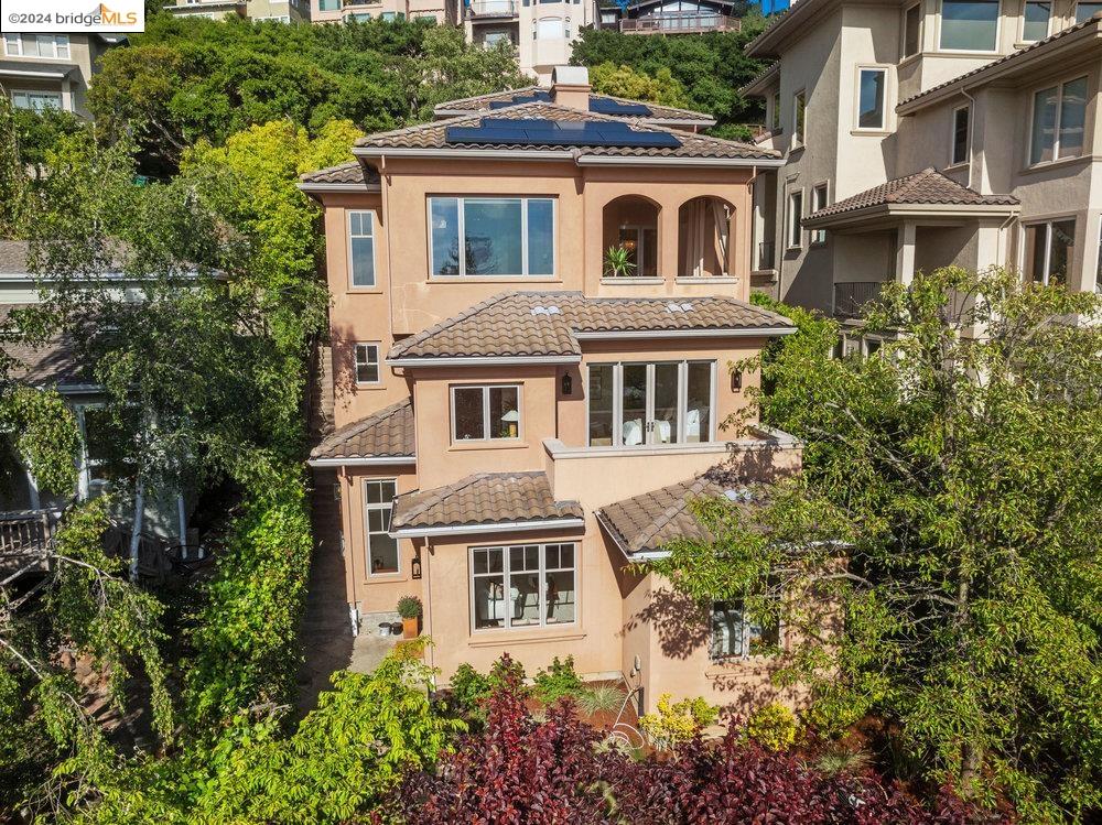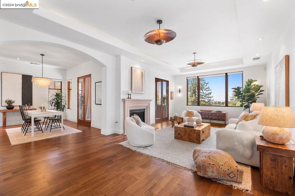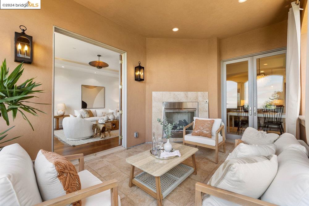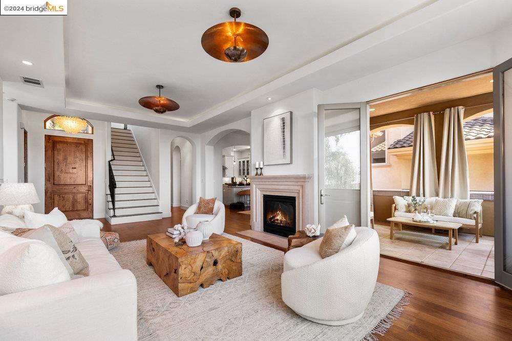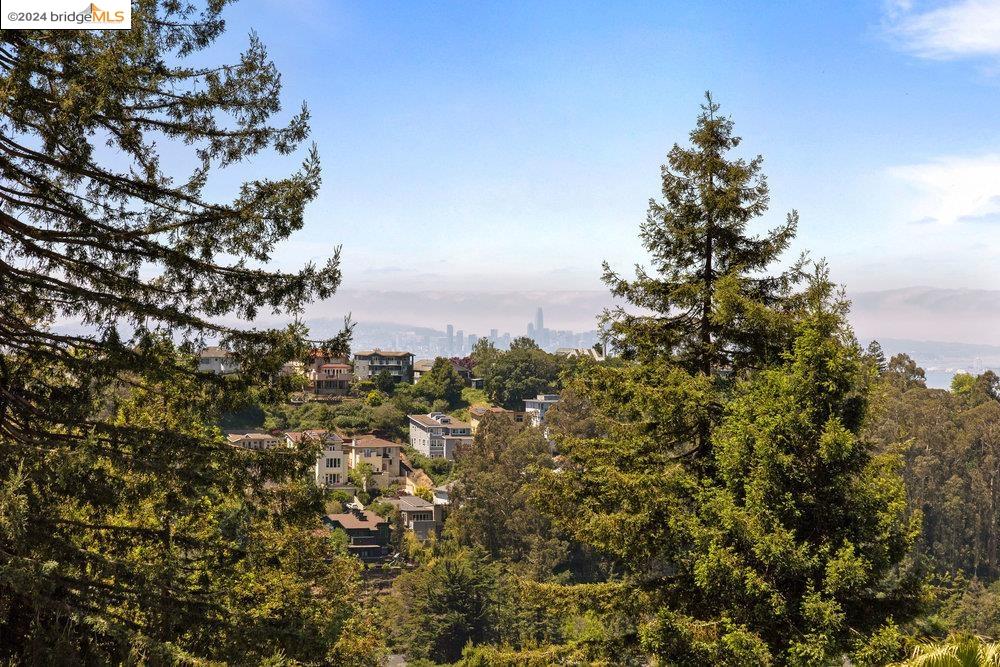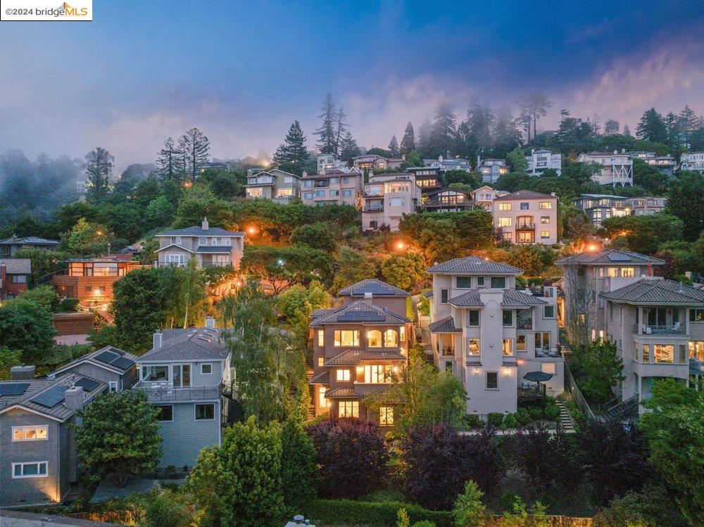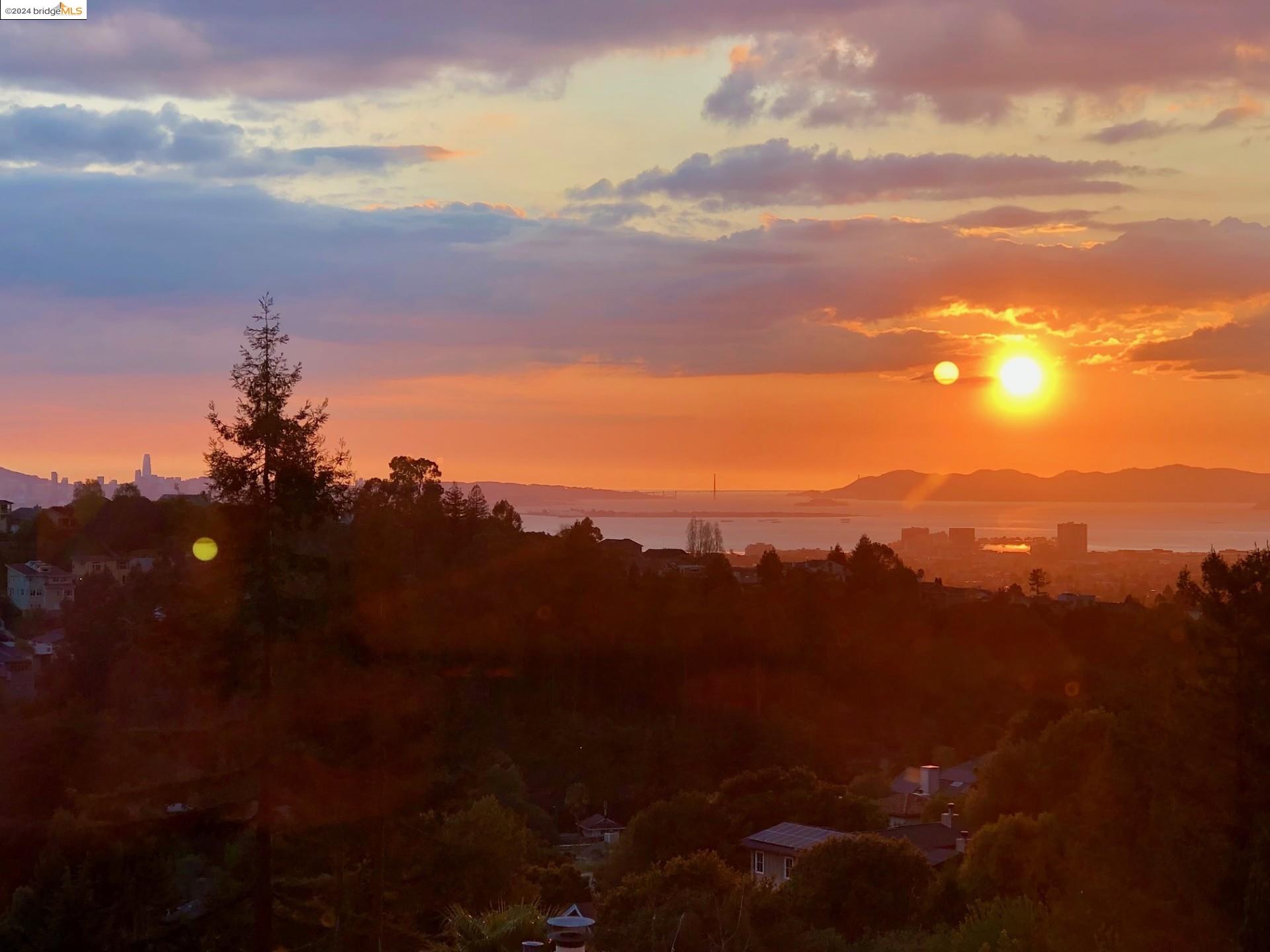 This romantic Montclair Mediterranean welcomes you with enchanting architectural lines and high-end finishes. Warm wood windows and patio doors frame expansive San Francisco Bay and Golden Gate Bridge views. Arched doorways and tray ceilings add interest to the open, airy rooms. Accessible from both the living room and breakfast room, a dreamy loggia offers an outdoor fireplace for entertaining for excellent indoor-outdoor flow. The chef's kitchen is a true delight with honed Taj Mahal quartzite counters, 6-burner Wolf range, Subzero refrigerator, wine fridge, and warming drawer. Just behind the kitchen is a spacious formal dining room with an attached wine room and glass doors leading to the front patio. The lower levels feature four bedrooms and three full bathrooms, including a large primary suite with a private deck for relaxing, night or day. Working from home will never grow old from the home office with a spectacular view and beautiful divided-lite glass doors. A light-filled family room flows nicely to a grassy yard and garden. Additional features of the home include an attached 2-car garage, solar panels, electric car charger, Nest thermostats and exterior cameras, hardwired ethernet, and air conditioning on the main floor. This fine home awaits your arrival.