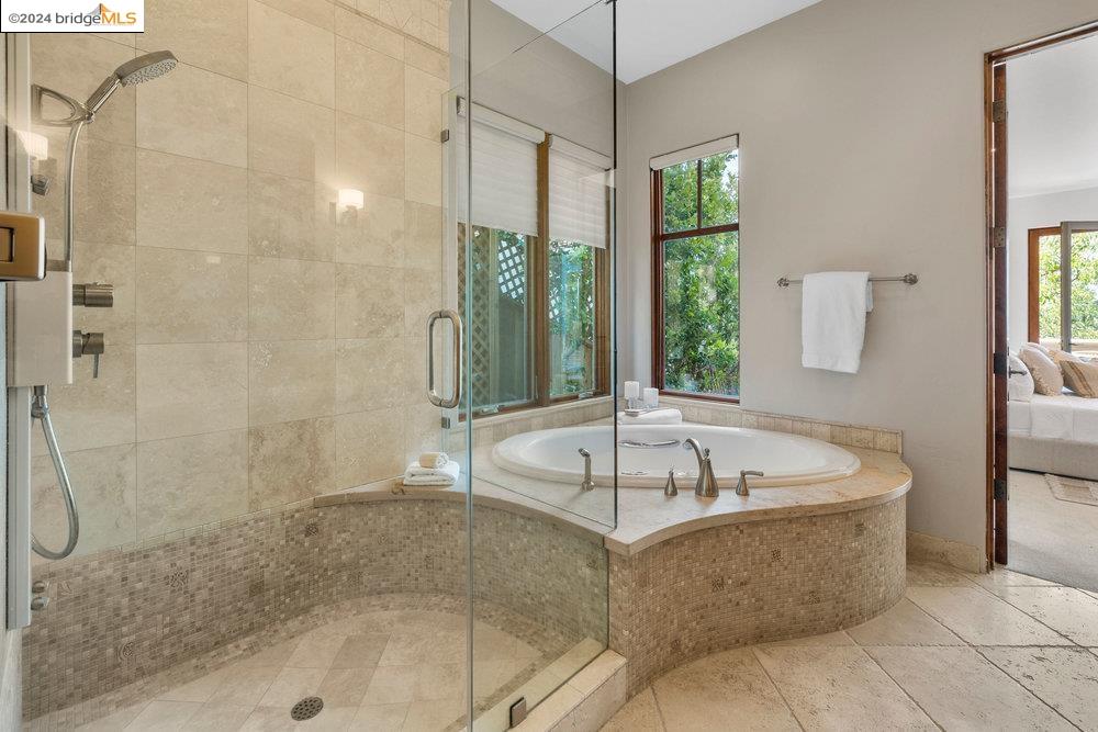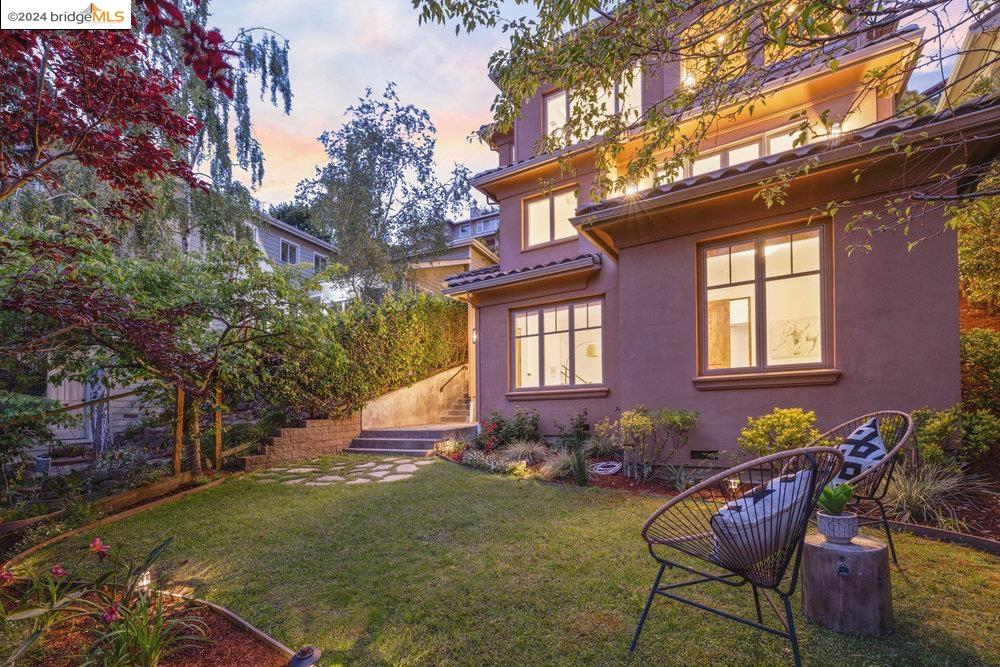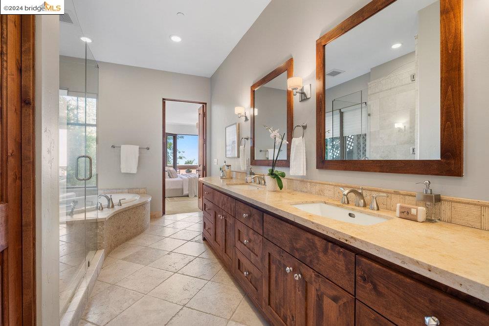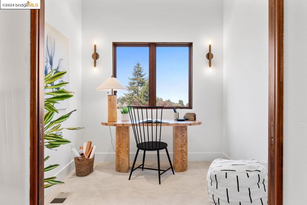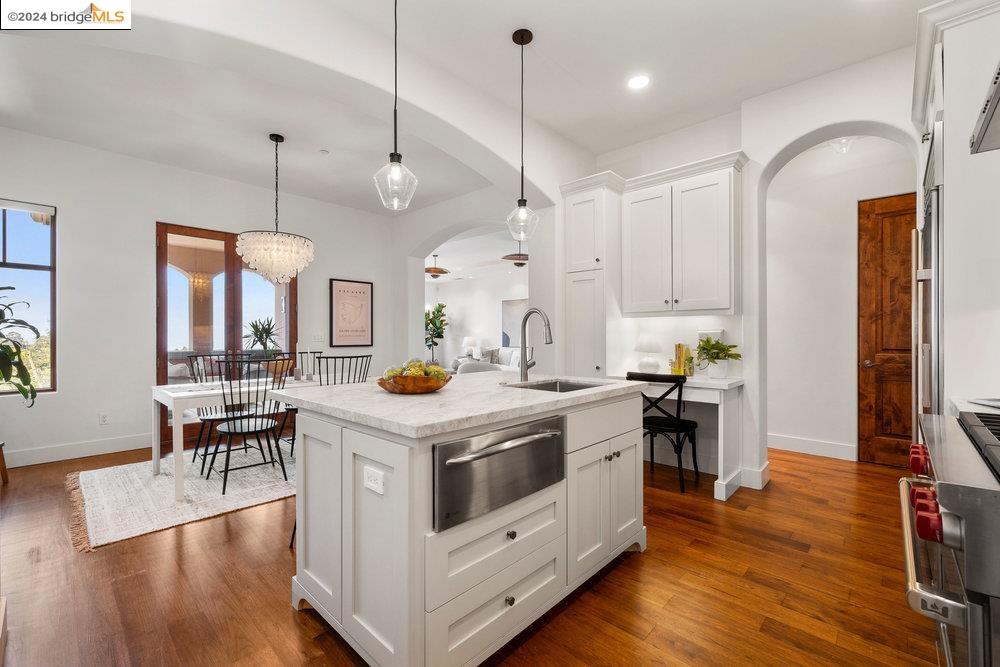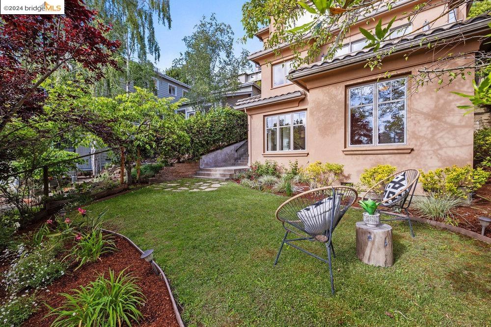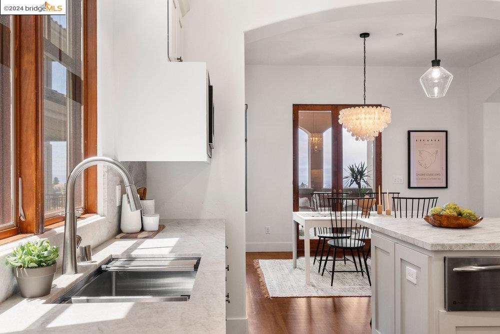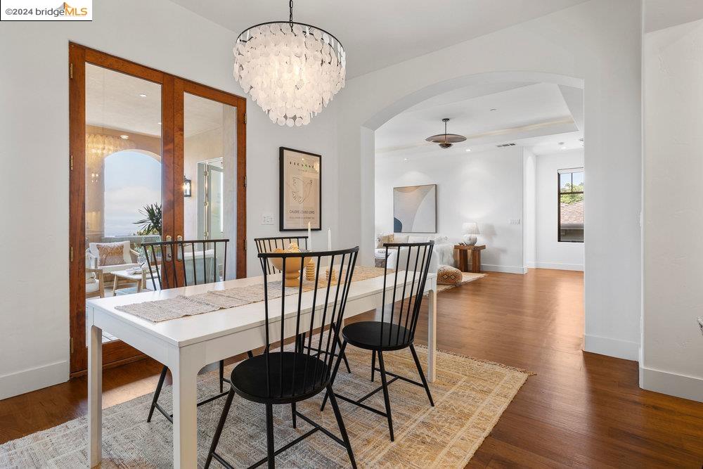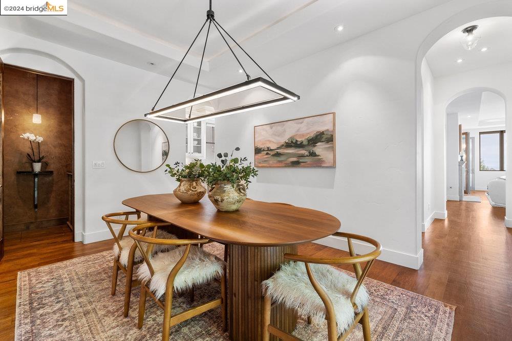 This romantic Montclair Mediterranean welcomes you with enchanting architectural lines and high-end finishes. Warm wood windows and patio doors frame expansive San Francisco Bay and Golden Gate Bridge views. Arched doorways and tray ceilings add interest to the open, airy rooms. Accessible from both the living room and breakfast room, a dreamy loggia offers an outdoor fireplace for entertaining for excellent indoor-outdoor flow. The chef's kitchen is a true delight with honed Taj Mahal quartzite counters, 6-burner Wolf range, Subzero refrigerator, wine fridge, and warming drawer. Just behind the kitchen is a spacious formal dining room with an attached wine room and glass doors leading to the front patio. The lower levels feature four bedrooms and three full bathrooms, including a large primary suite with a private deck for relaxing, night or day. Working from home will never grow old from the home office with a spectacular view and beautiful divided-lite glass doors. A light-filled family room flows nicely to a grassy yard and garden. Additional features of the home include an attached 2-car garage, solar panels, electric car charger, Nest thermostats and exterior cameras, hardwired ethernet, and air conditioning on the main floor. This fine home awaits your arrival.