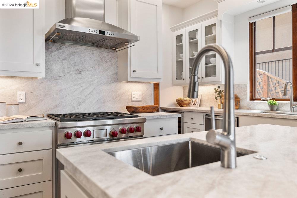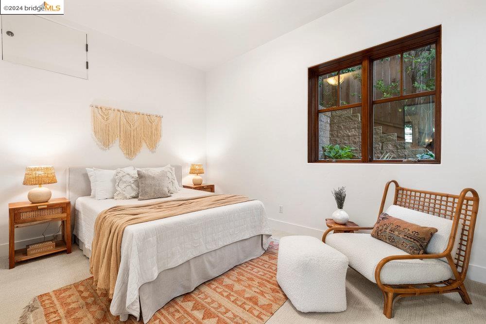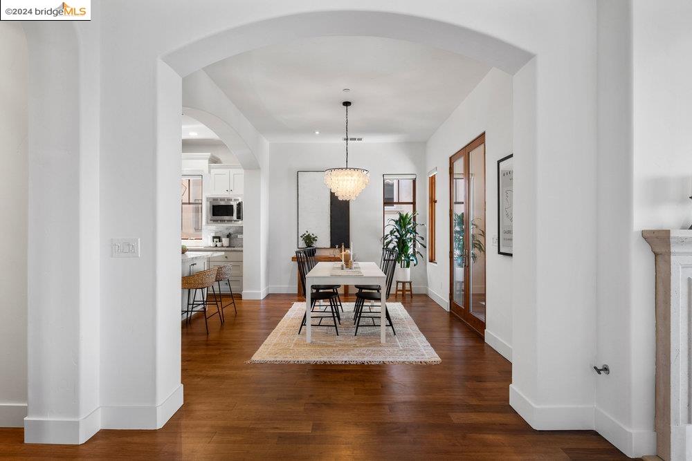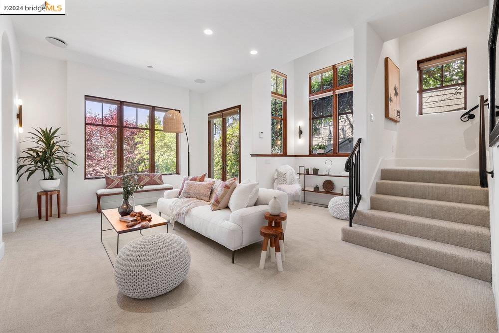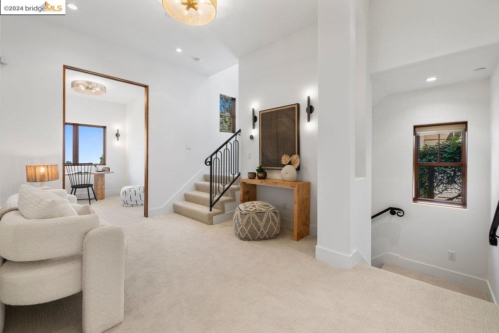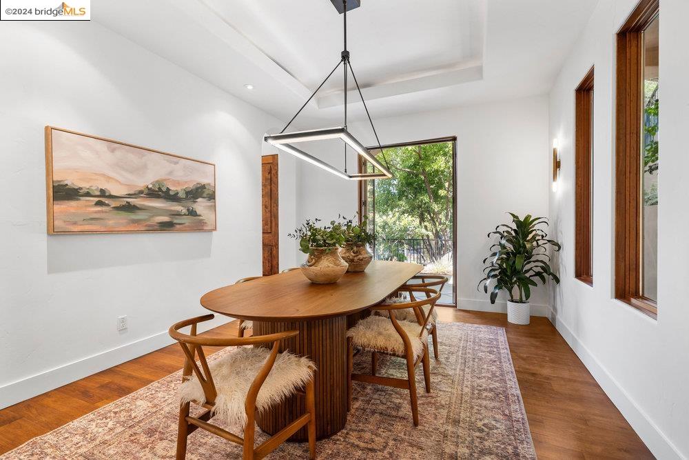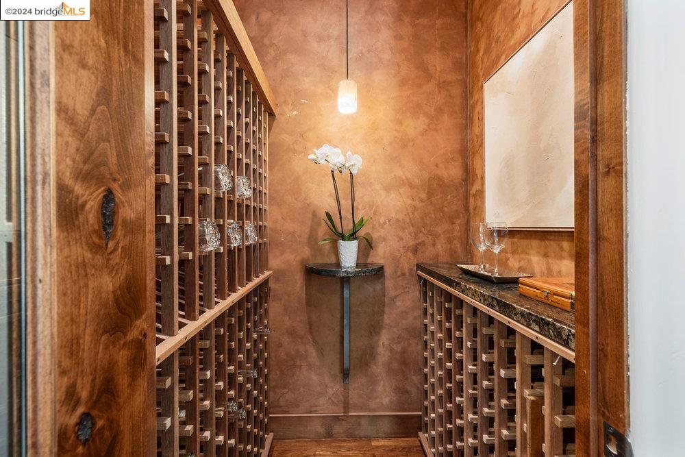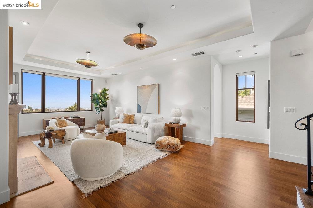 This romantic Montclair Mediterranean welcomes you with enchanting architectural lines and high-end finishes. Warm wood windows and patio doors frame expansive San Francisco Bay and Golden Gate Bridge views. Arched doorways and tray ceilings add interest to the open, airy rooms. Accessible from both the living room and breakfast room, a dreamy loggia offers an outdoor fireplace for entertaining for excellent indoor-outdoor flow. The chef's kitchen is a true delight with honed Taj Mahal quartzite counters, 6-burner Wolf range, Subzero refrigerator, wine fridge, and warming drawer. Just behind the kitchen is a spacious formal dining room with an attached wine room and glass doors leading to the front patio. The lower levels feature four bedrooms and three full bathrooms, including a large primary suite with a private deck for relaxing, night or day. Working from home will never grow old from the home office with a spectacular view and beautiful divided-lite glass doors. A light-filled family room flows nicely to a grassy yard and garden. Additional features of the home include an attached 2-car garage, solar panels, electric car charger, Nest thermostats and exterior cameras, hardwired ethernet, and air conditioning on the main floor. This fine home awaits your arrival.