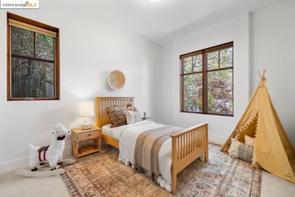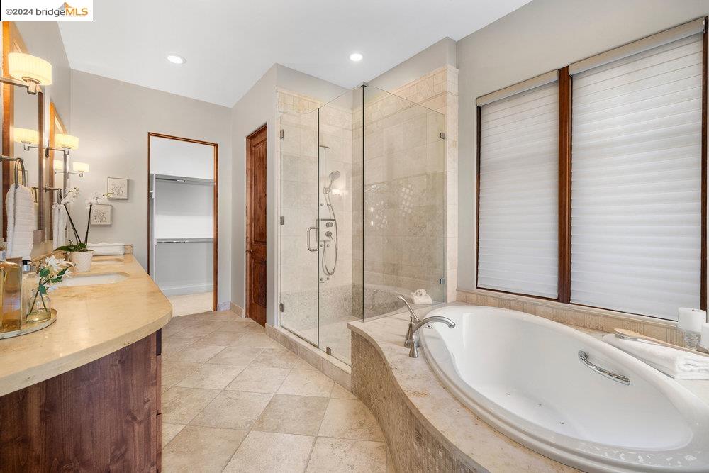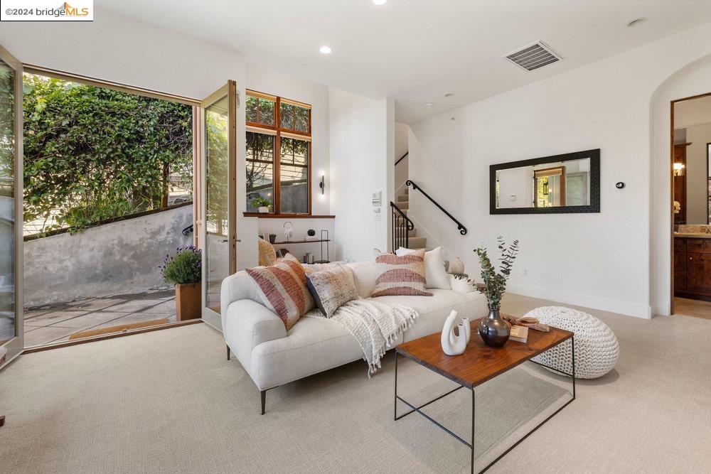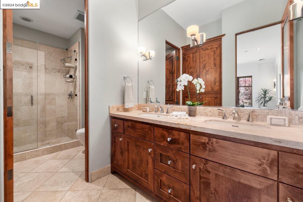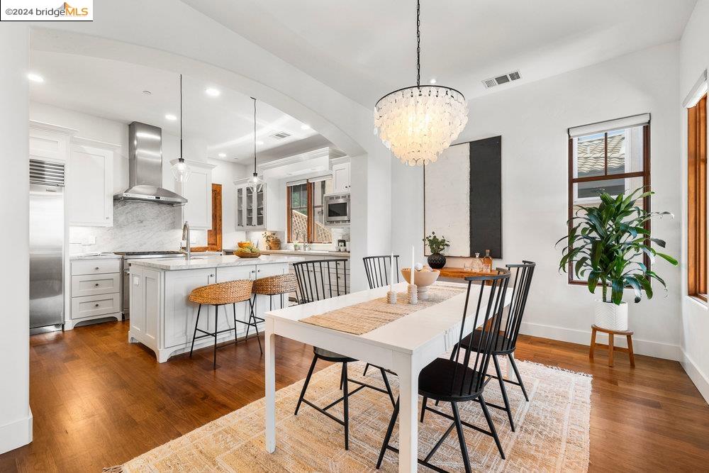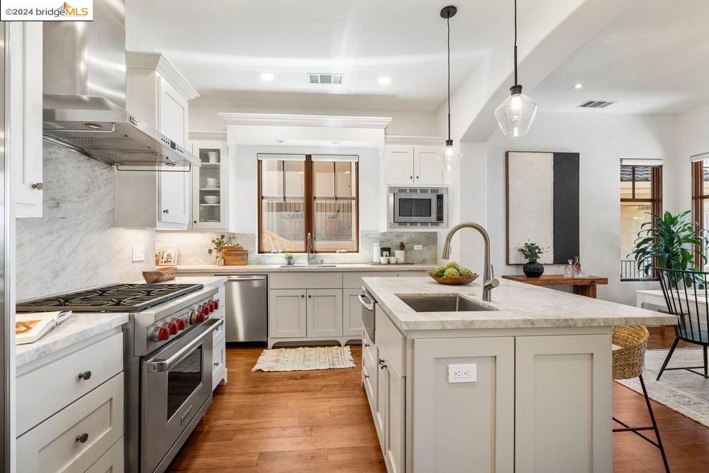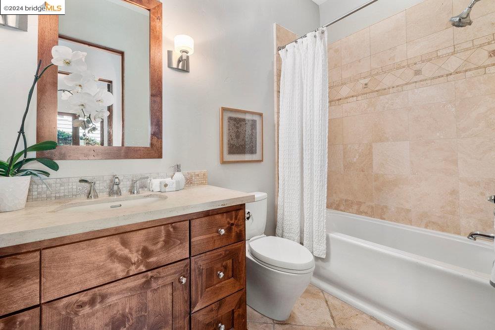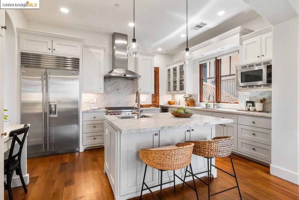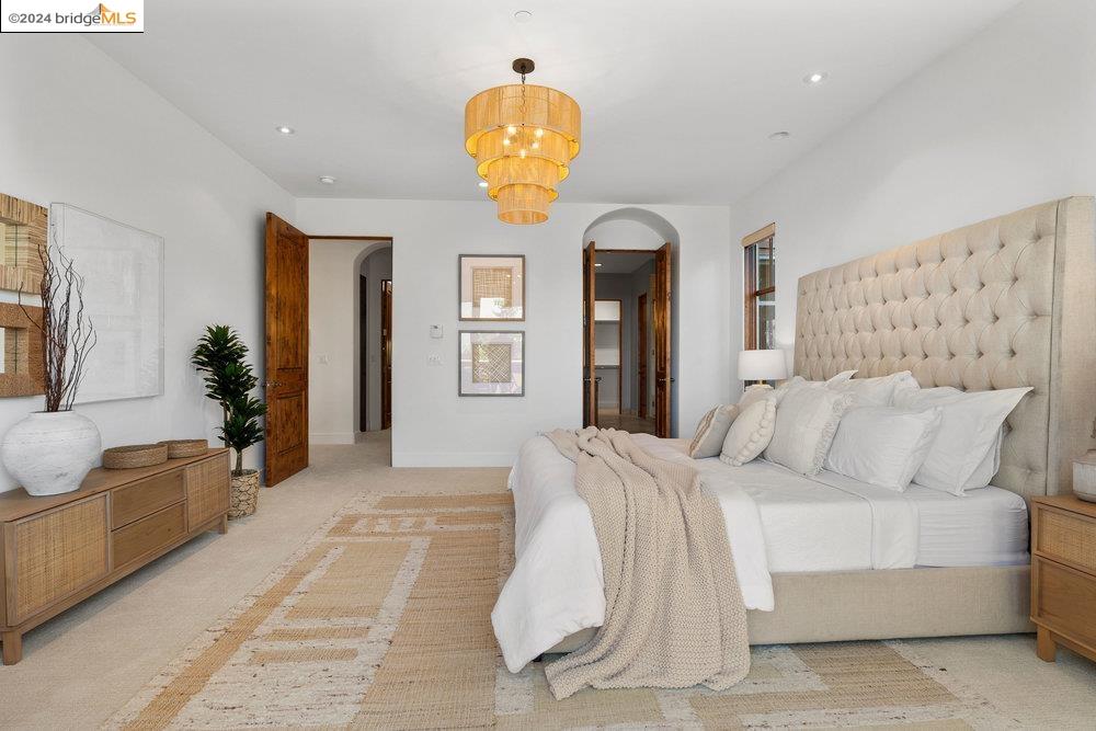 This romantic Montclair Mediterranean welcomes you with enchanting architectural lines and high-end finishes. Warm wood windows and patio doors frame expansive San Francisco Bay and Golden Gate Bridge views. Arched doorways and tray ceilings add interest to the open, airy rooms. Accessible from both the living room and breakfast room, a dreamy loggia offers an outdoor fireplace for entertaining for excellent indoor-outdoor flow. The chef's kitchen is a true delight with honed Taj Mahal quartzite counters, 6-burner Wolf range, Subzero refrigerator, wine fridge, and warming drawer. Just behind the kitchen is a spacious formal dining room with an attached wine room and glass doors leading to the front patio. The lower levels feature four bedrooms and three full bathrooms, including a large primary suite with a private deck for relaxing, night or day. Working from home will never grow old from the home office with a spectacular view and beautiful divided-lite glass doors. A light-filled family room flows nicely to a grassy yard and garden. Additional features of the home include an attached 2-car garage, solar panels, electric car charger, Nest thermostats and exterior cameras, hardwired ethernet, and air conditioning on the main floor. This fine home awaits your arrival.